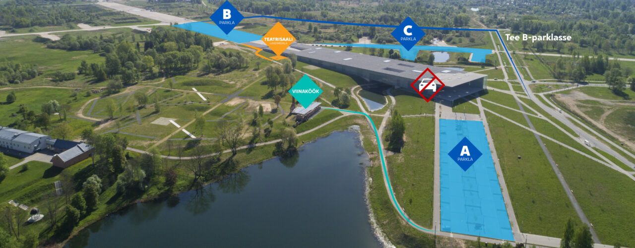 A parkla asub muuseumi peasissepääsu juures, B parkla asub muuseumi teisel pool ja C parkla asub maja küljel.