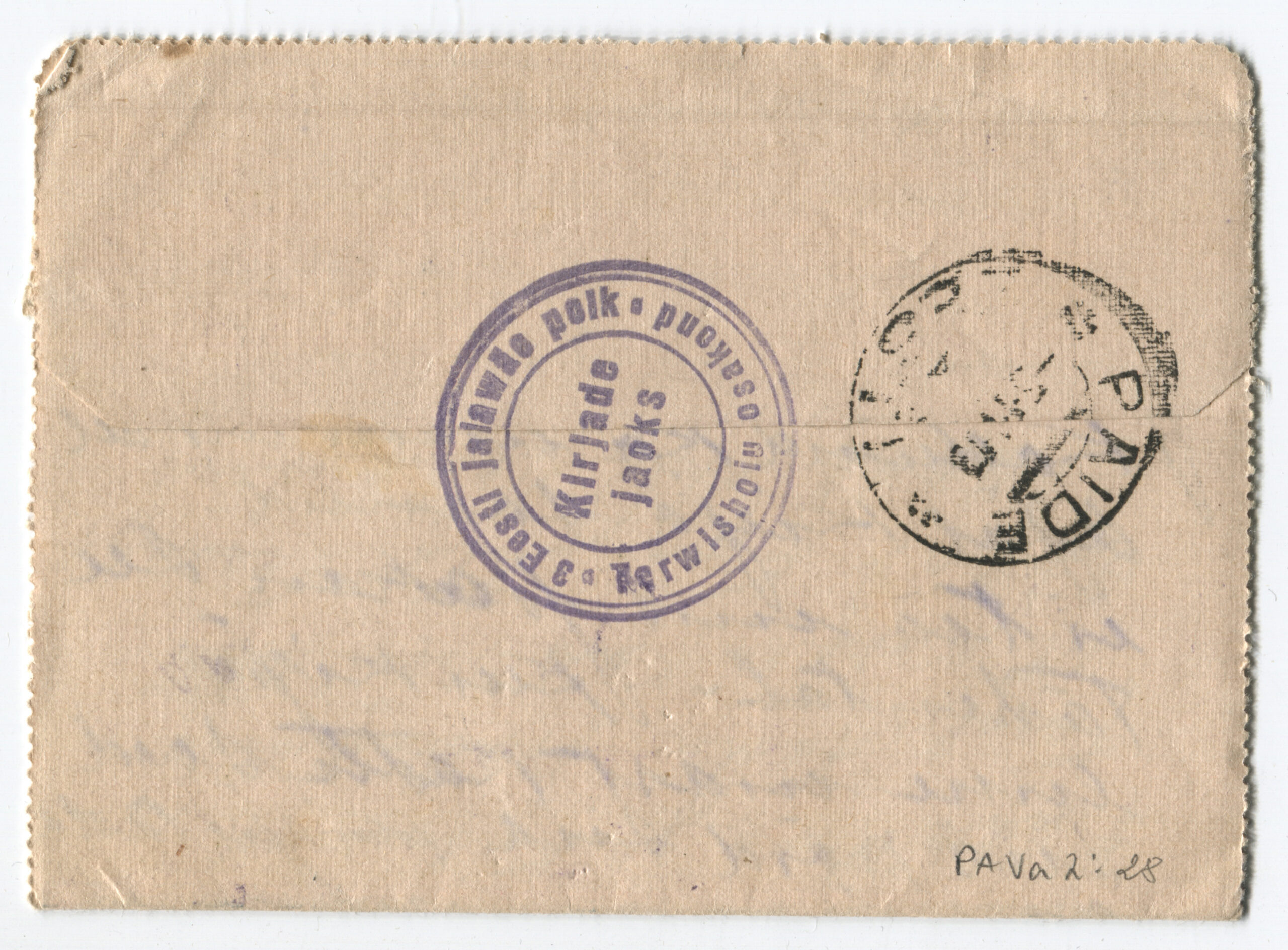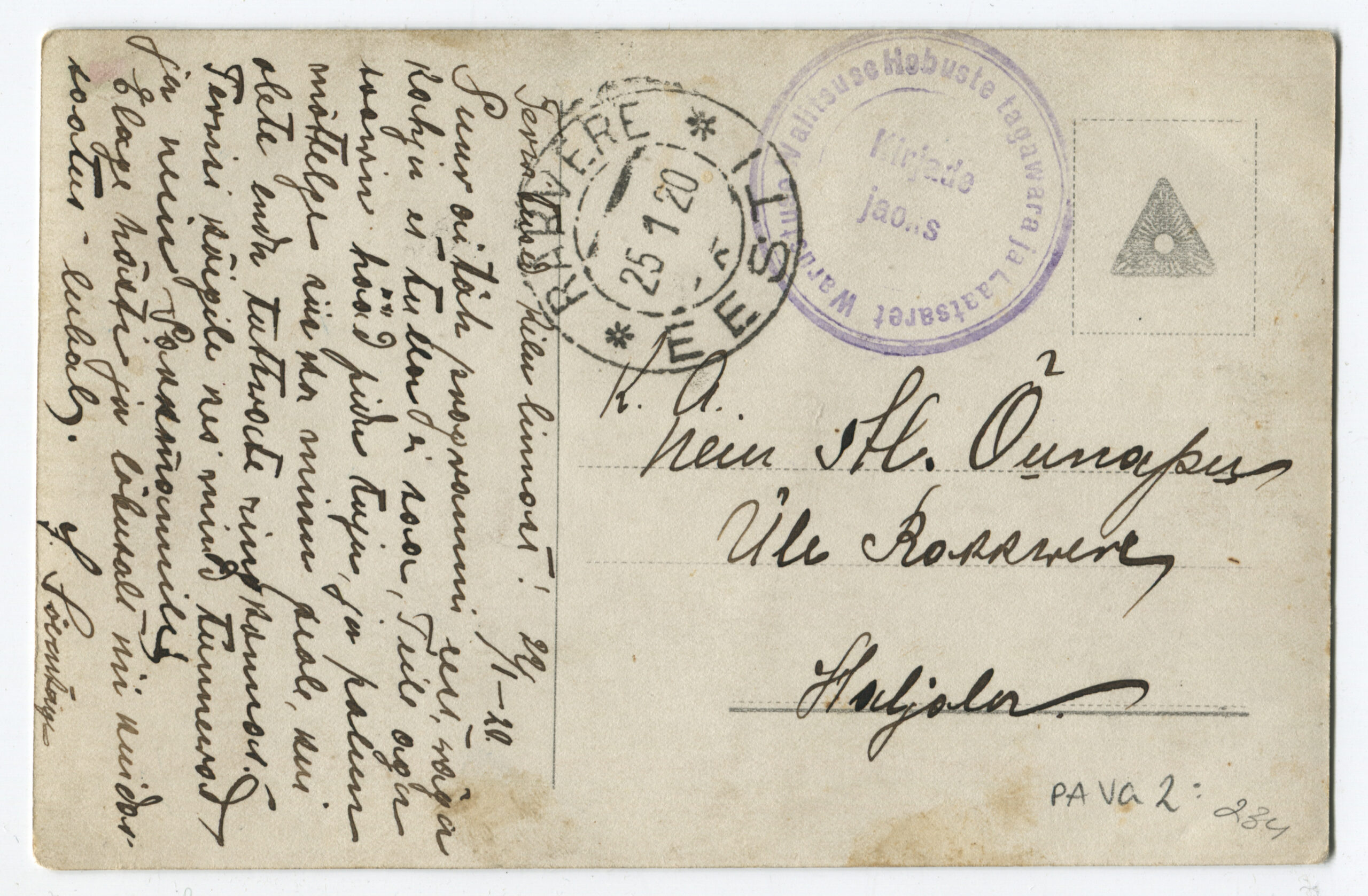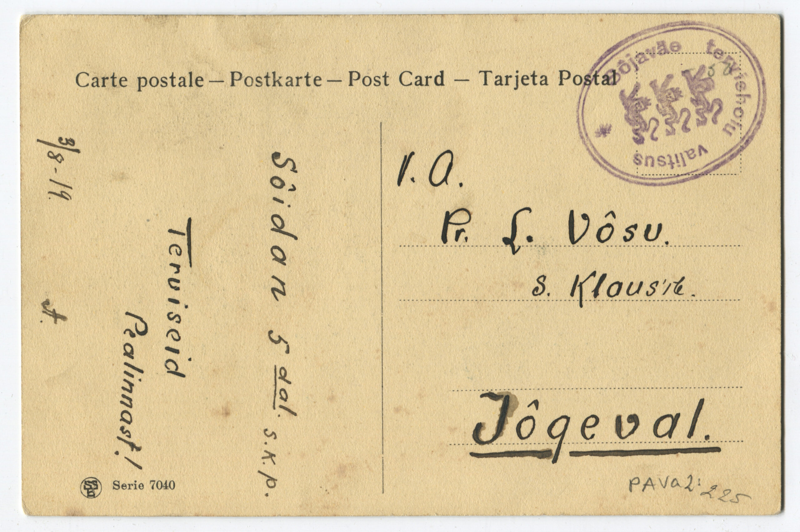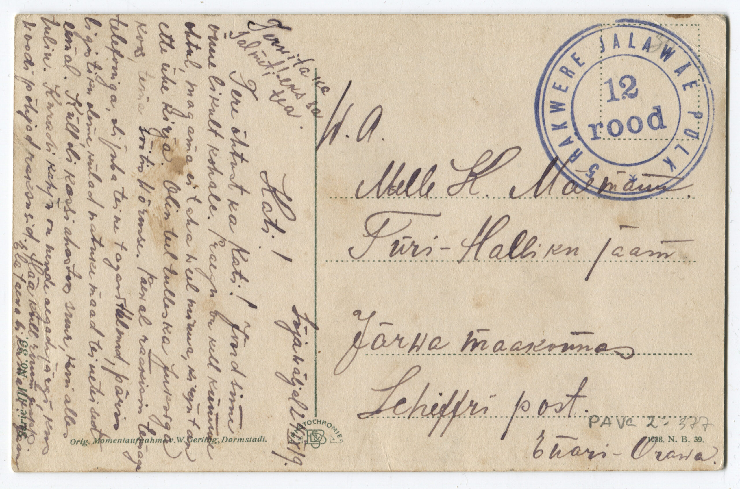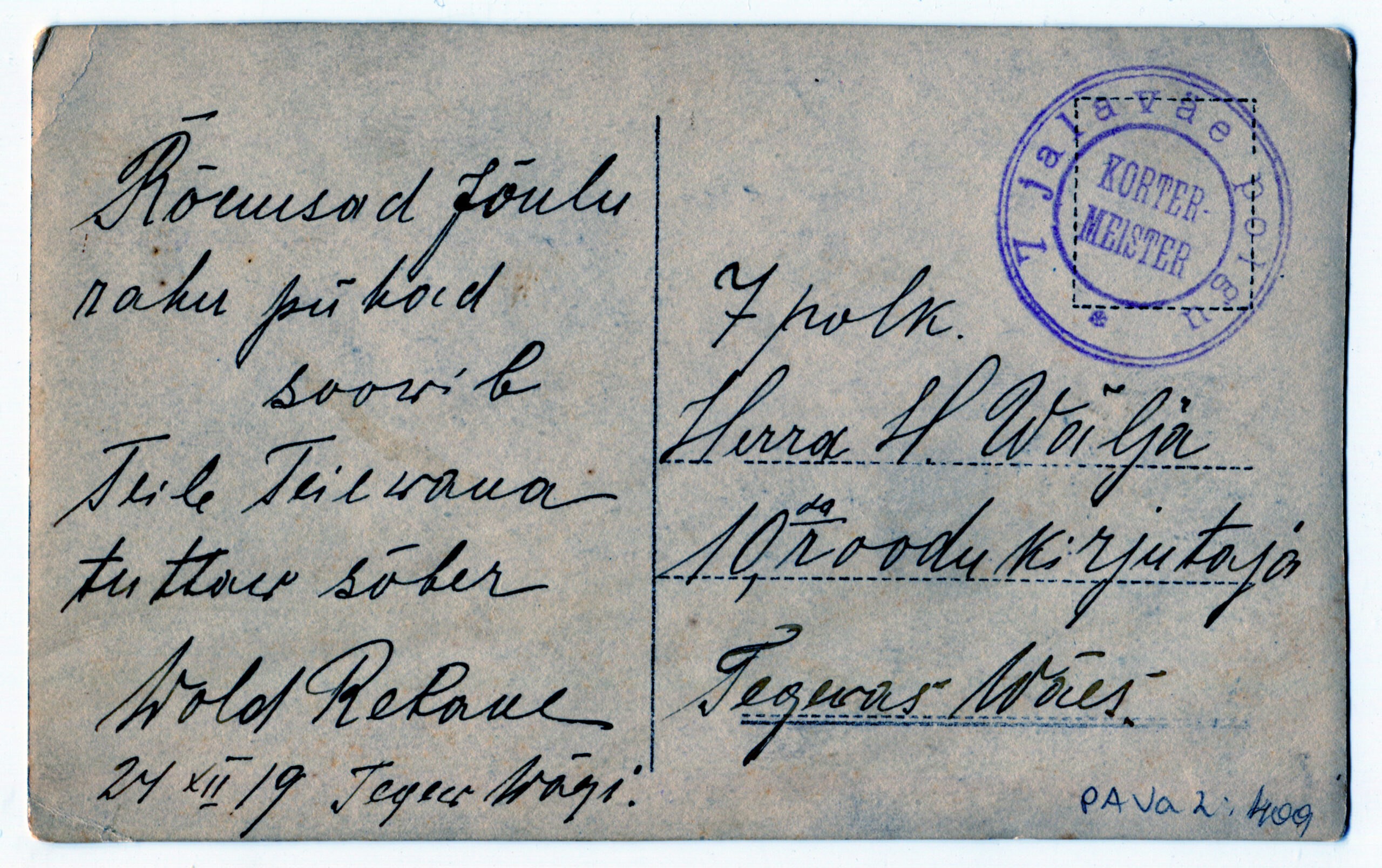 7. jalaväe polgu kortermeistri ladu asus Võrus Tartu tn 15.8 JALAWÄE POLK / Kirjadele