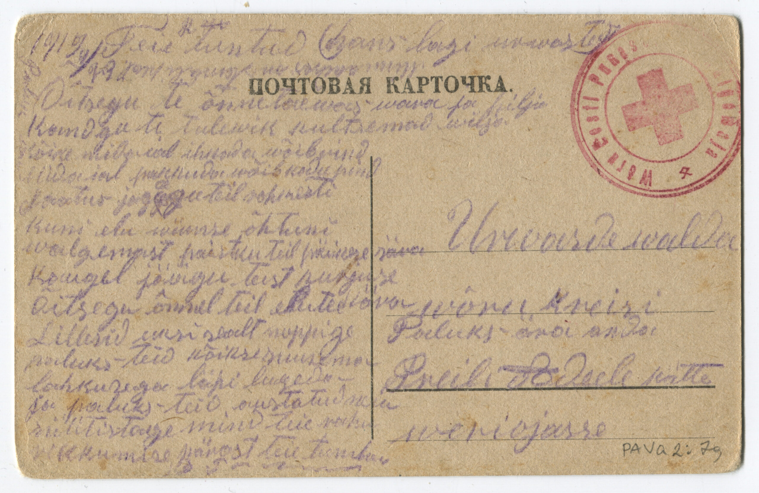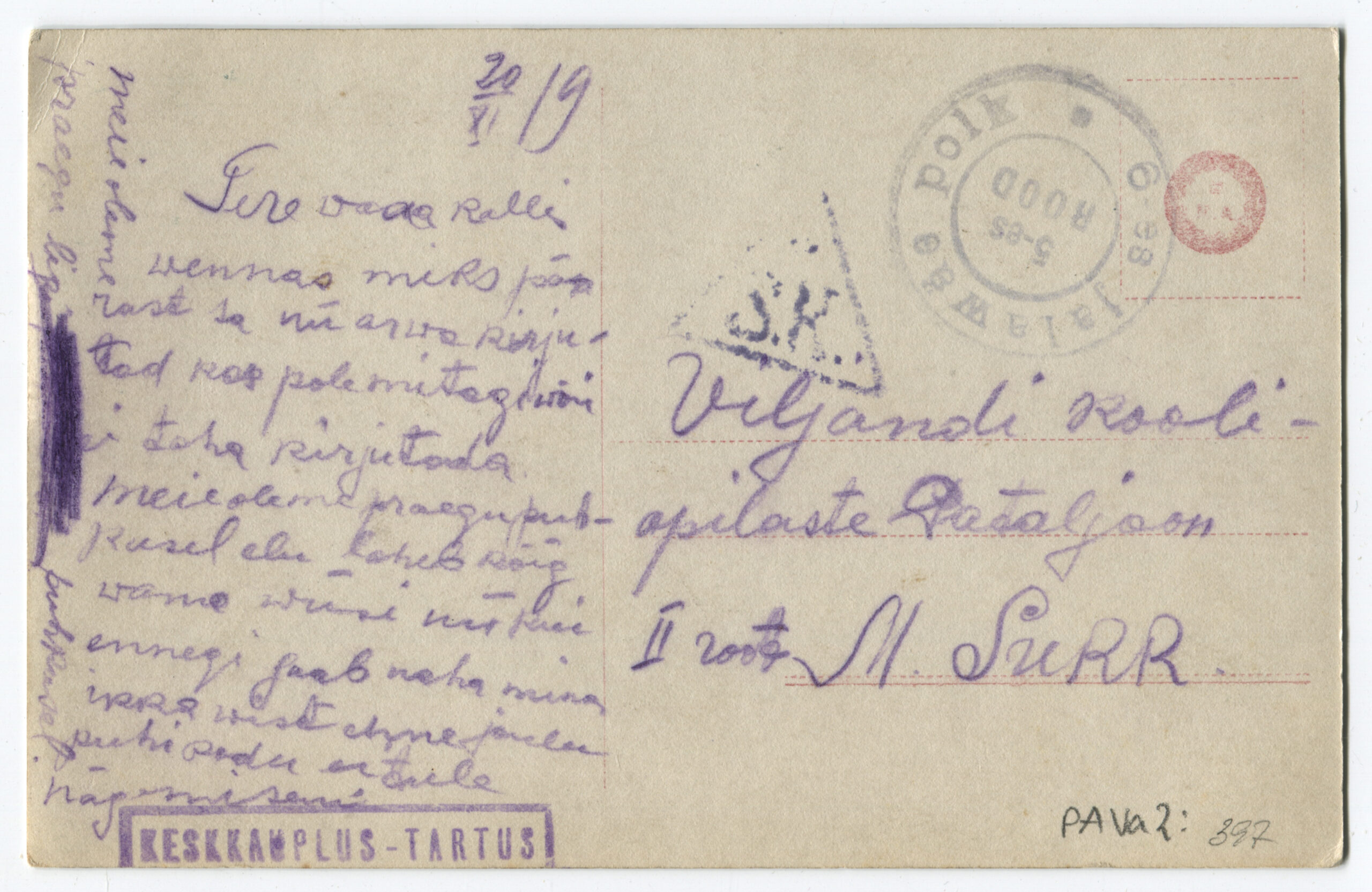 Rahvahulk Estonia teatrimaja ees Asutava Kogu avamise päeval, 23.04.1919. Foto: I. & P. Parikas Tallinnas.Kiri on saadetud 6. jalaväepolgu sidekomando teenistujale 19.02.1920. 6. jalaväepolgu sidekomando ülemaks määrati 20.02.1919 leitnant Aleksander Kulbusch (Kulgver). 23.10.1919 sai ta alamkapteni auastme.