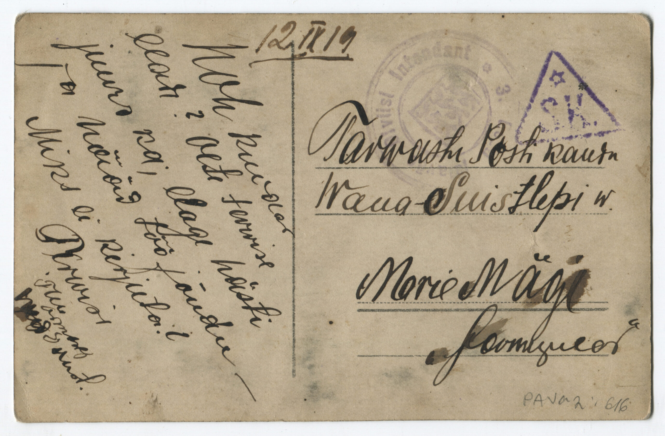 Kiri on saadetud 11.03.1919 Rakverest 1. suurtükiväepolgu staapi.