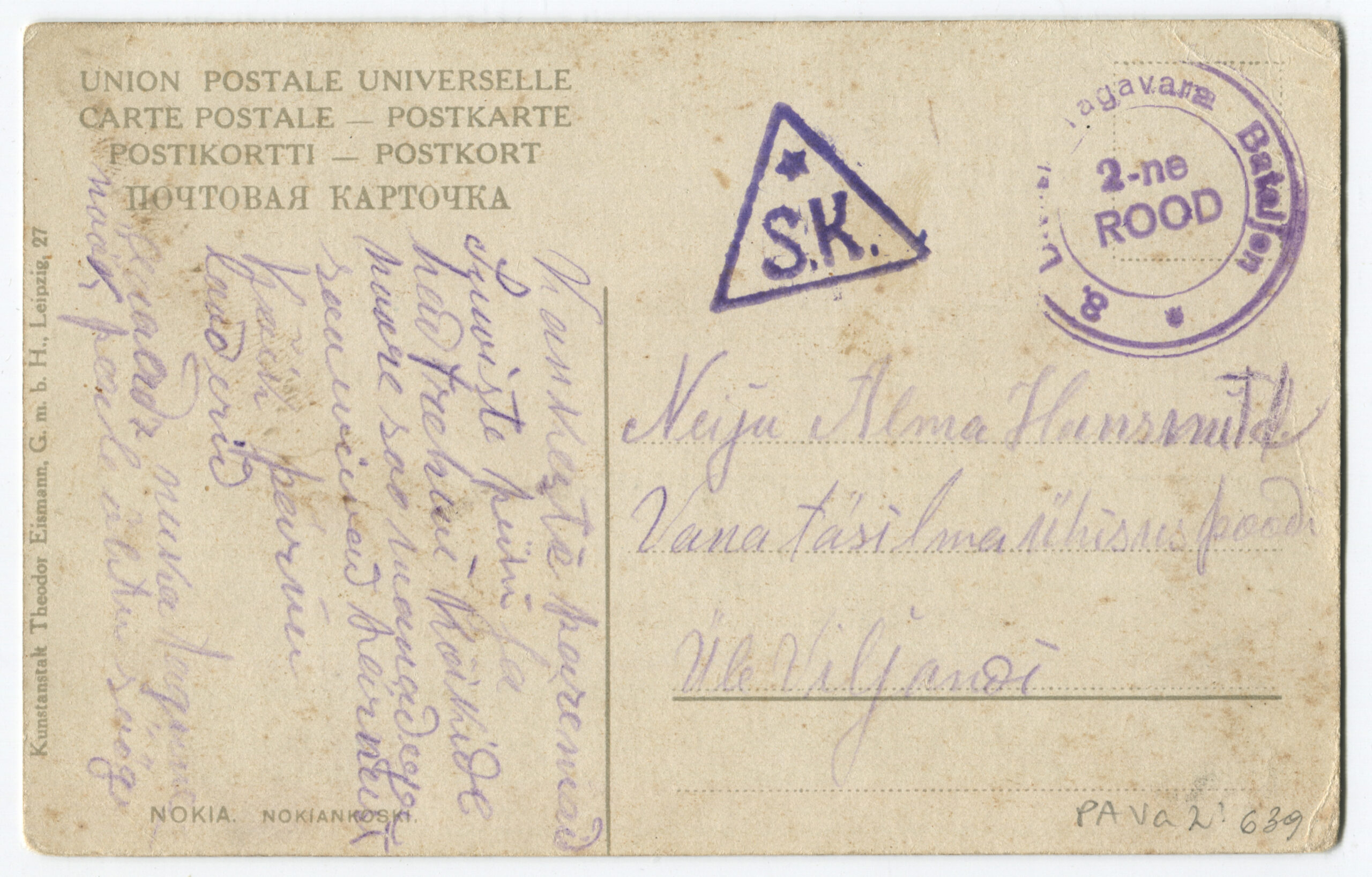 ERMTempel: 3. Diviisi Tagavara Bataljon / 2-ne ROOD. Kolmnurkne Tartu Sõjaväe Kontrolli tempel „SK“