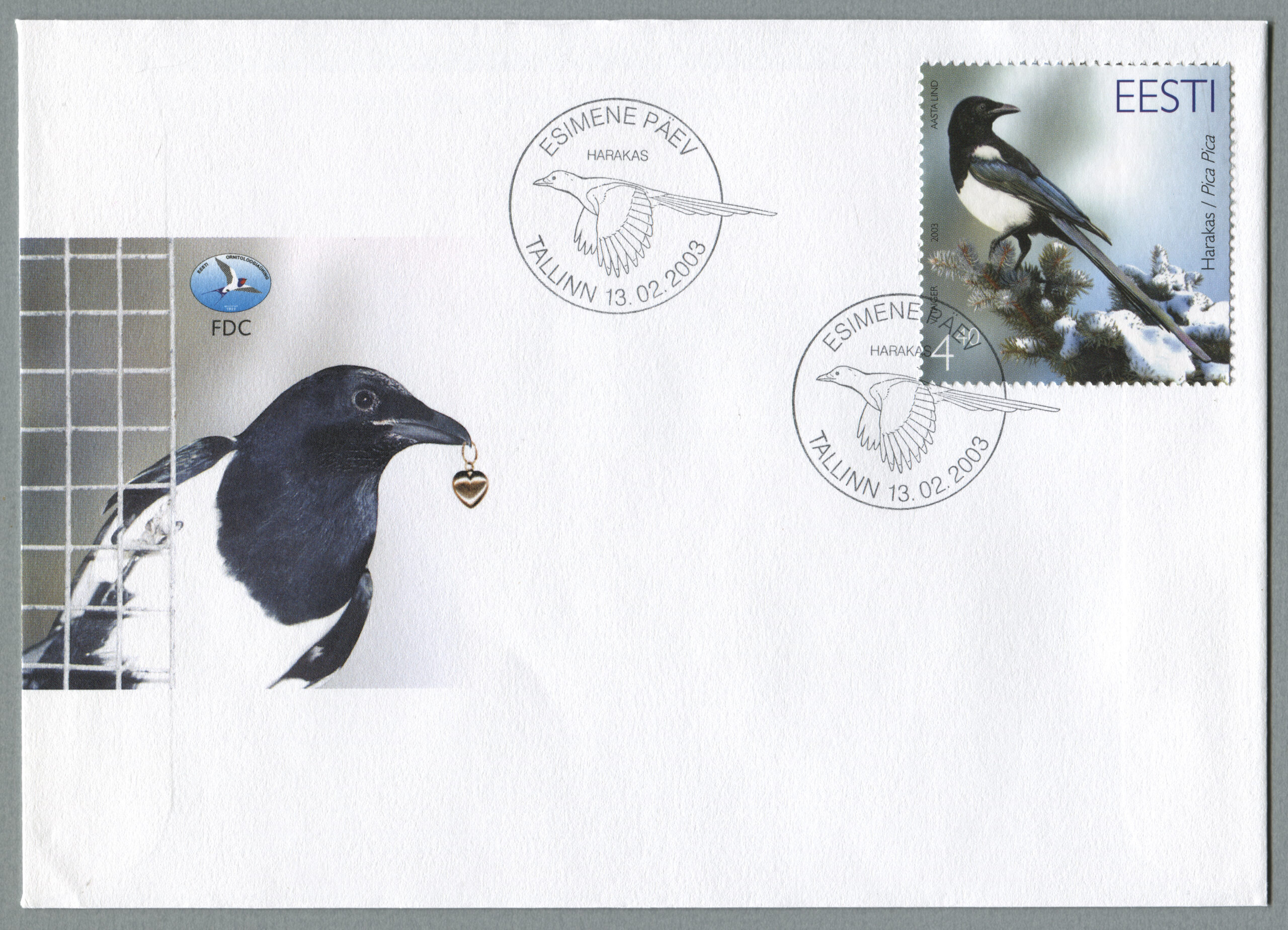 ERMi koguHarakas. Värvipliiatsi joonistus. Vladimir Taigeri erakoguEsimese päeva ümbrik (FDC). Aasta lind – harakas, 13.02.2003