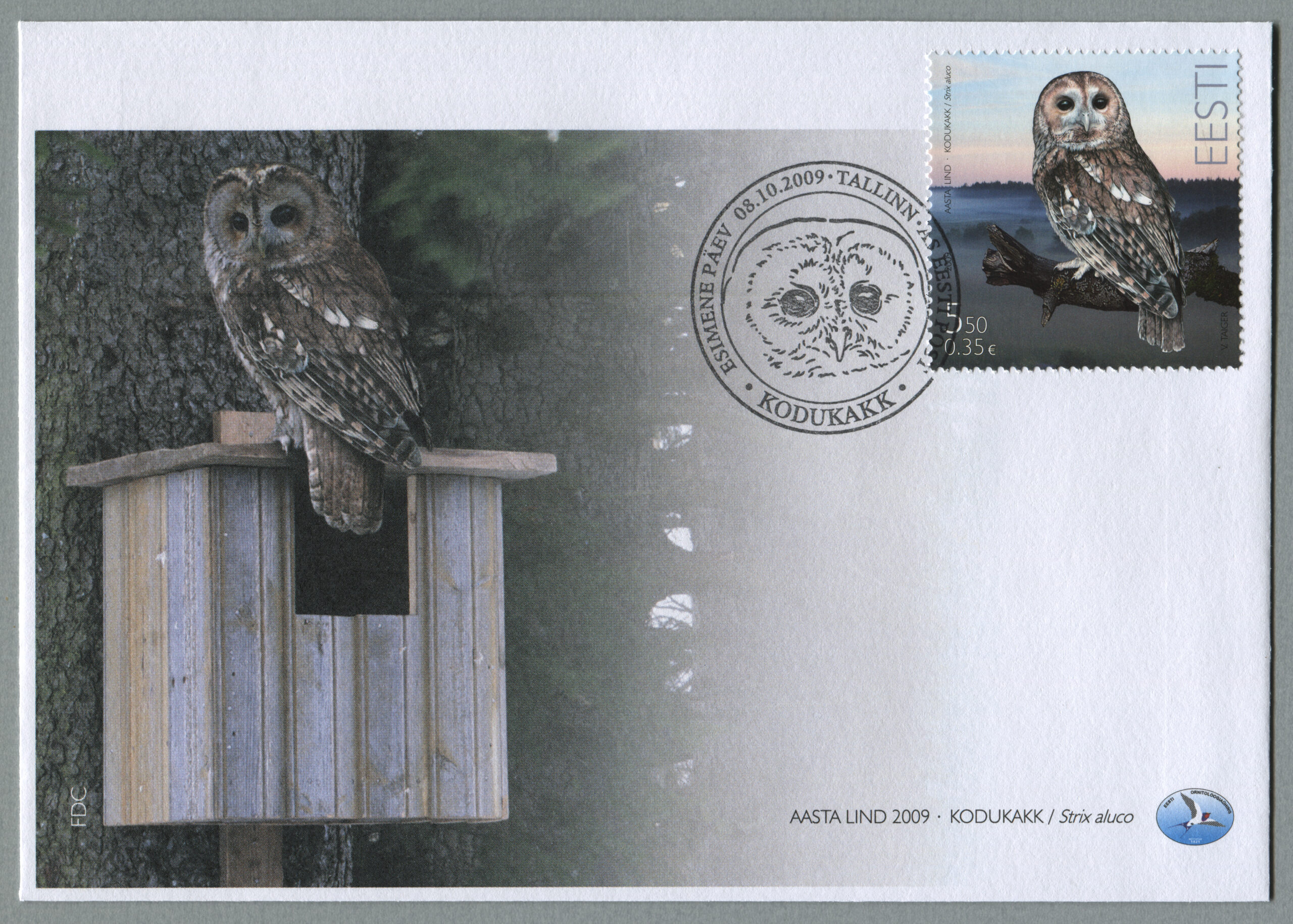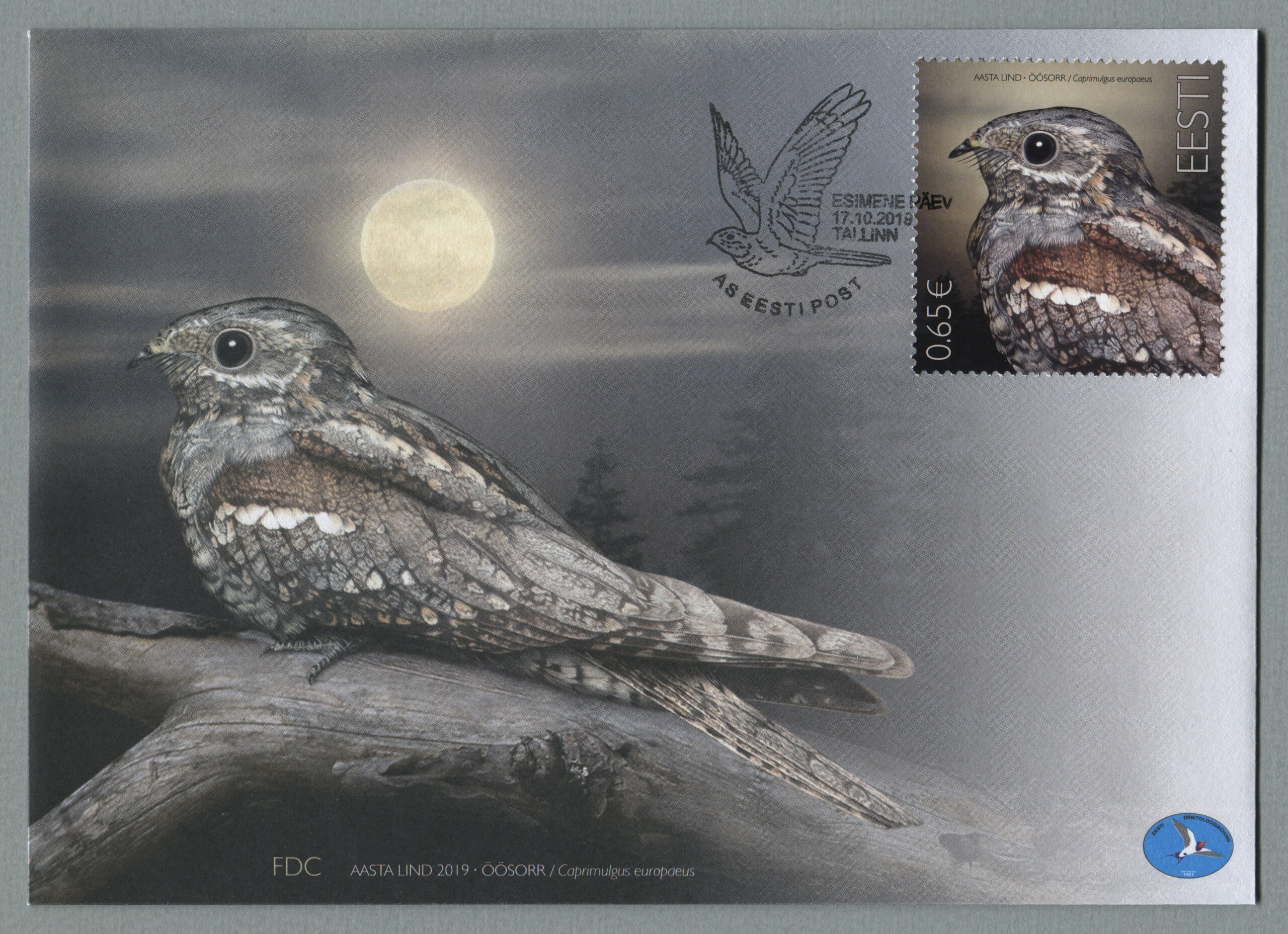ERMi koguÖösorr. Värvipliiatsi joonistus. Vladimir Taigeri erakoguEsimese päeva ümbrik (FDC). Aasta lind – öösorr, 17.10.2019