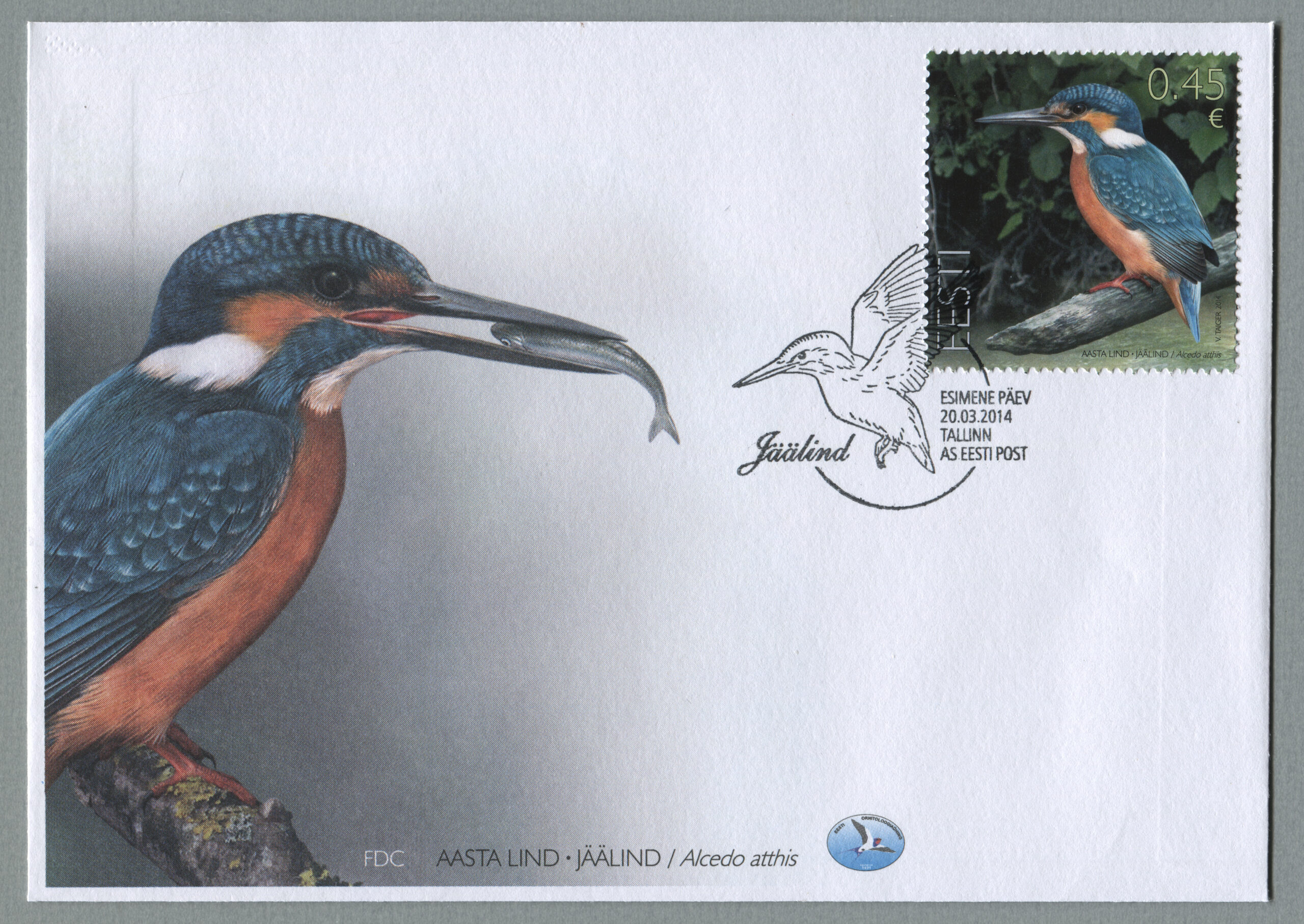 ERMi koguJäälind. Värvipliiatsi joonistus. Vladimir Taigeri erakoguEsimese päeva ümbrik (FDC). Aasta lind – jäälind, 20.03.2014