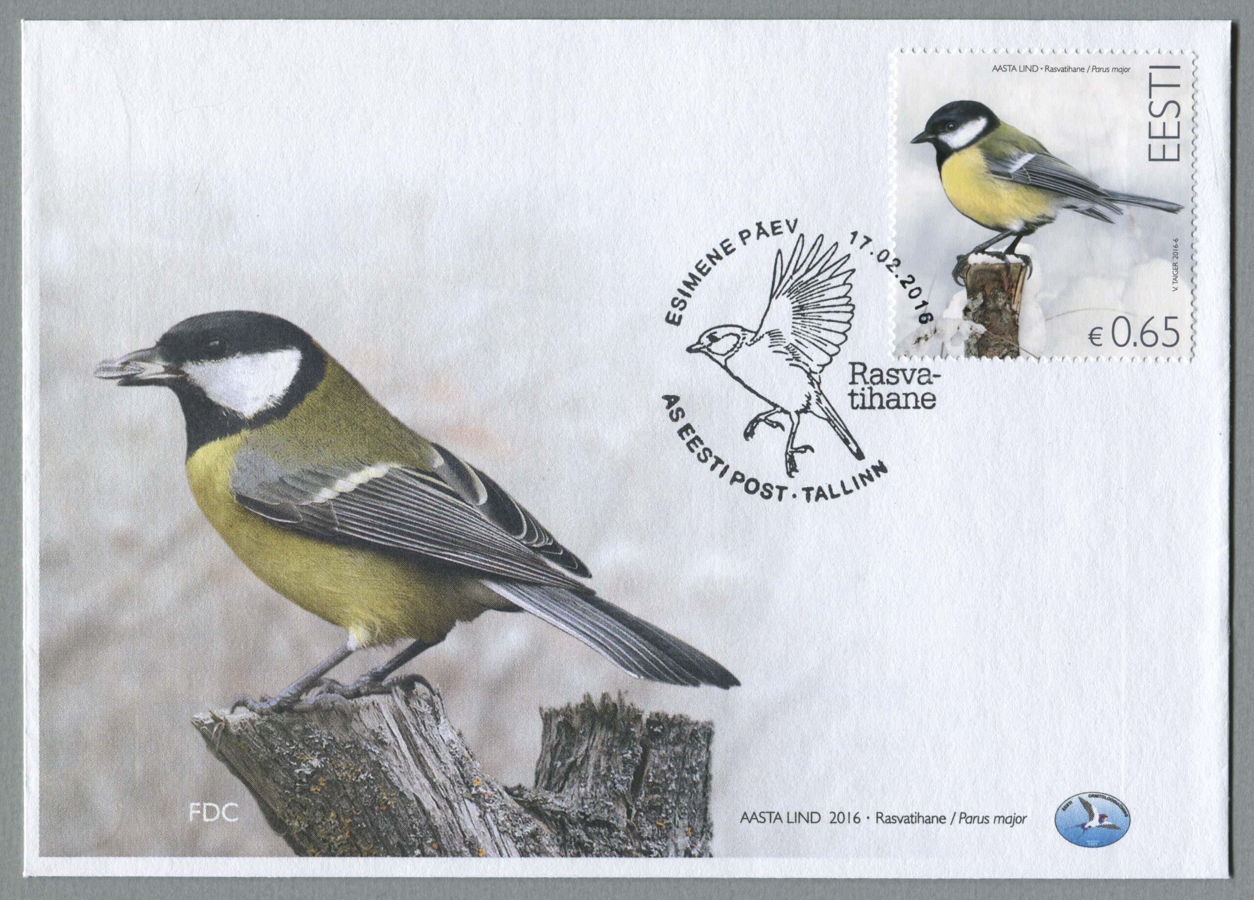 ERMi koguRasvatihane. Värvipliiatsi joonistus. Vladimir Taigeri erakoguEsimese päeva ümbrik (FDC). Aasta lind – rasvatihane, 17.02.2016