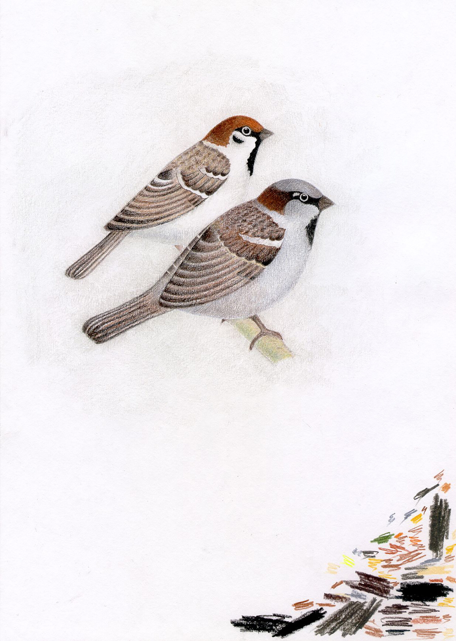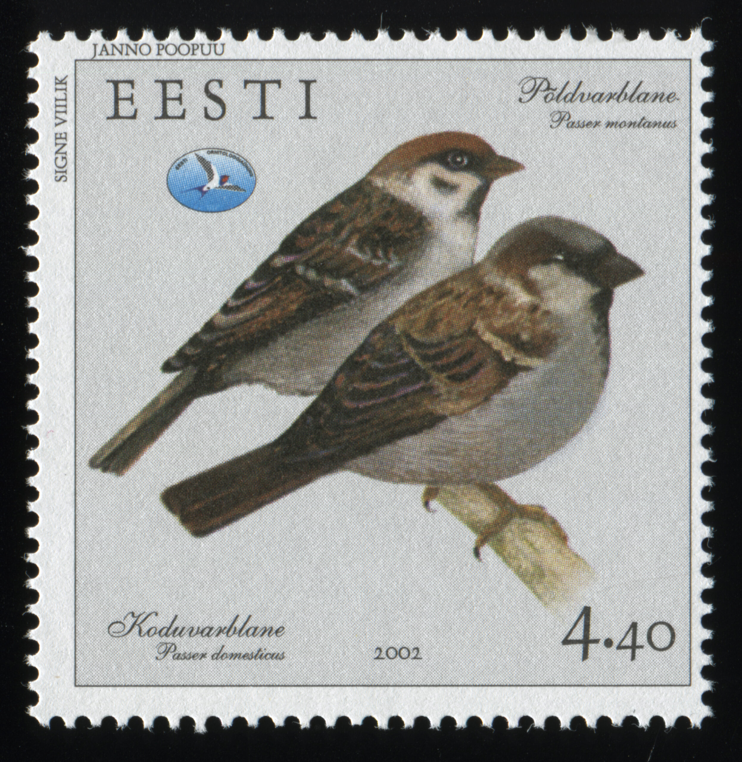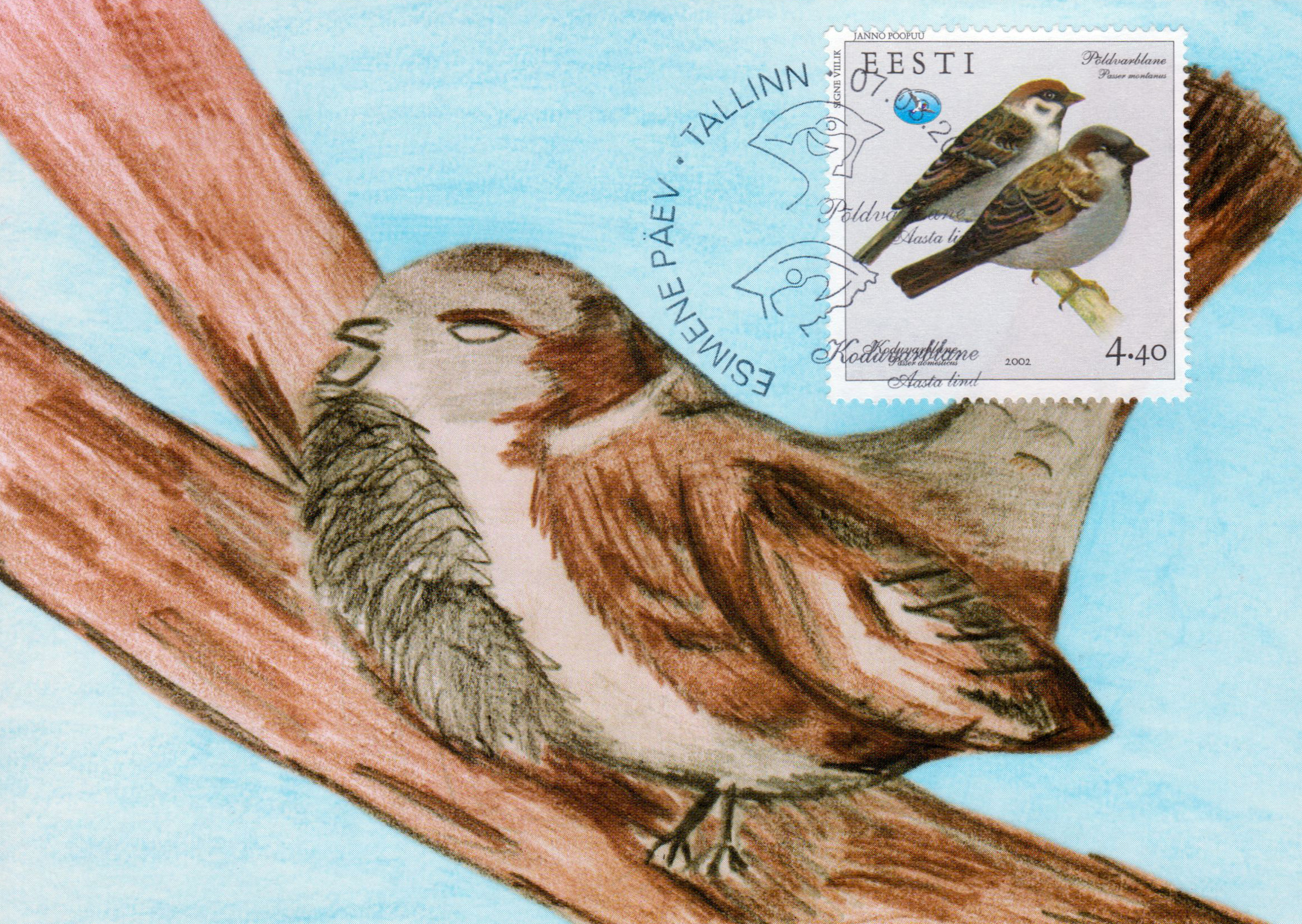 ERMi koguKodu- ja põldvarblane. Värvipliiatsi joonistus. Janno Poopuu erakoguEsimese päeva ümbrik (FDC). Aasta lind – kodu- ja põldvarblane, 7.03.2002
