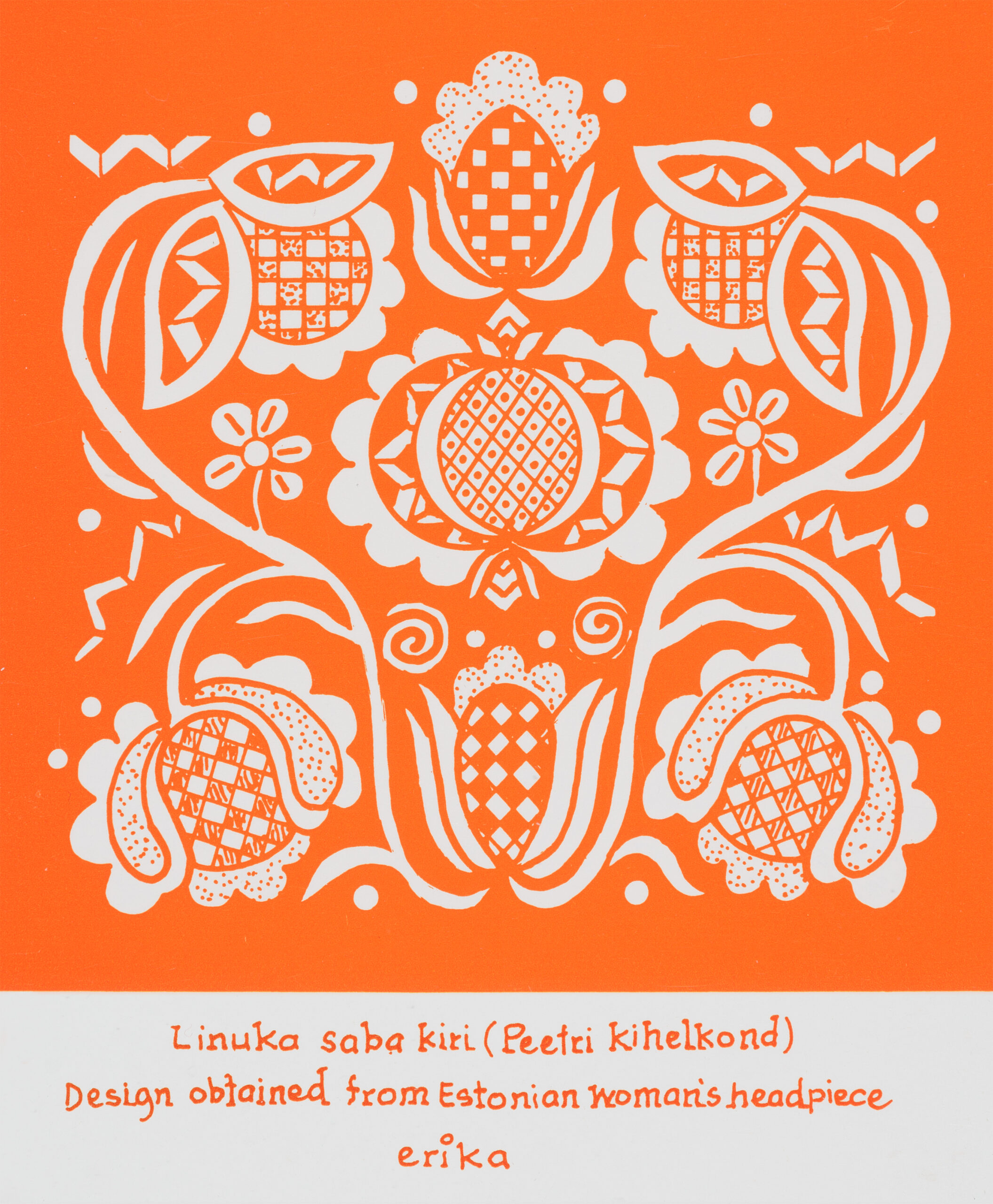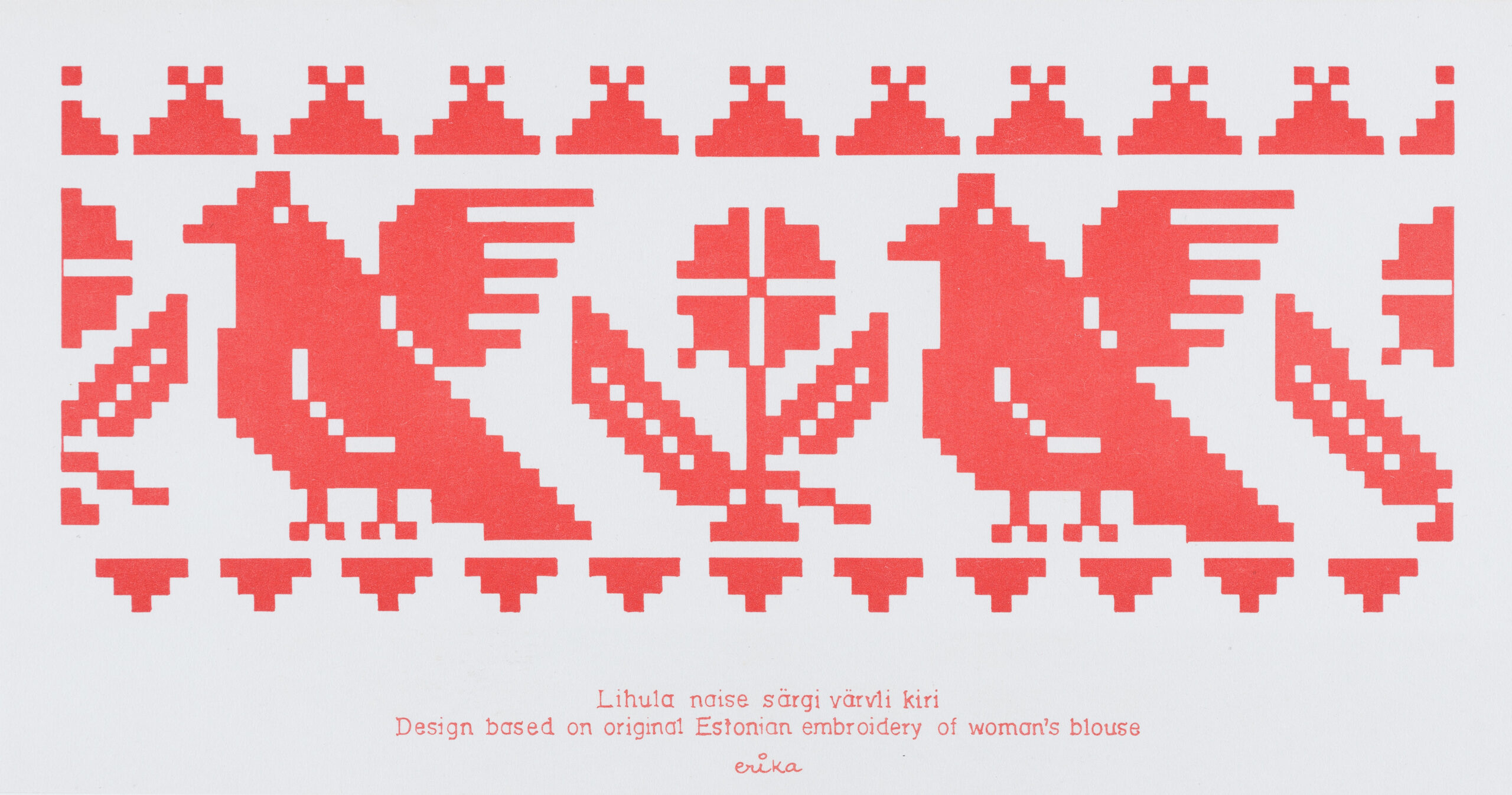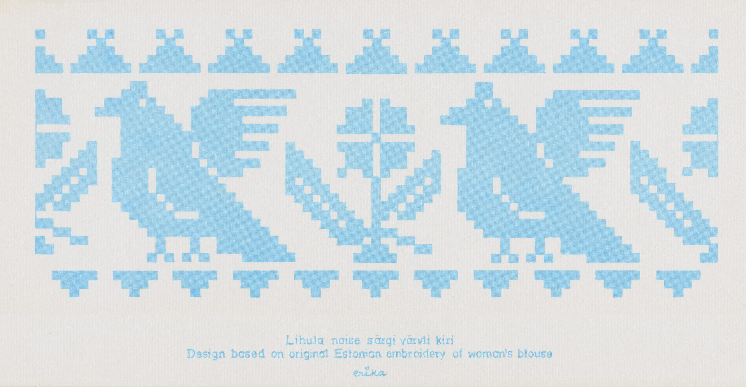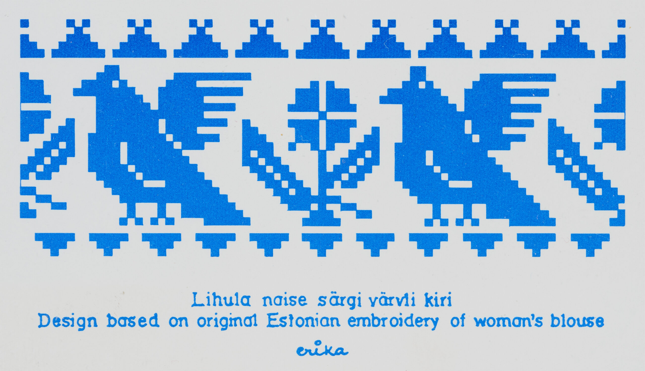 Virtuaalnäituse sarja avavad Erika Kalami loodud kirjade-mustritega postkaardid, mis on inspireerinud õpilasi looma juurde joonistuslehti erinevate kihelkondade mustrite põhjal.