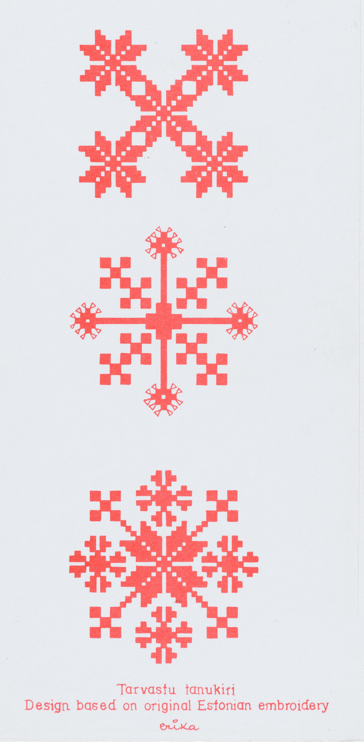 Haapsalu salli motiividHalliste kihelkondHelme kihelkondHelme kihelkond. VärvilehtIisaku kihelkondJõelähtme kihelkondLihula kihelkondLihula kihelkondLihula kihelkondLillekirjaga postkaart 1991Mustrimotiiv jõulukaardilPeetri kihelkondPõlva kihelkondSeto vöökiriSokimuster. VõrumaaTarvastu kihelkondTarvastu kihelkondTarvastu kihelkondTarvastu tanukiri. VärvimislehtTarvastu tikand. VärvimislehtVigala kihelkondSokimuster. Võrumaa. Värvimisleht