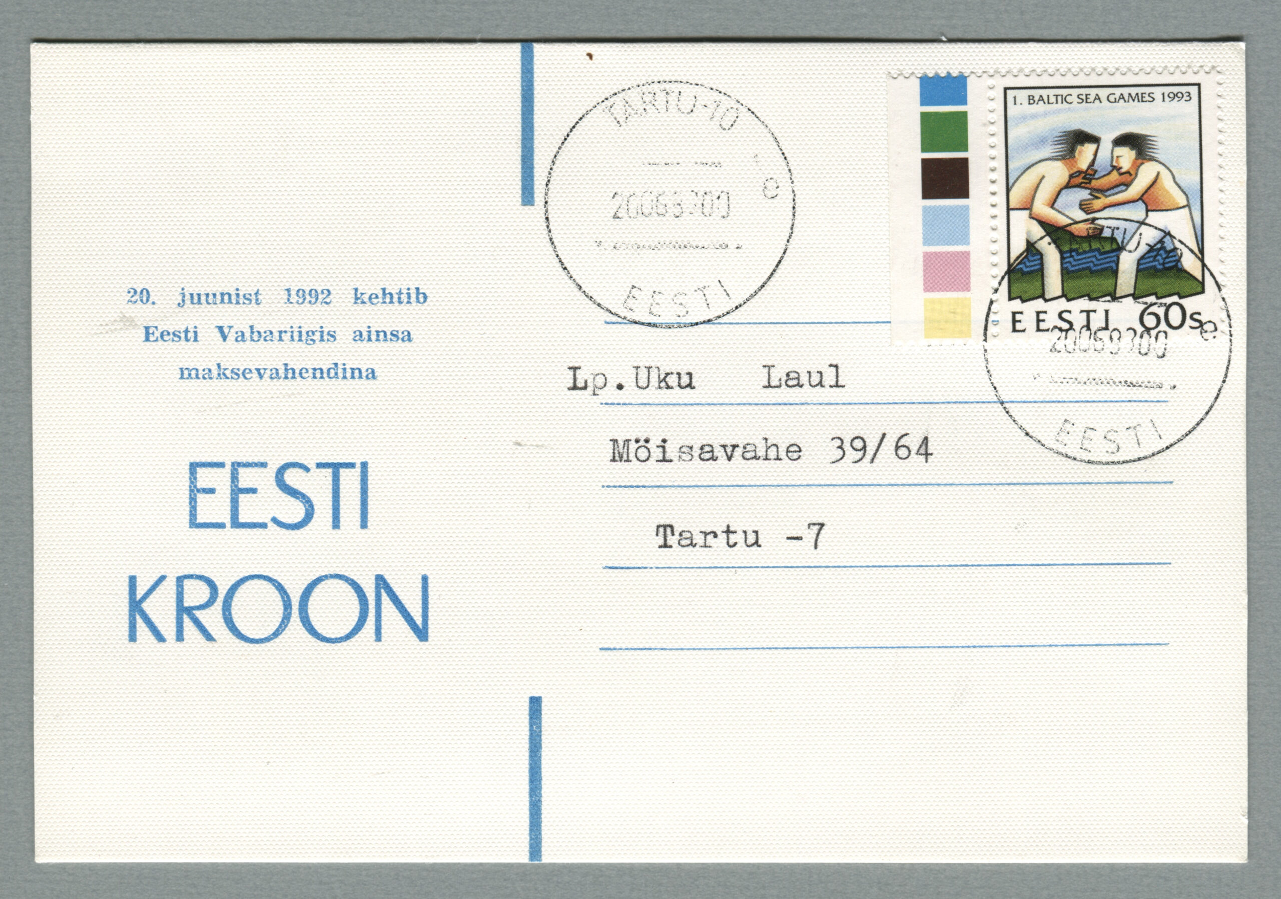 ErakoguErapostkaart „Eesti kroon“. Kujundaja ja tellija Ülo Laul, Tartu Trükikoda, tiraaž 500.