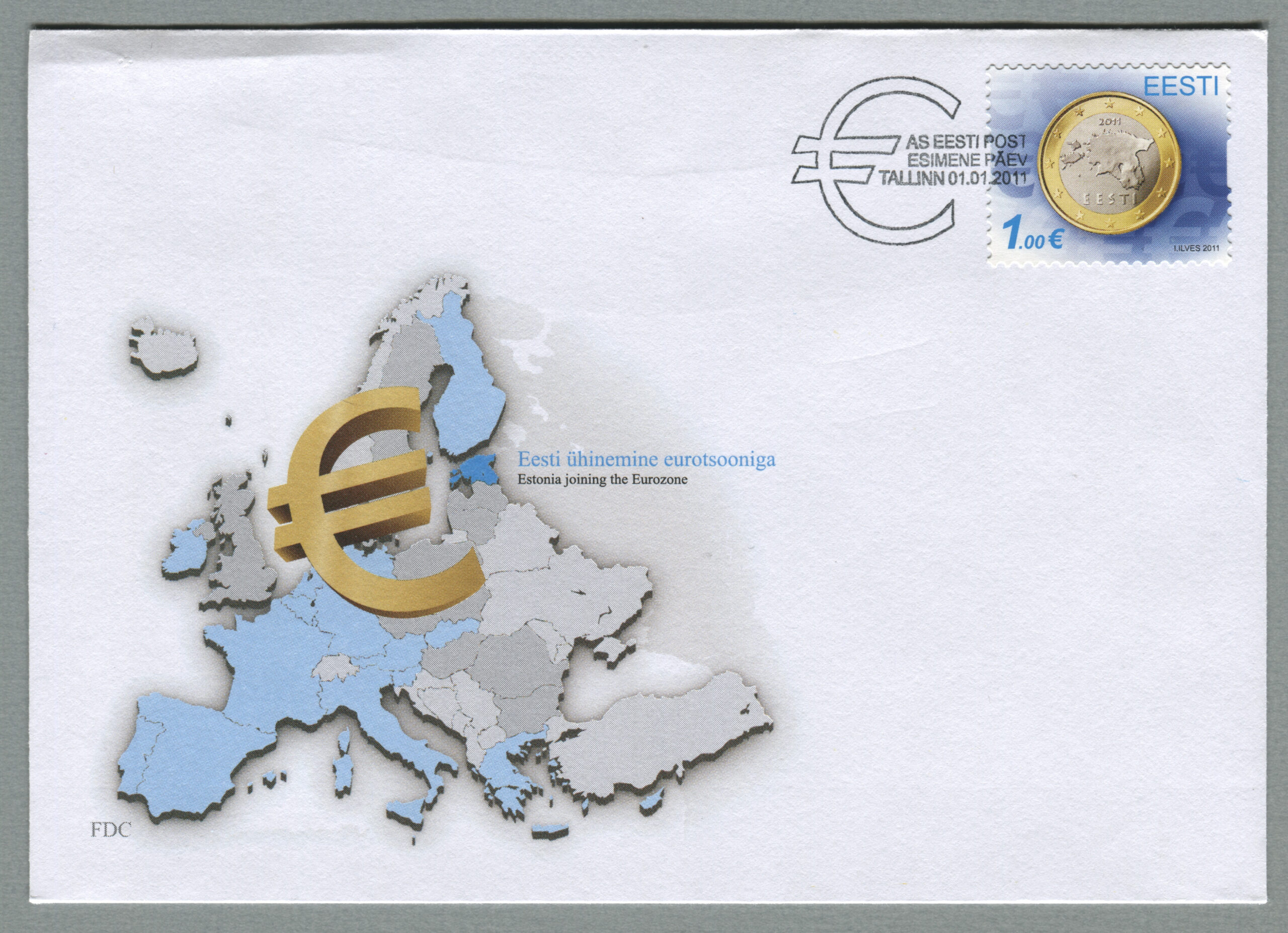 ERMi koguEsimese päeva ümbrik (FDC), euro kasutuselevõtt, 1.01.2011. Kunstnik Indrek Ilves.
