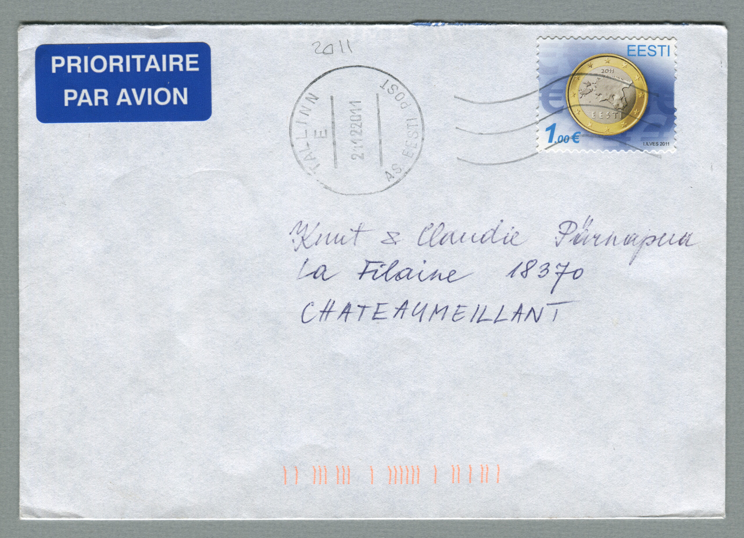 ERMi koguKiri, mis on saadetud õhupostiga Tallinnast 21.12.2011 Châteaumeillanti (Prantsusmaa).