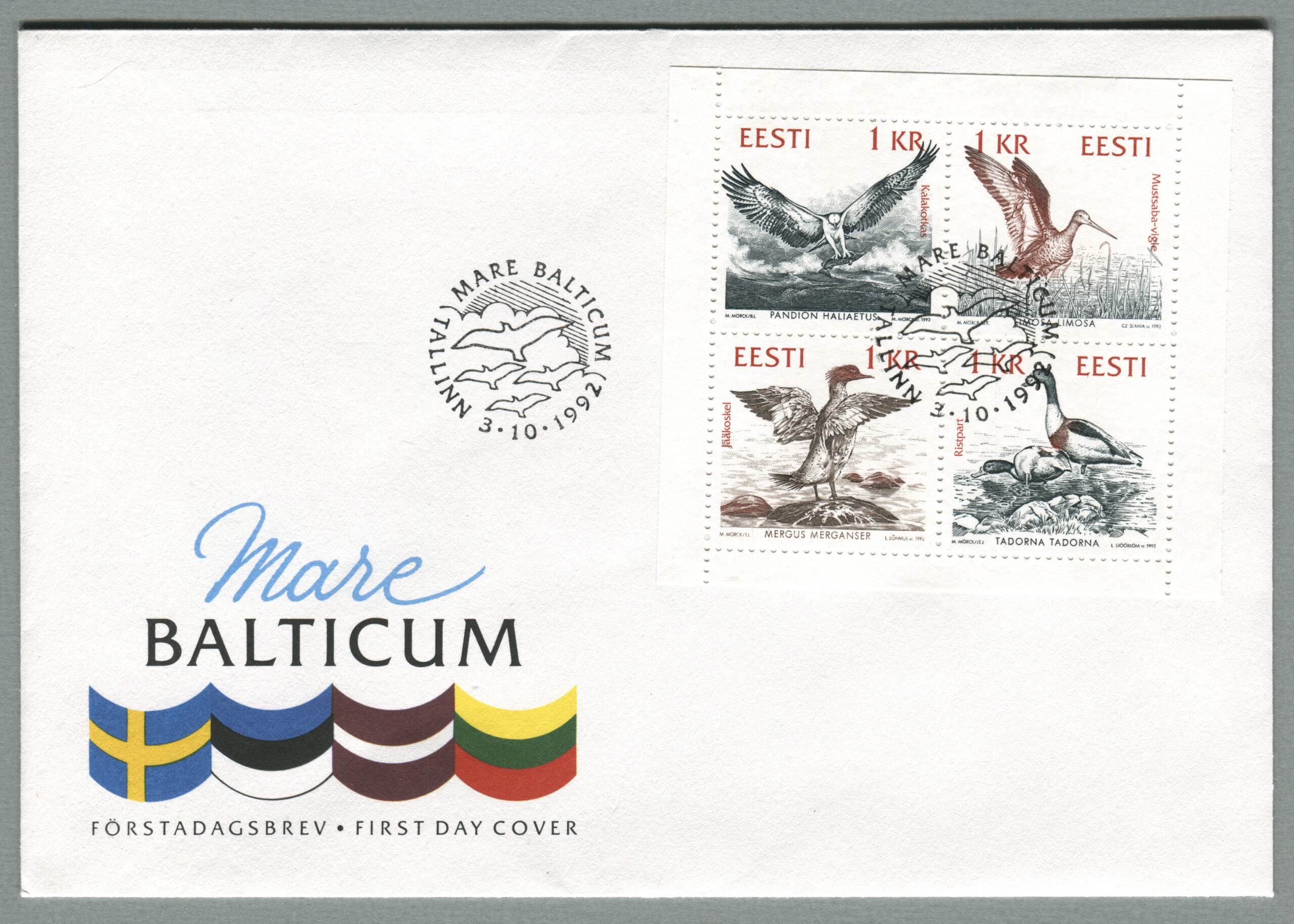 ErakoguEsimese päeva ümbrik (FDC), Eesti, Läti, Leedu ja Rootsi ühisväljaanne „Mare Balticum. Merelinnud“, margivihik, 3.10.1992.