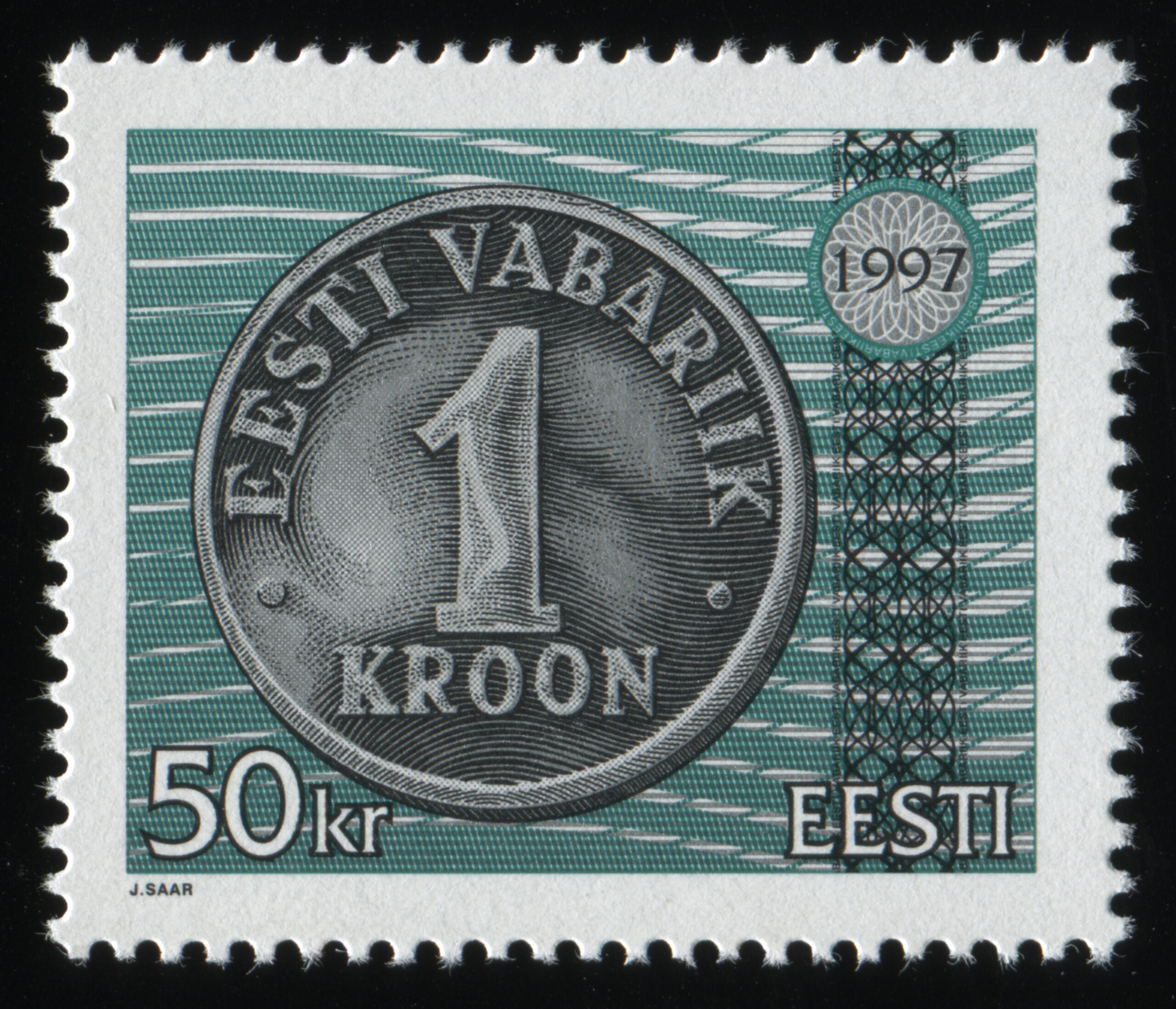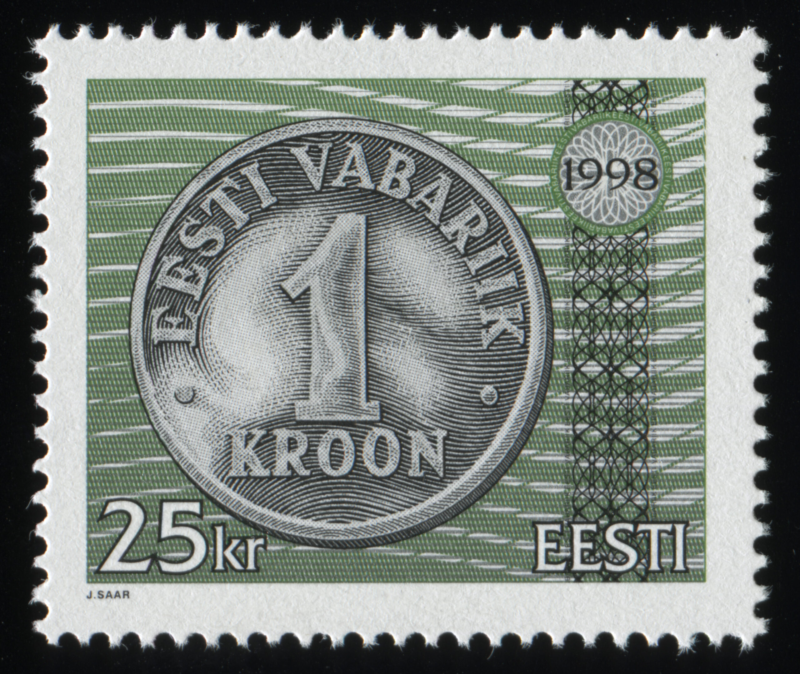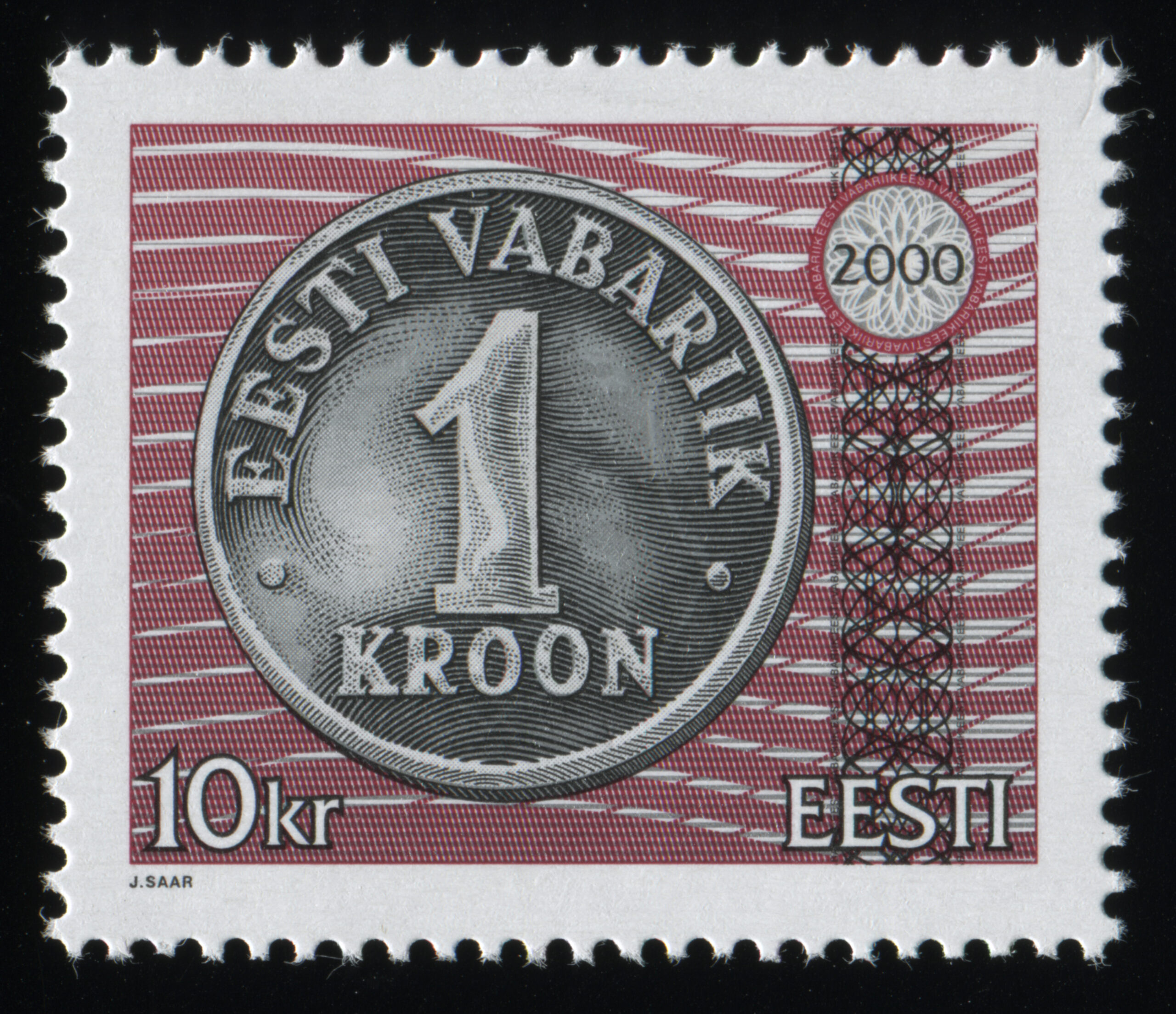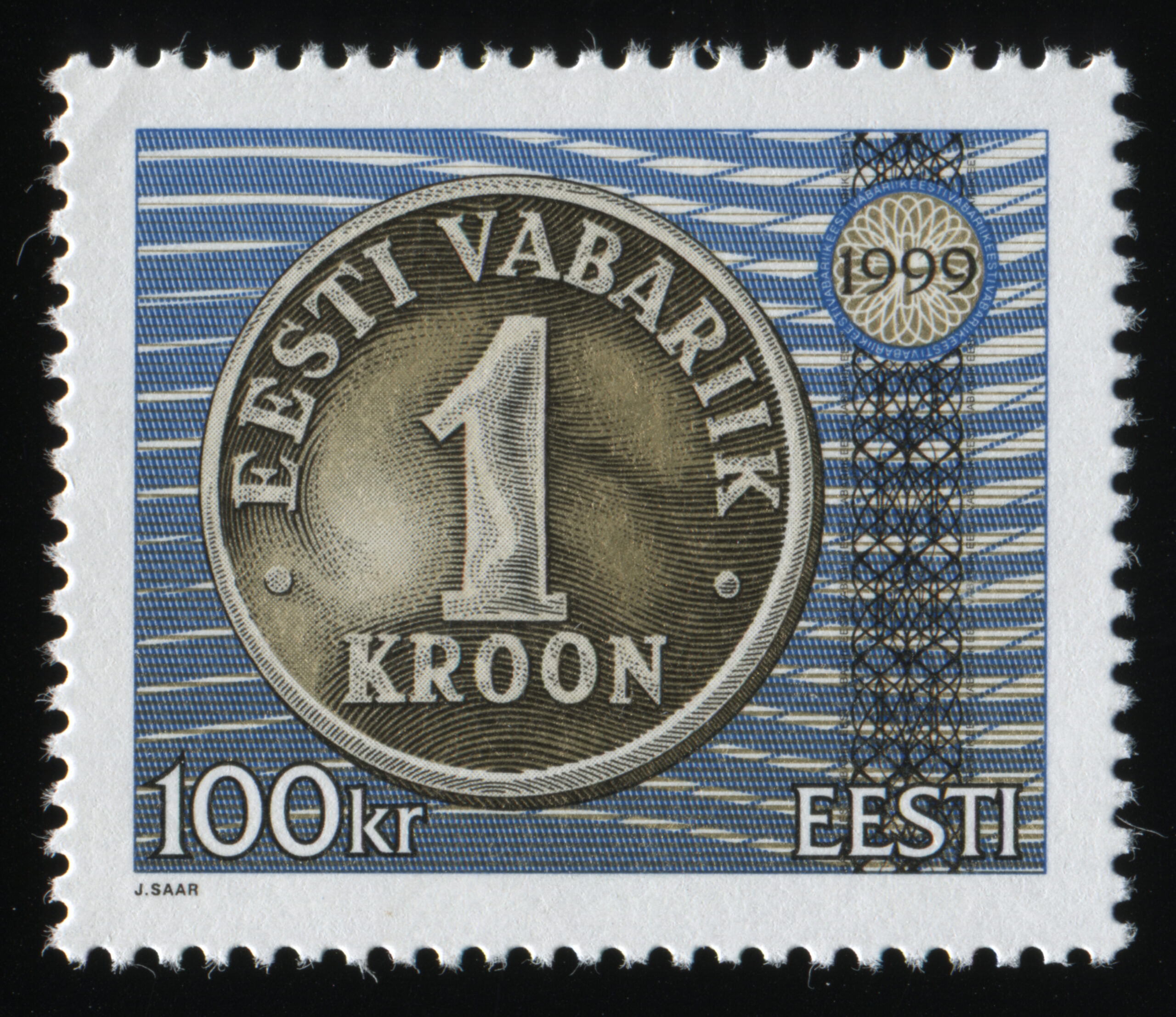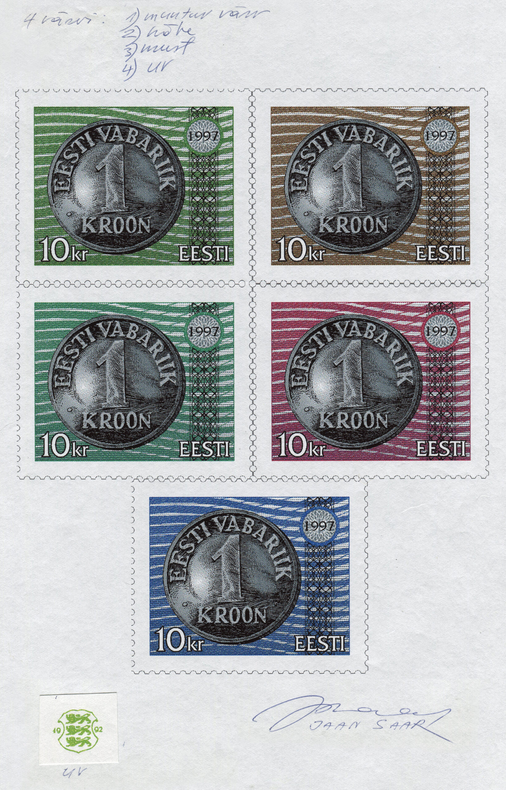 Jaan Saare erakoguSuure nominaaliga postmargi konkursi võitnud töö. Kavandite autor Jaan Saar. „10-, 25-, 50-krooniste markide mündi toon on hõbe ja 100-kroonisel kuldne, margid trükiti Vabas Maas ofsettrüki tehnikas. Mündi ja UV värvi kujundus on joonistatud, ülejäänu on tehtud arvutiga,“ ütleb Saar.