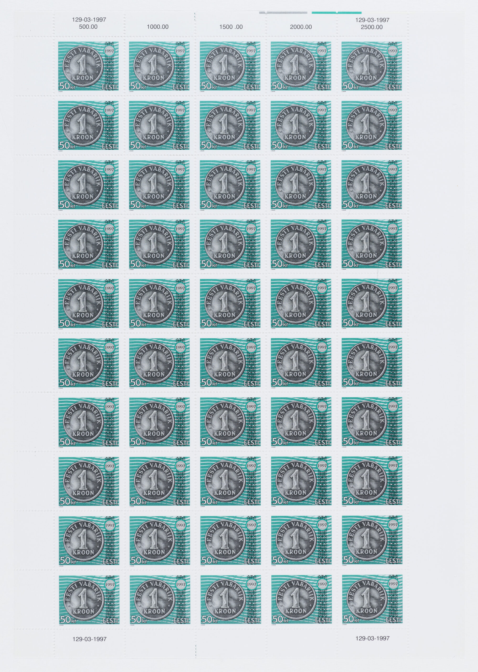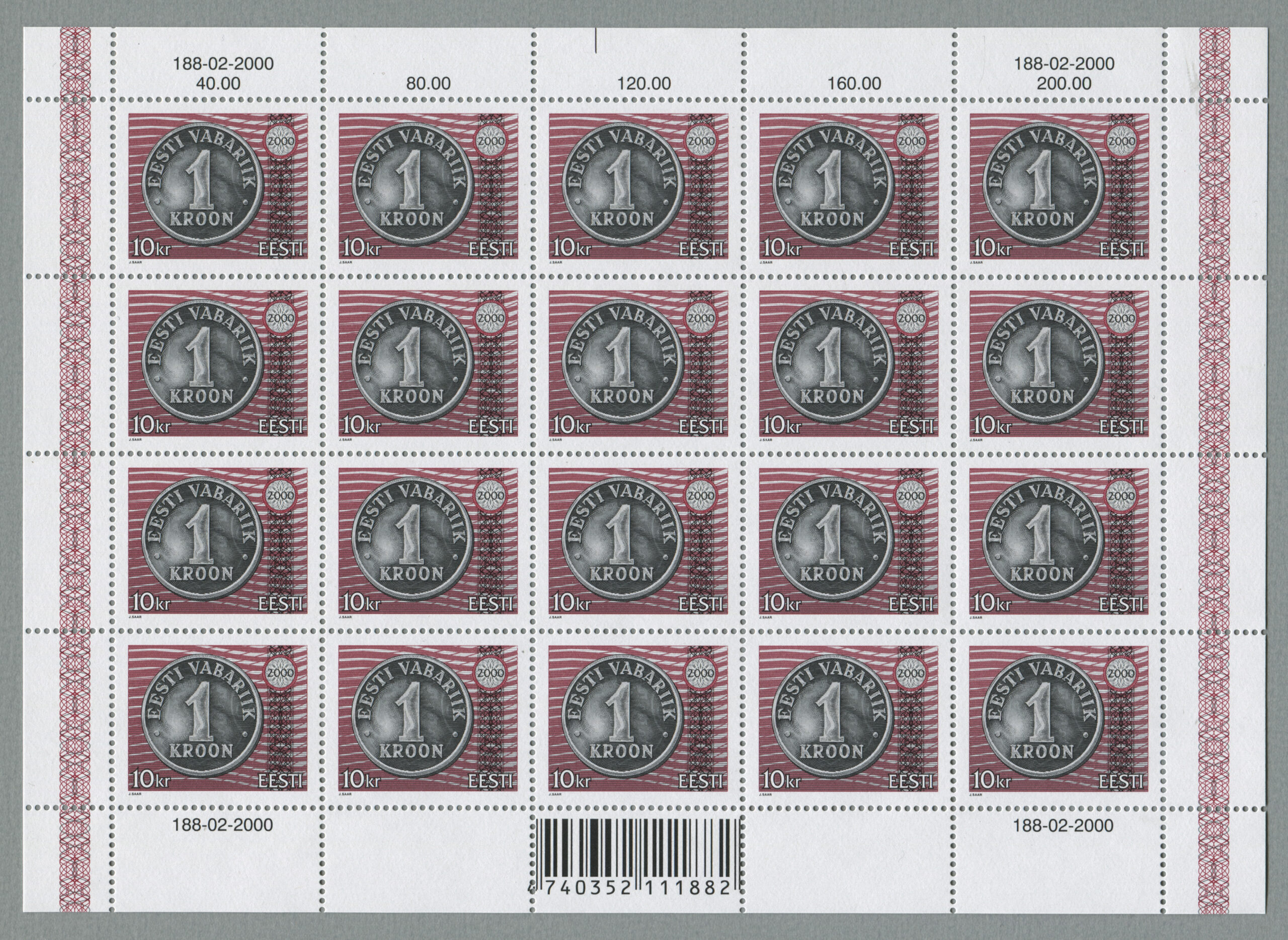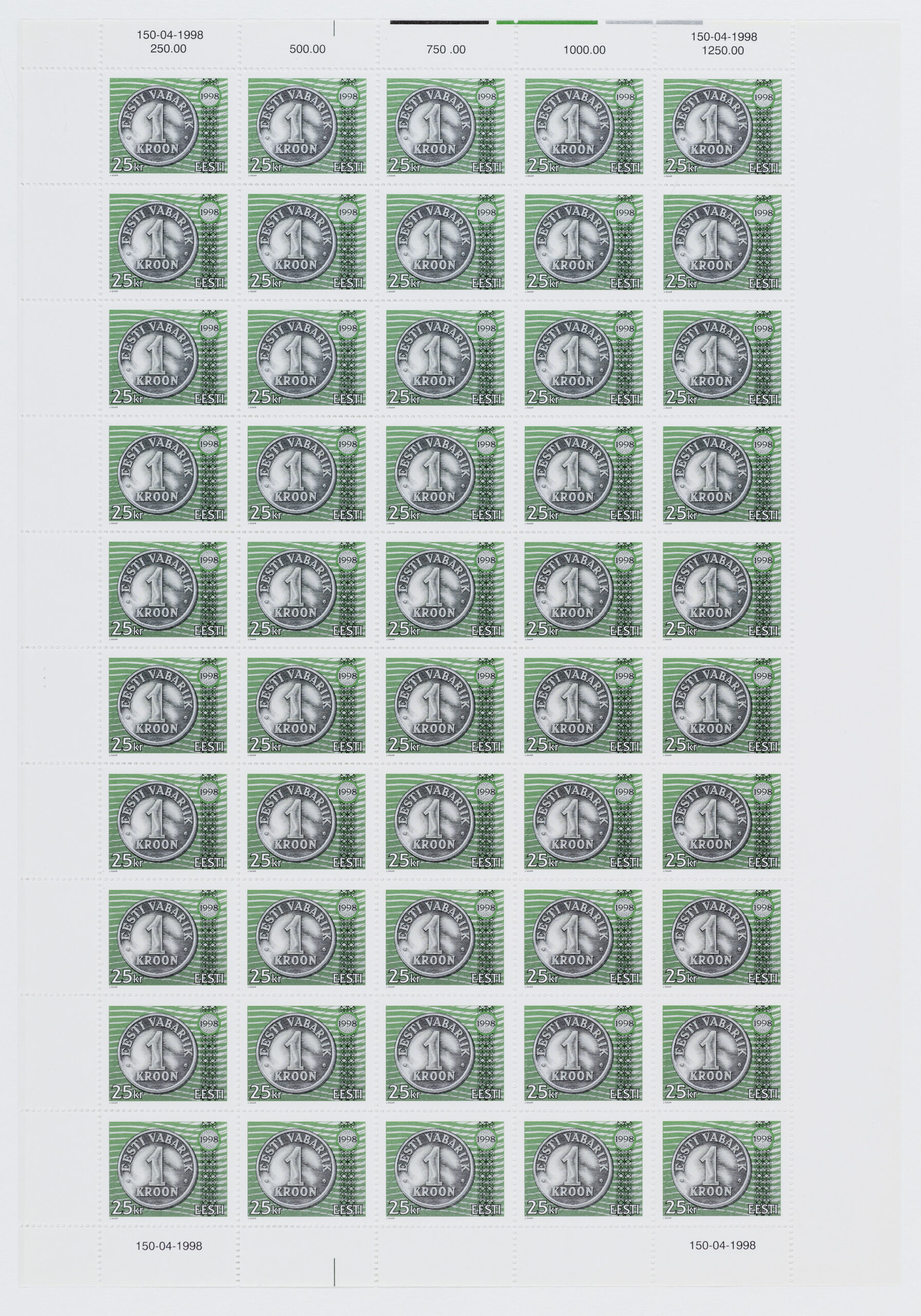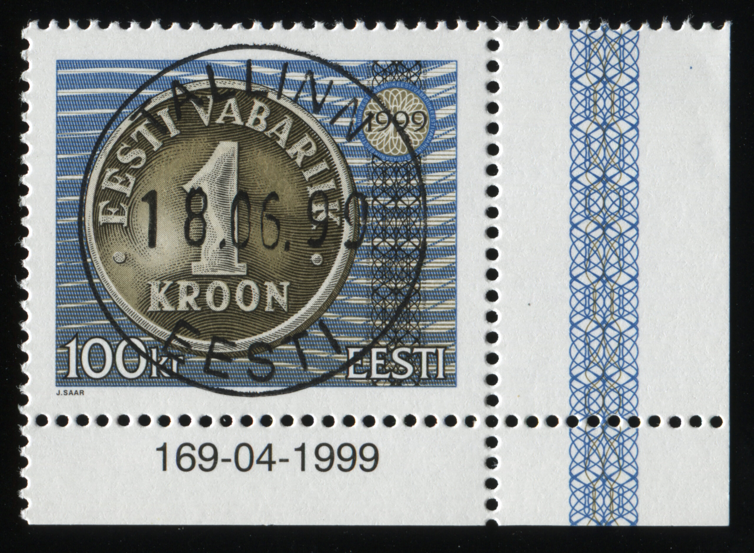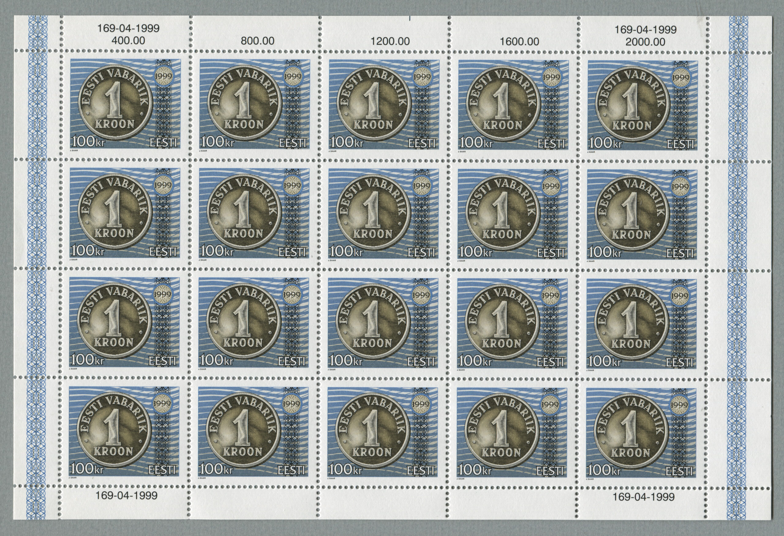 Jaan Saare erakoguSuure nominaaliga postmargi konkursi võitnud töö. Kavandite autor Jaan Saar. „10-, 25-, 50-krooniste markide mündi toon on hõbe ja 100-kroonisel kuldne, margid trükiti Vabas Maas ofsettrüki tehnikas. Mündi ja UV värvi kujundus on joonistatud, ülejäänu on tehtud arvutiga,“ ütleb Saar.