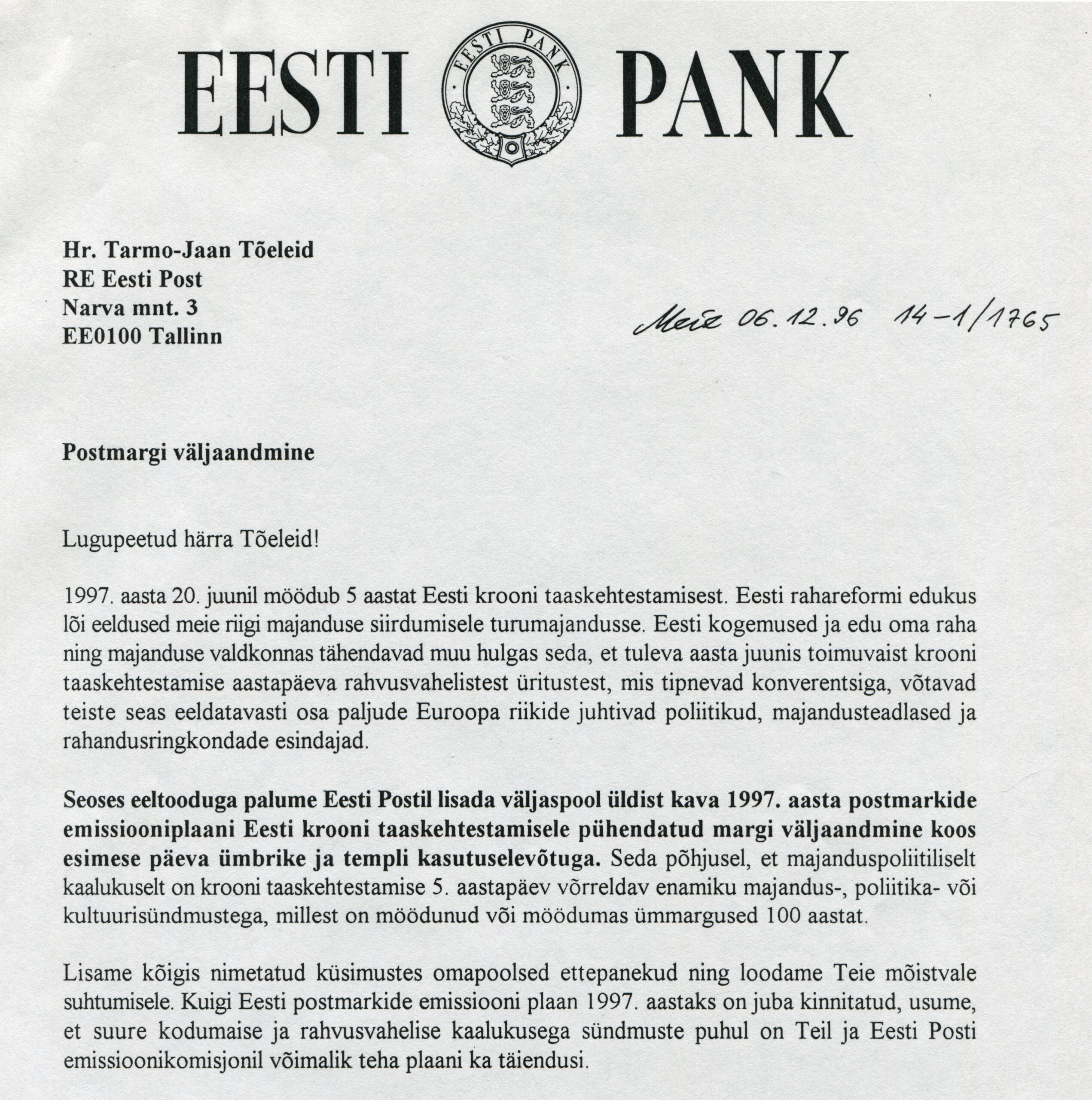 ERMi koguEesti Panga kiri Eesti Postile, 6.12.1996.