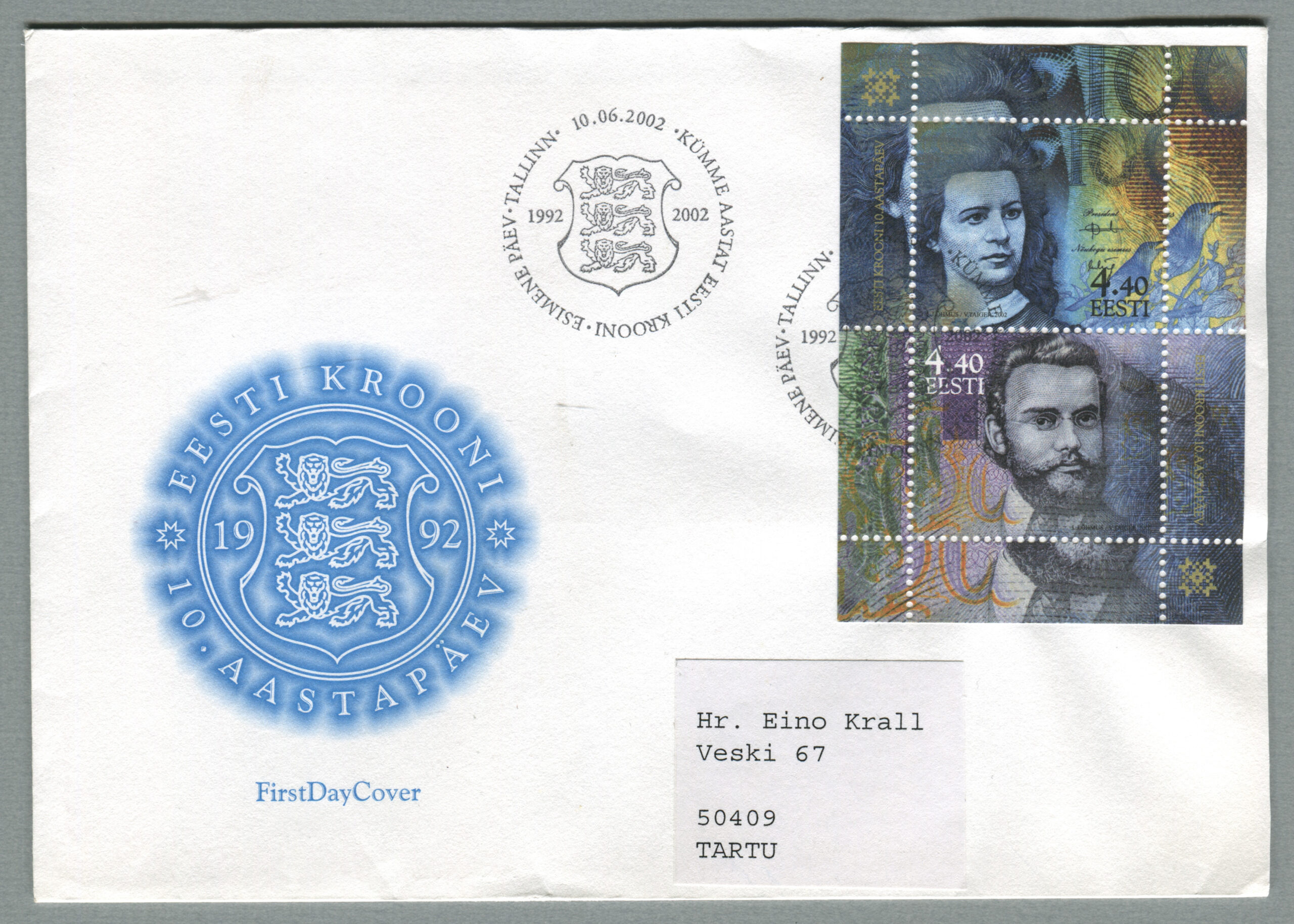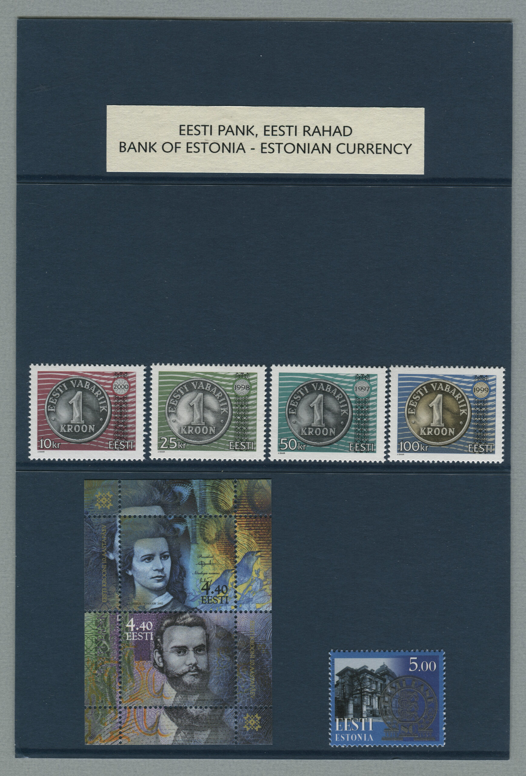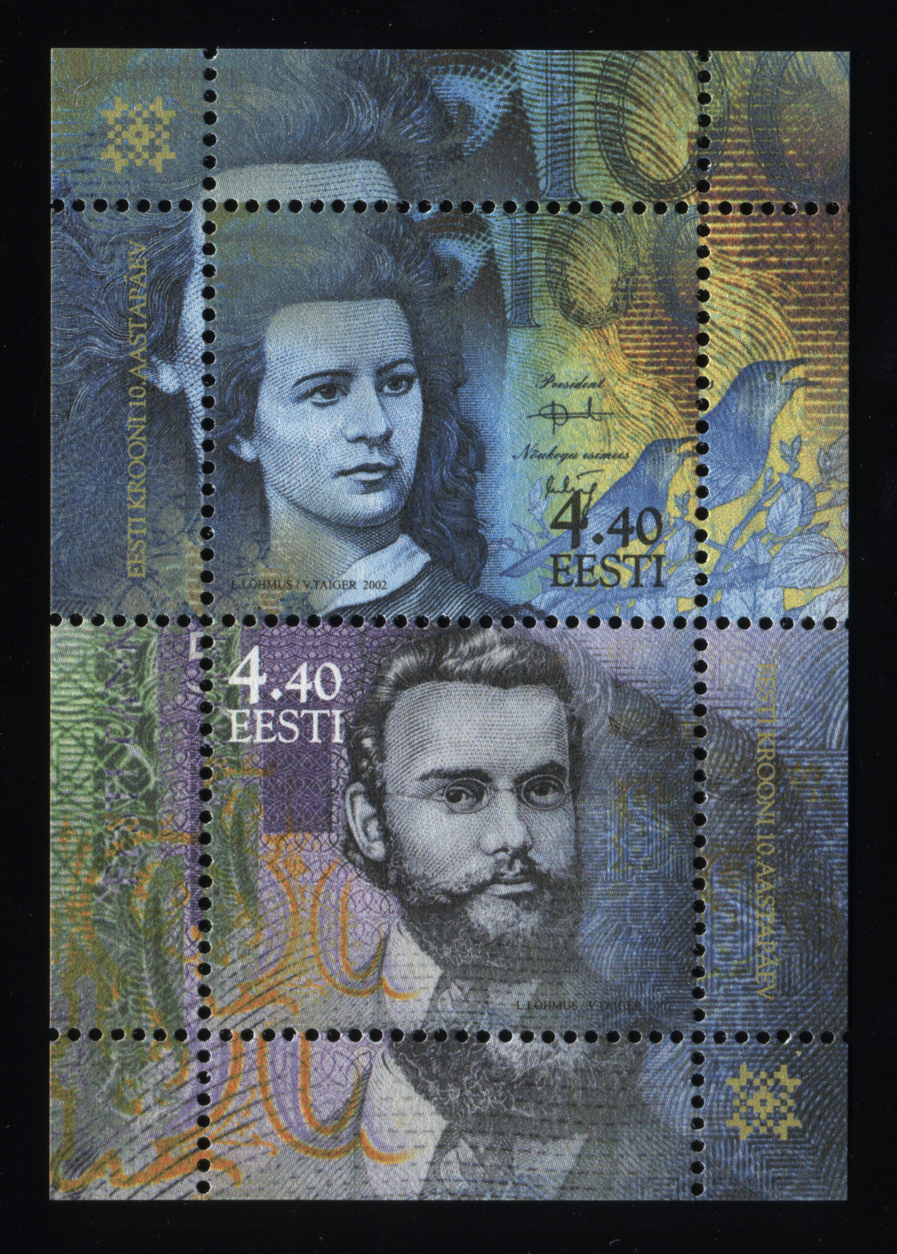 Erakogu„10 aastat Eesti oma raha“, margiplokk, 10.06.2002. Kunstnik Lembit Lõhmus.