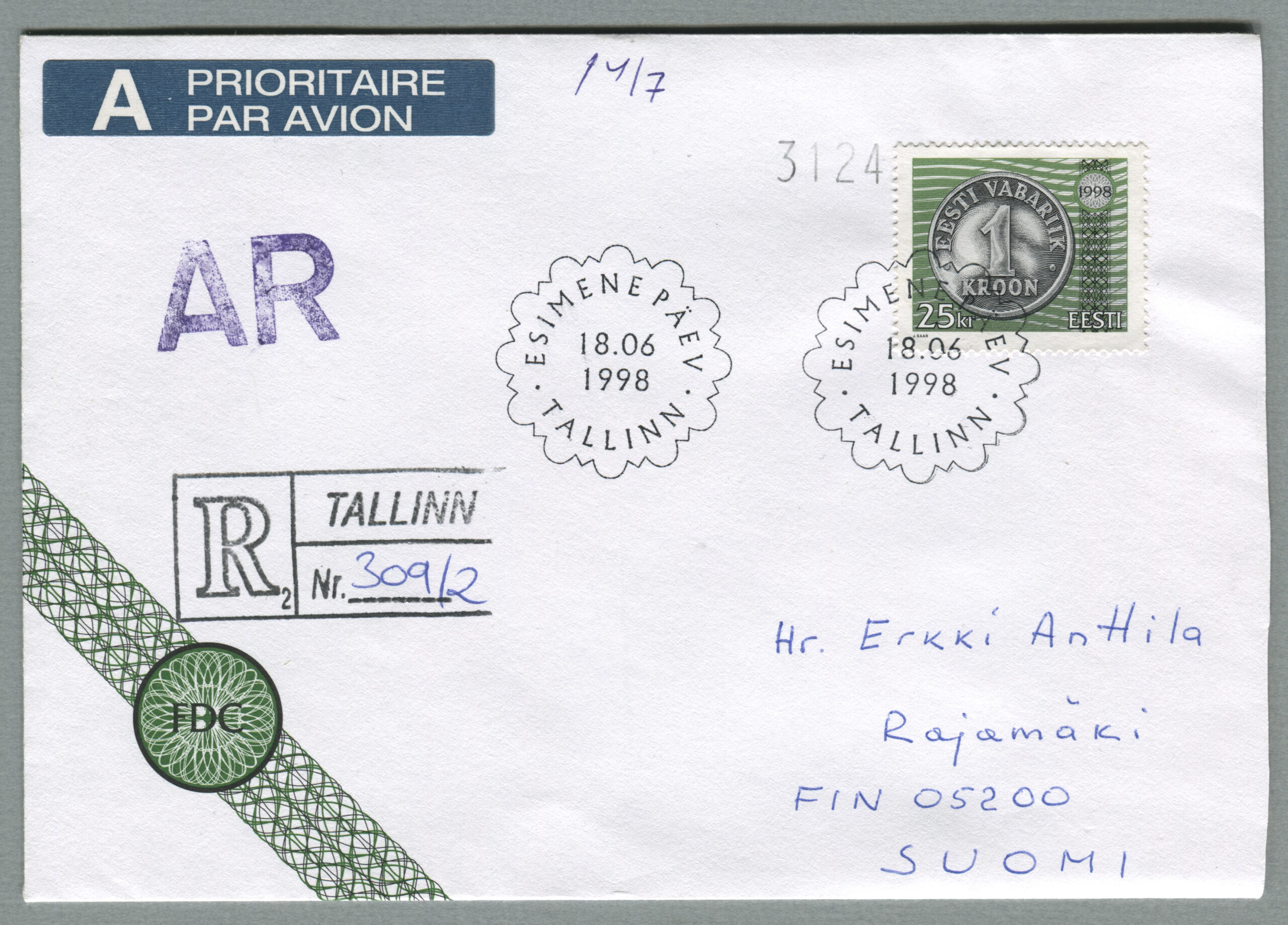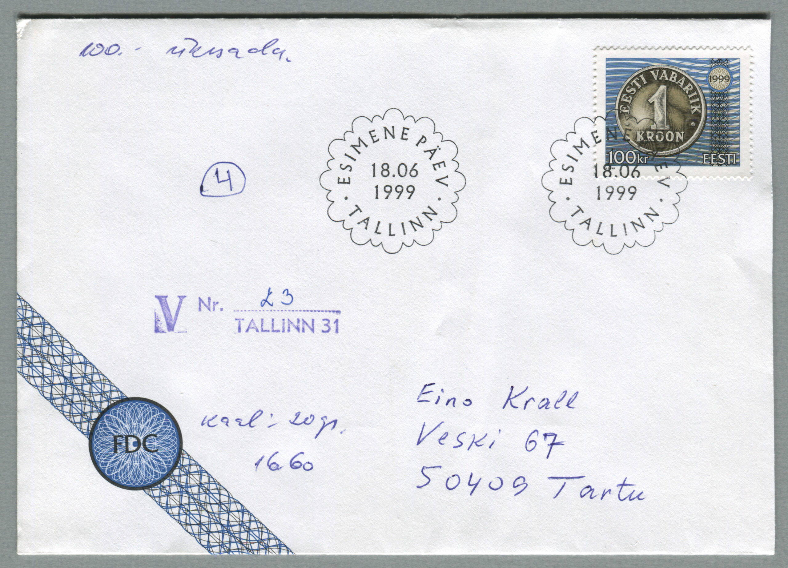 ErakoguVäärtkiri, mis on saadetud Tallinnast 18.06.1999 Tartusse.
