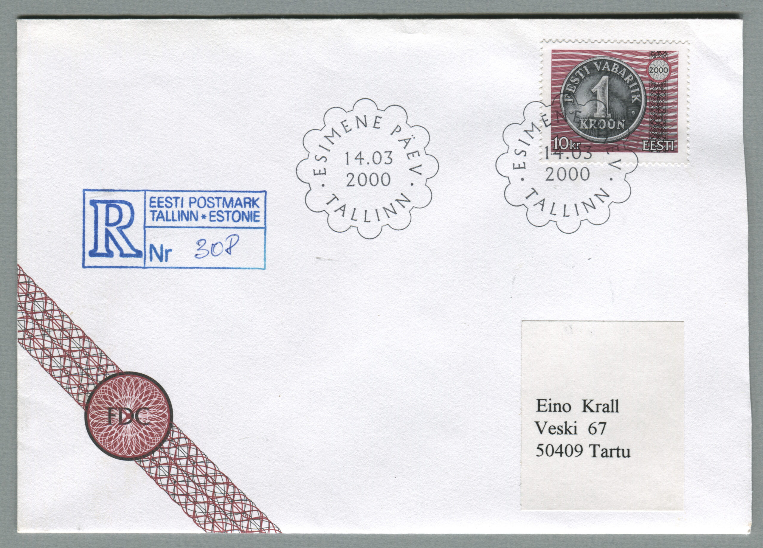ERMi koguTähitud kiri, mis on saadetud Tallinnast 14.03.2000 Tartusse.