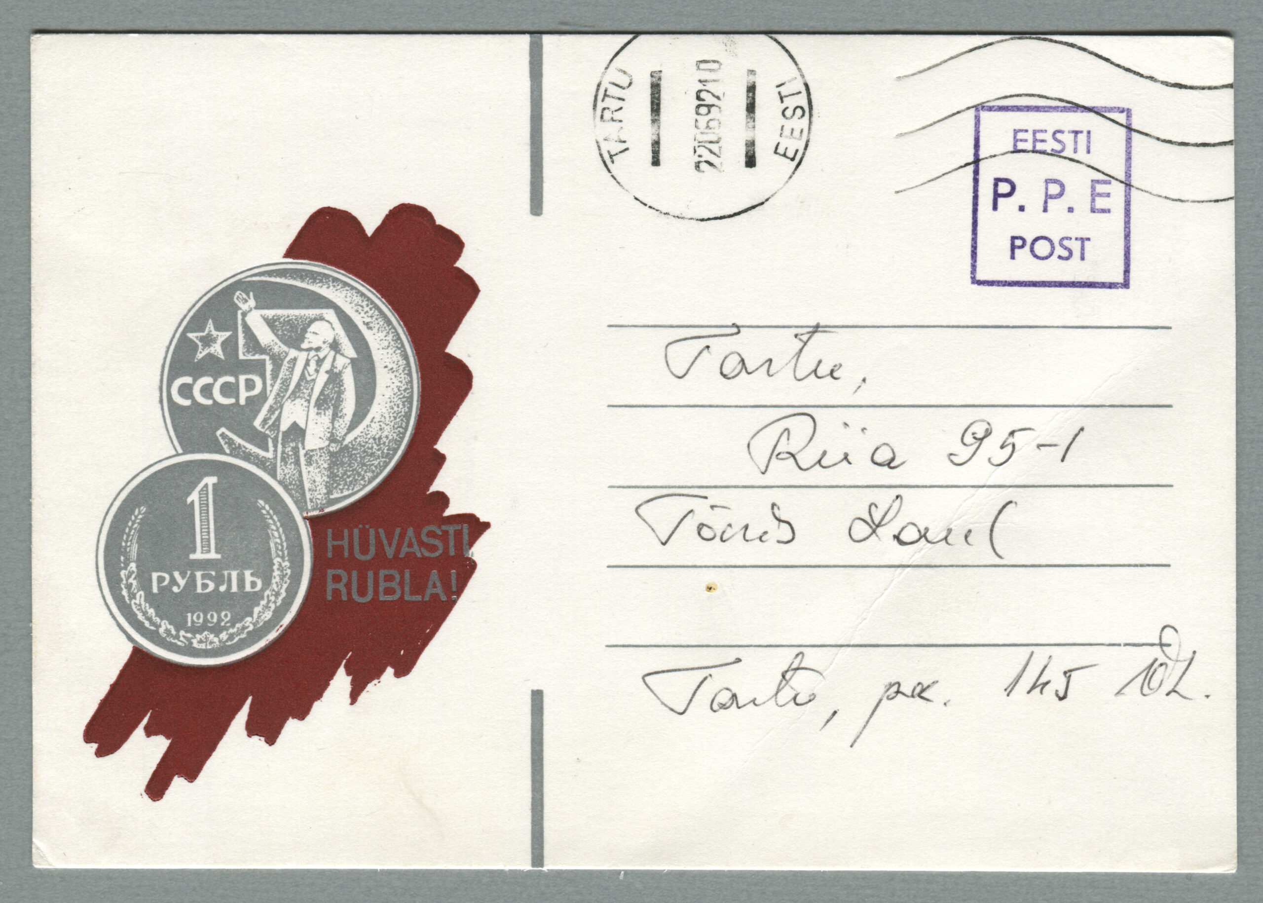 ErakoguEratervikasi „Hüvasti, rubla“. Kujundaja Marvi Saar, tellija Ülo Laul, postkaart, tiraaž 500 (18.03.1992). Lilla käsitempel „P.P.E“.