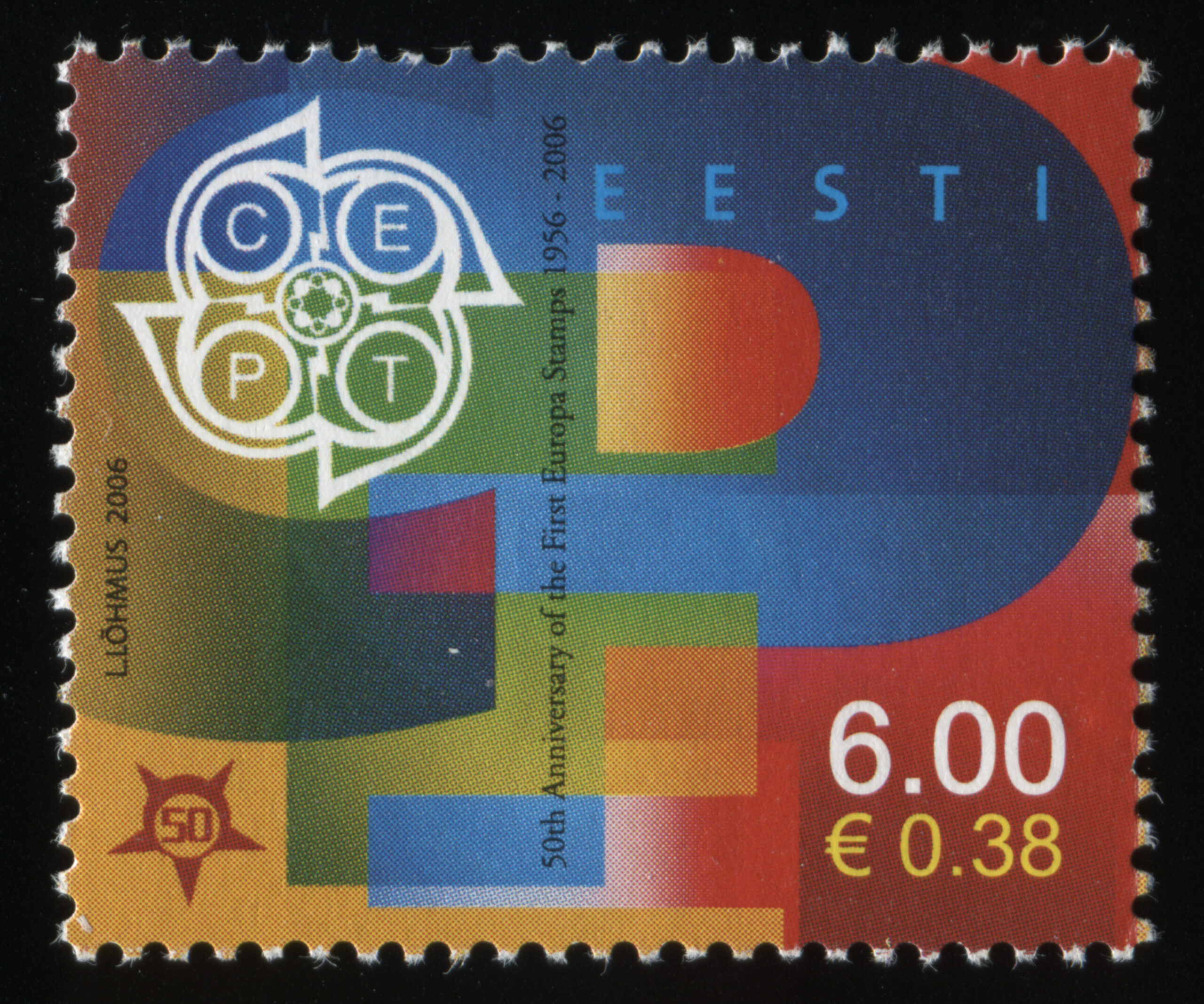 ERMi koguEUROPA postmark 50, 4.01.2006. Kunstnik Lembit Lõhmus. Markidel, mis ilmusid 4.01.2006–25.11.2010, oli kohustuslikult kaks nominaali (kroon ja euro).