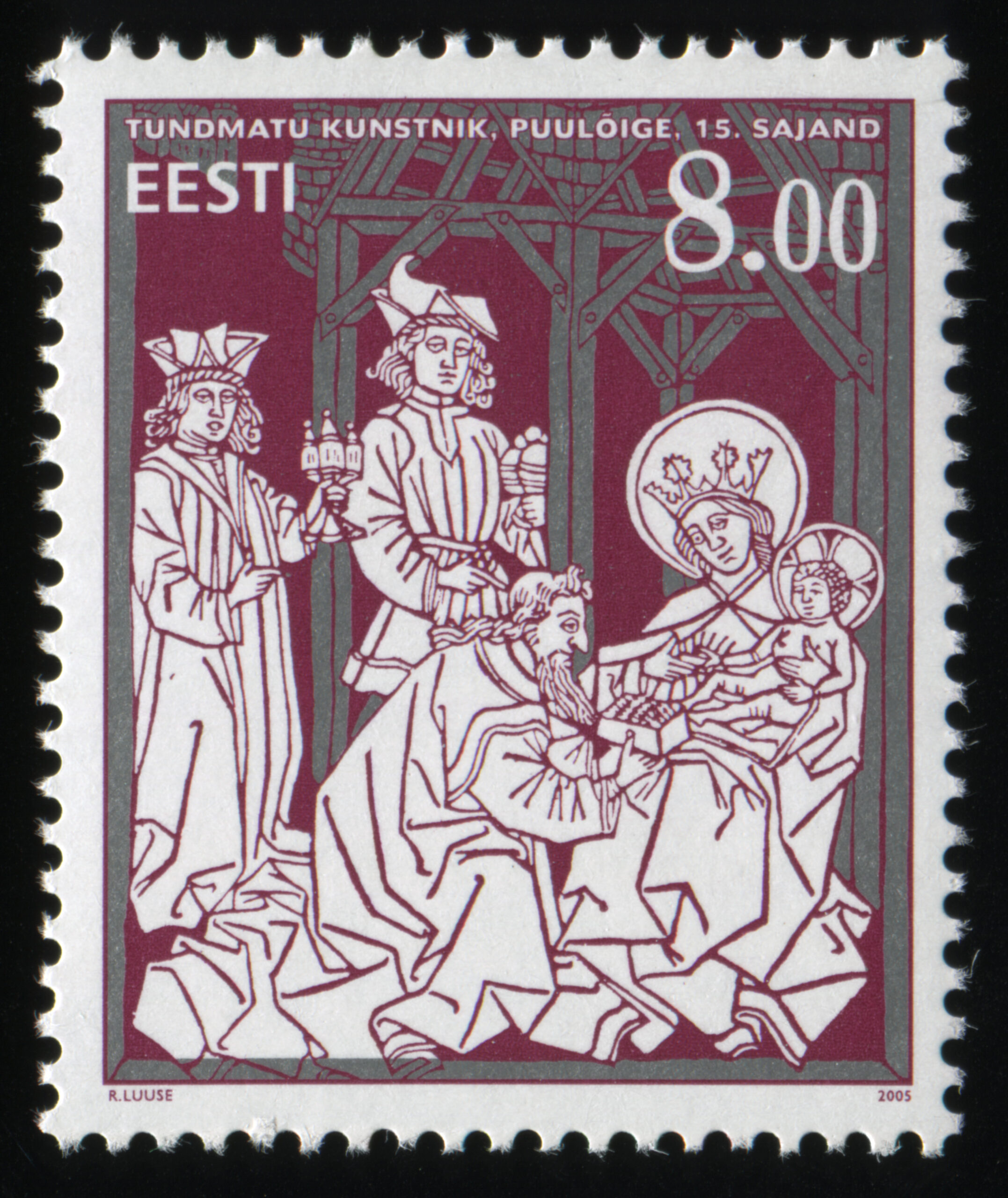 ERMi kogu„Jõulud“, 22.11.2005. Kunstnik Riho Luuse. Viimane kroonivääringus mark. Margil on tundmatu autori puulõige „Kuningad Jeesuslast kummardamas” (fragment) 15. sajandist, mille üks tõmmis asub Tartu Ülikooli raamatukogus.