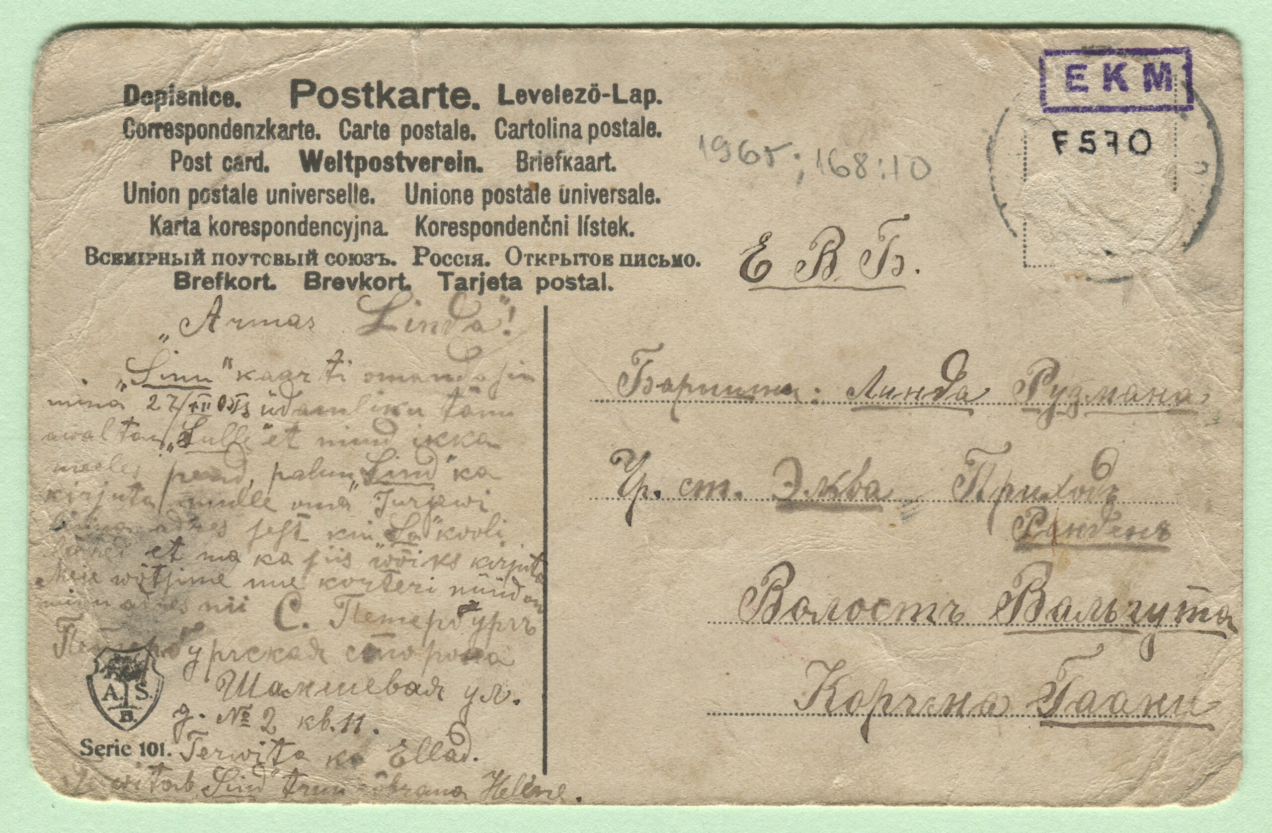 ERMi koguPostkaart saadetud 1907. aastal