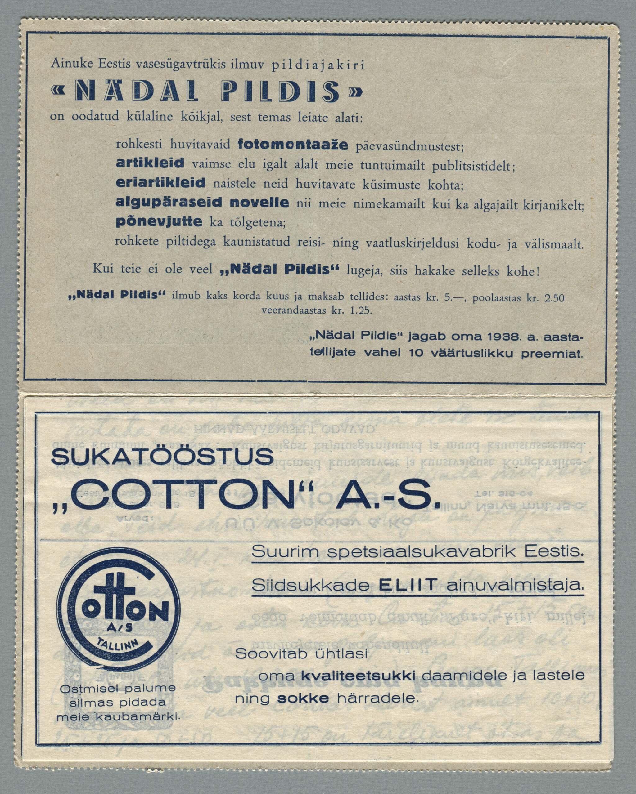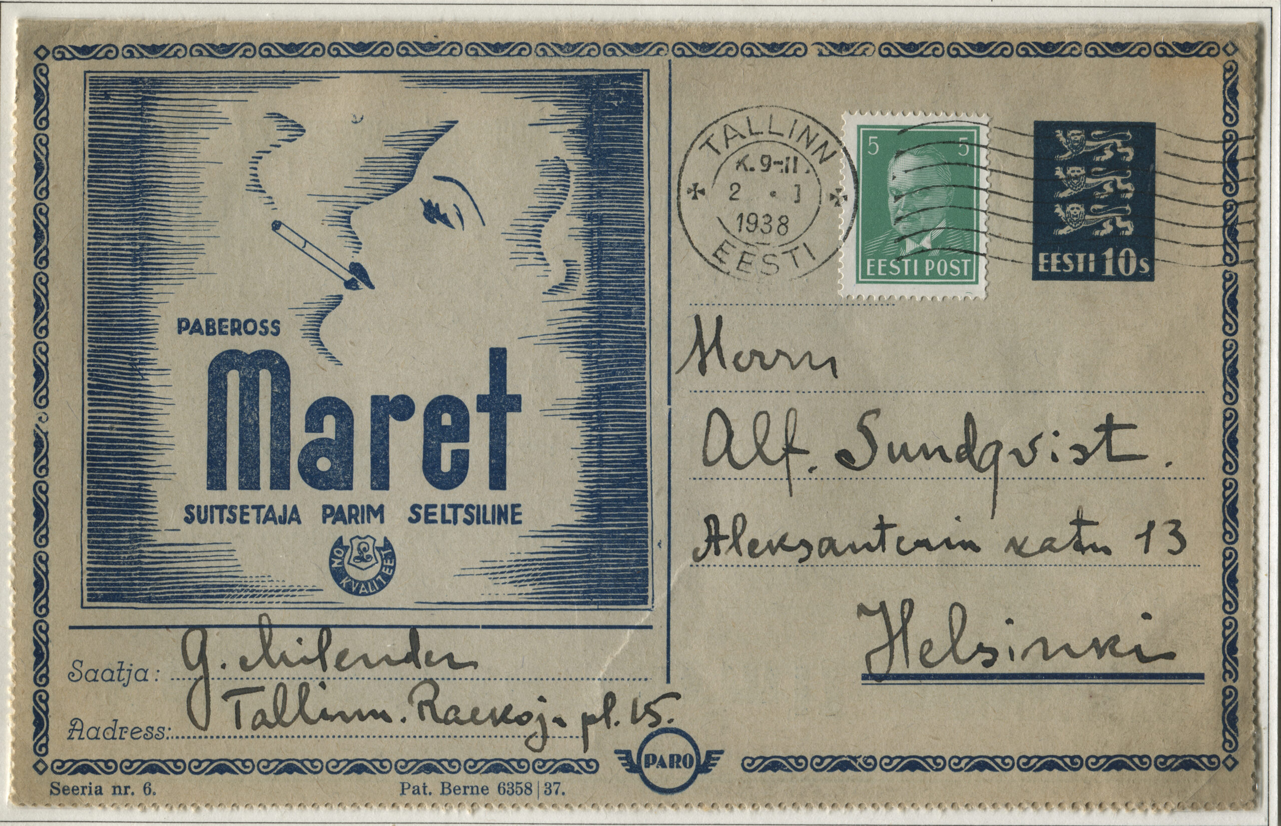 ERMi koguKaartkiri (seeria nr 4), mis on saadetud 31.12.1938 Tallinnast Helsingisse