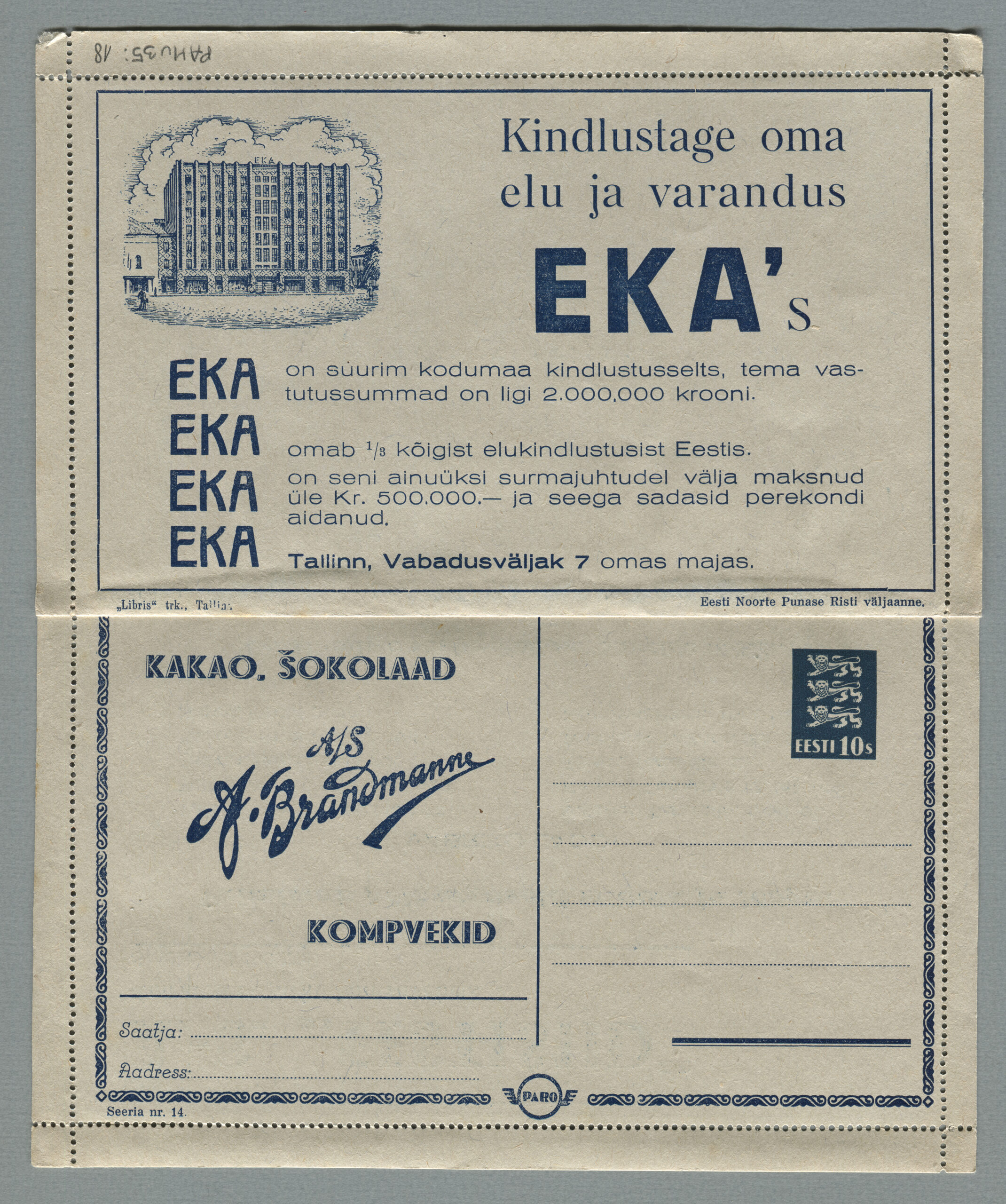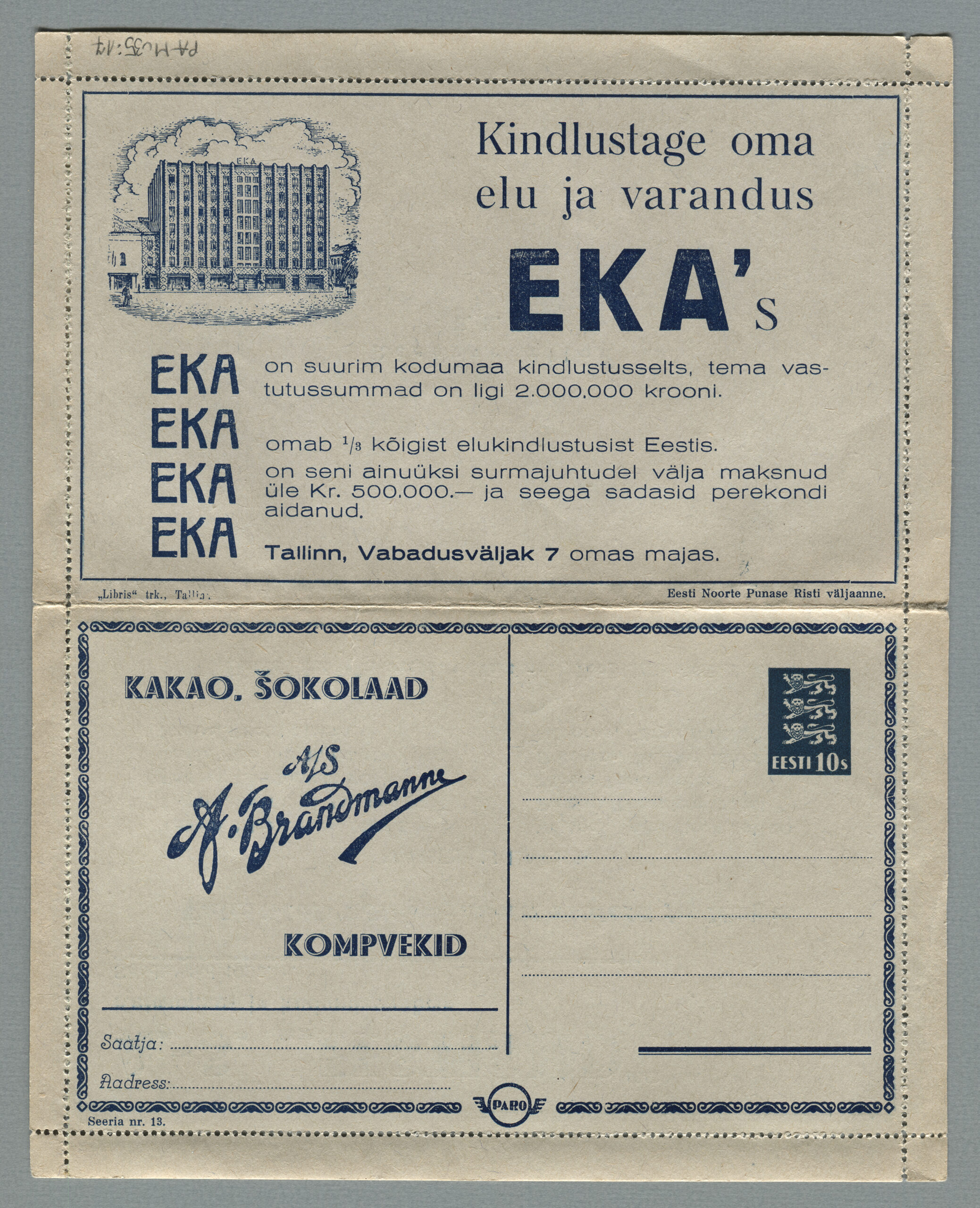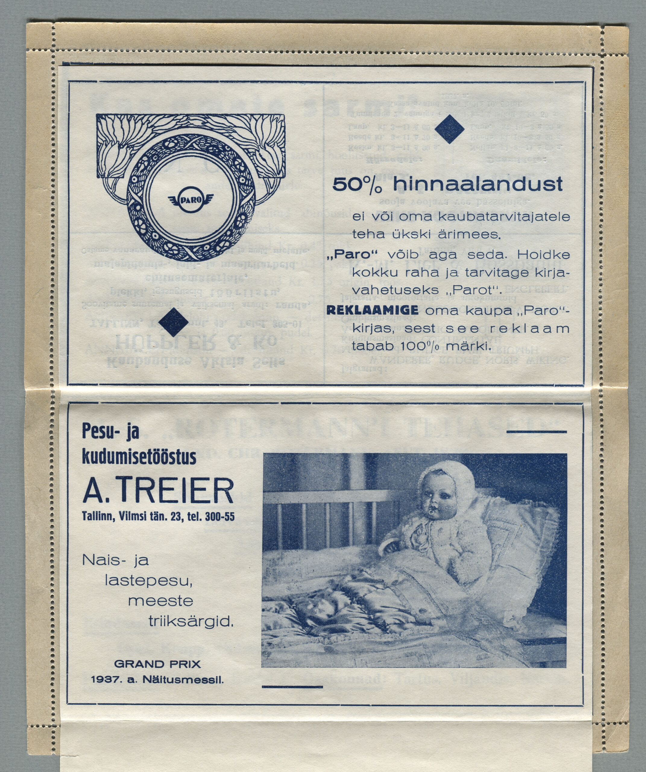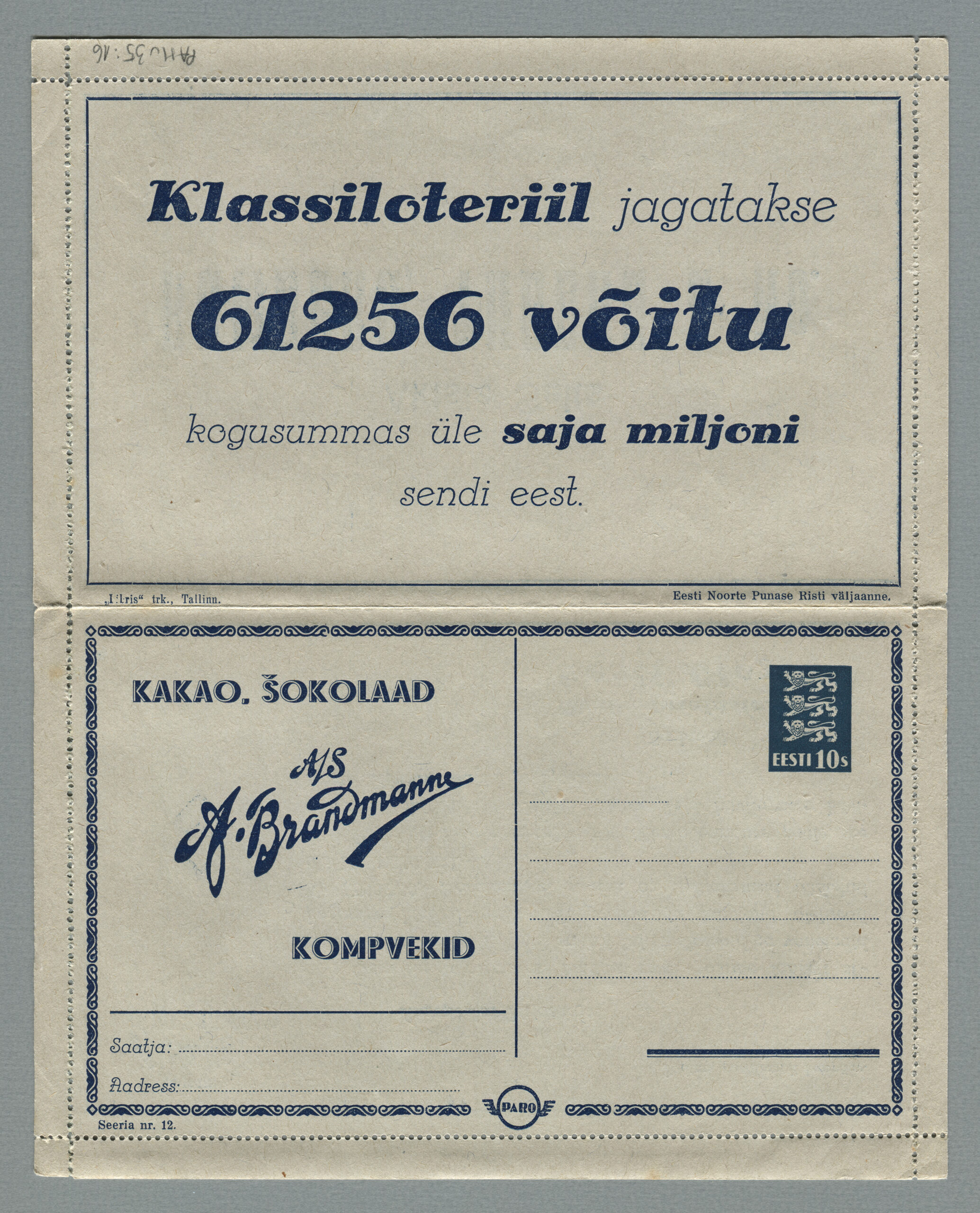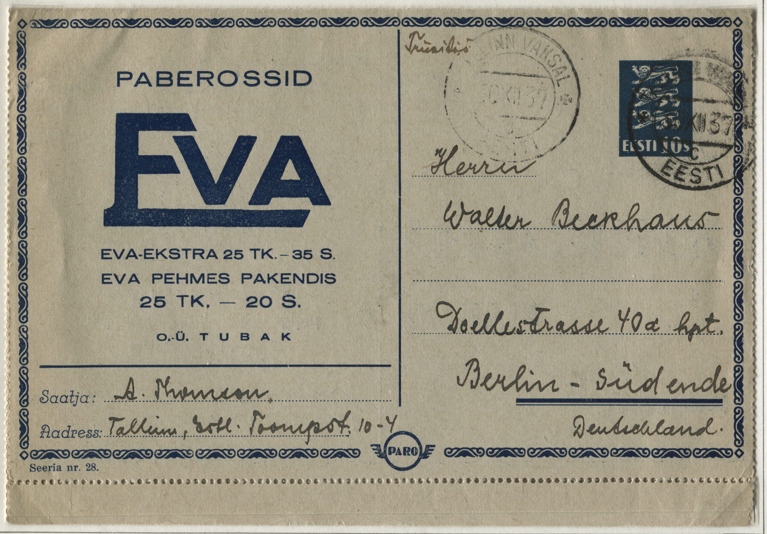 Ideena polnud reklaamiga varustatud tervikasjad tegelikult midagi uut. On teada, et neid esines Tsaari-Venemaal, ka mujal. Mõnel kaartkirja seerial (nr 2, 5, 6, 18) on märgitud Pat. Berne 6538/37, millest võib järeldada, et idee oli patenteeritud.