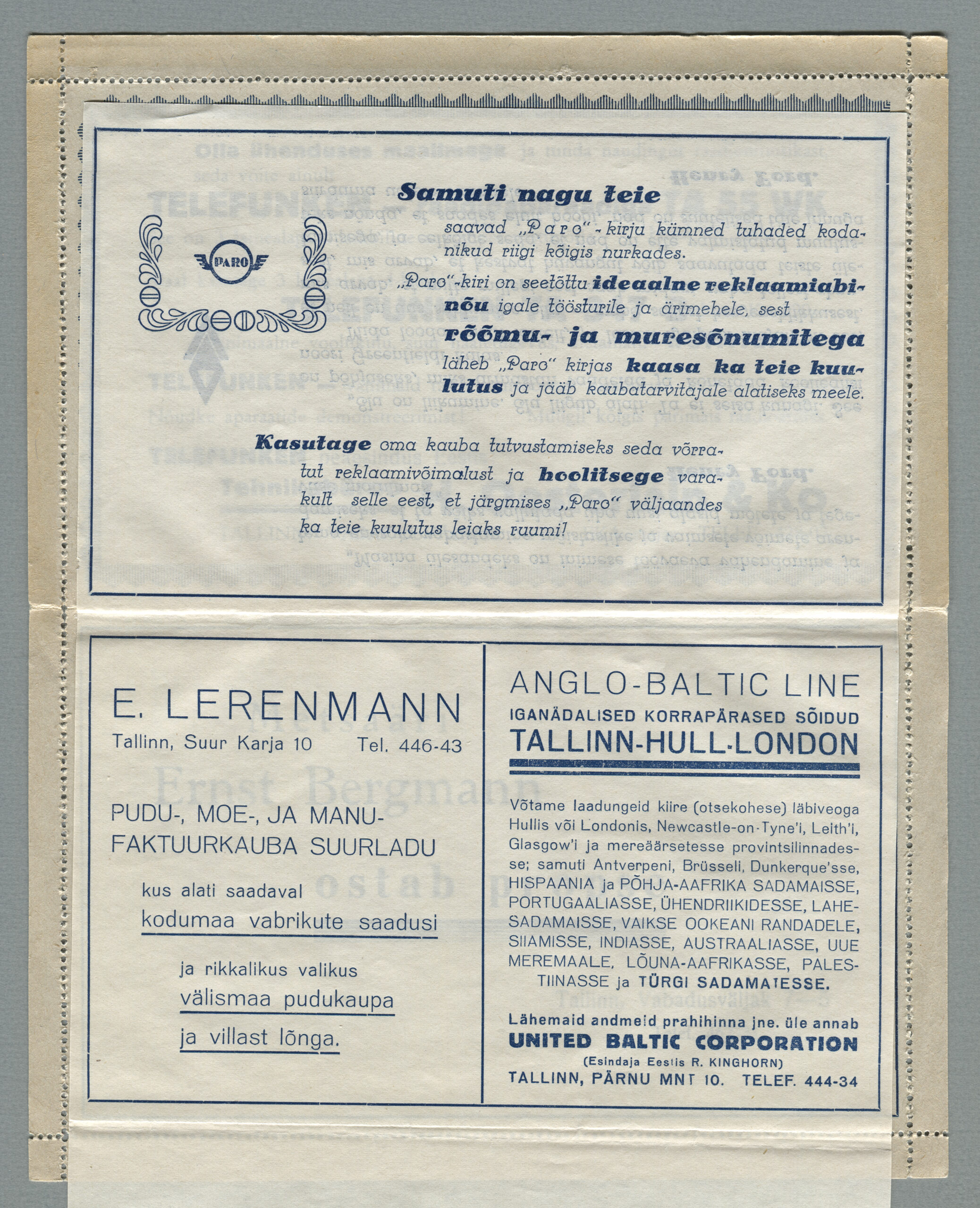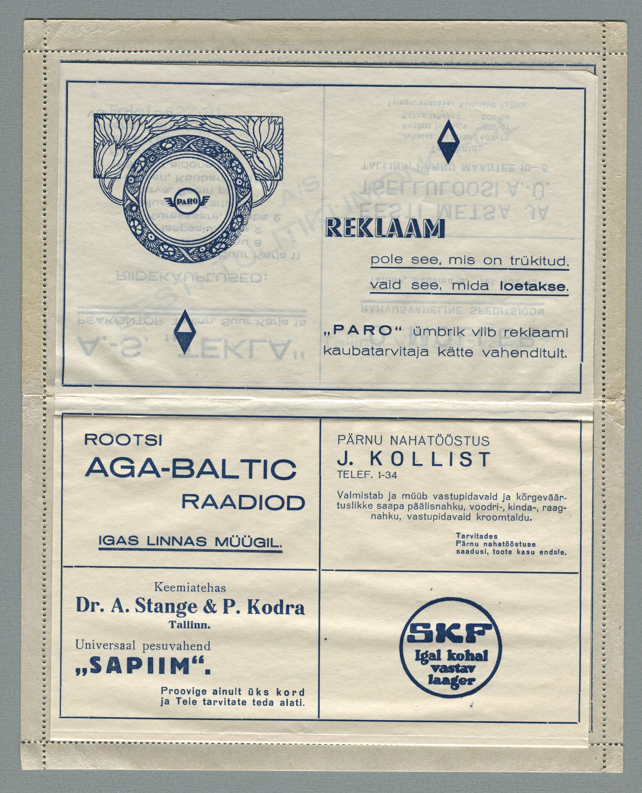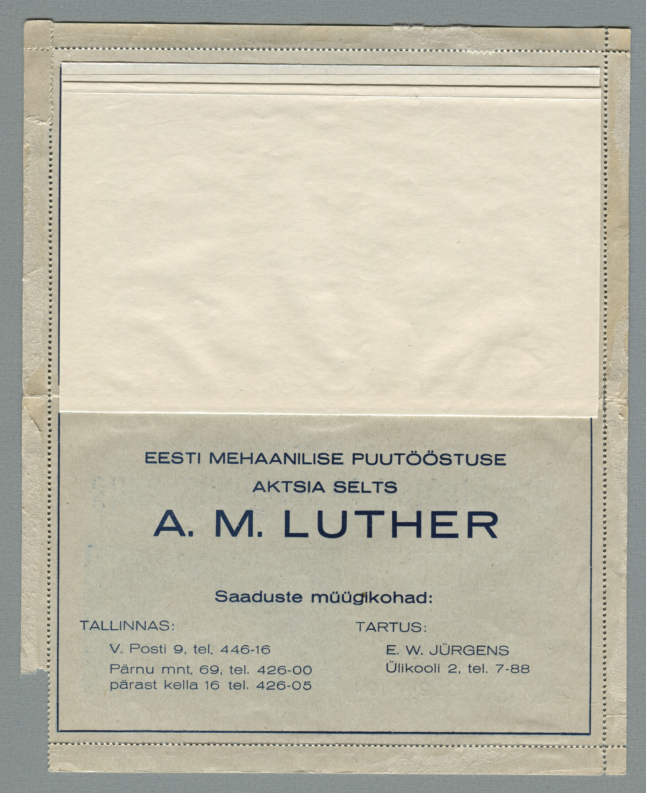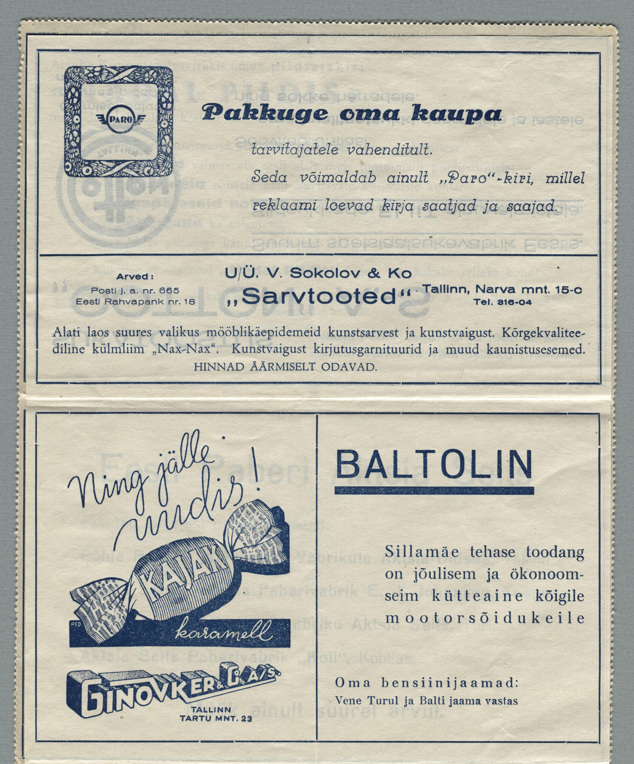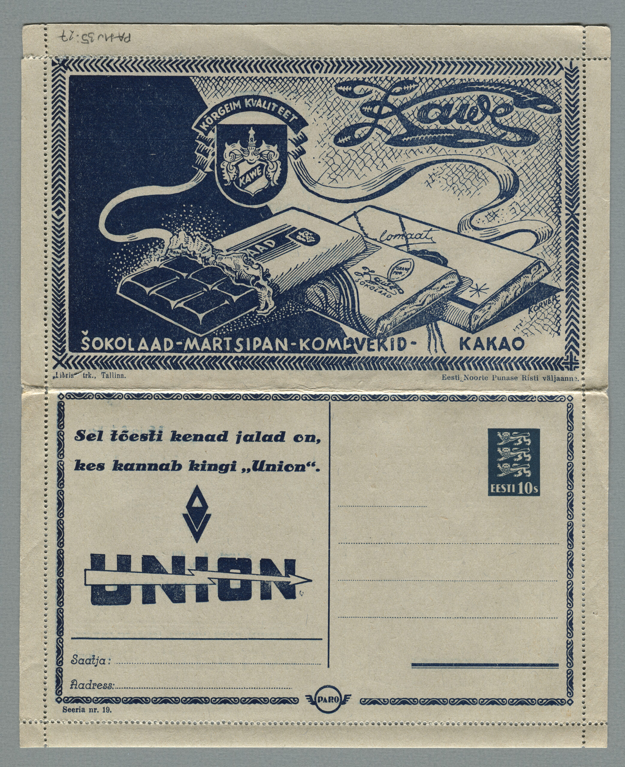 Ideena polnud reklaamiga varustatud tervikasjad tegelikult midagi uut. On teada, et neid esines Tsaari-Venemaal, ka mujal. Mõnel kaartkirja seerial (nr 2, 5, 6, 18) on märgitud Pat. Berne 6538/37, millest võib järeldada, et idee oli patenteeritud.
