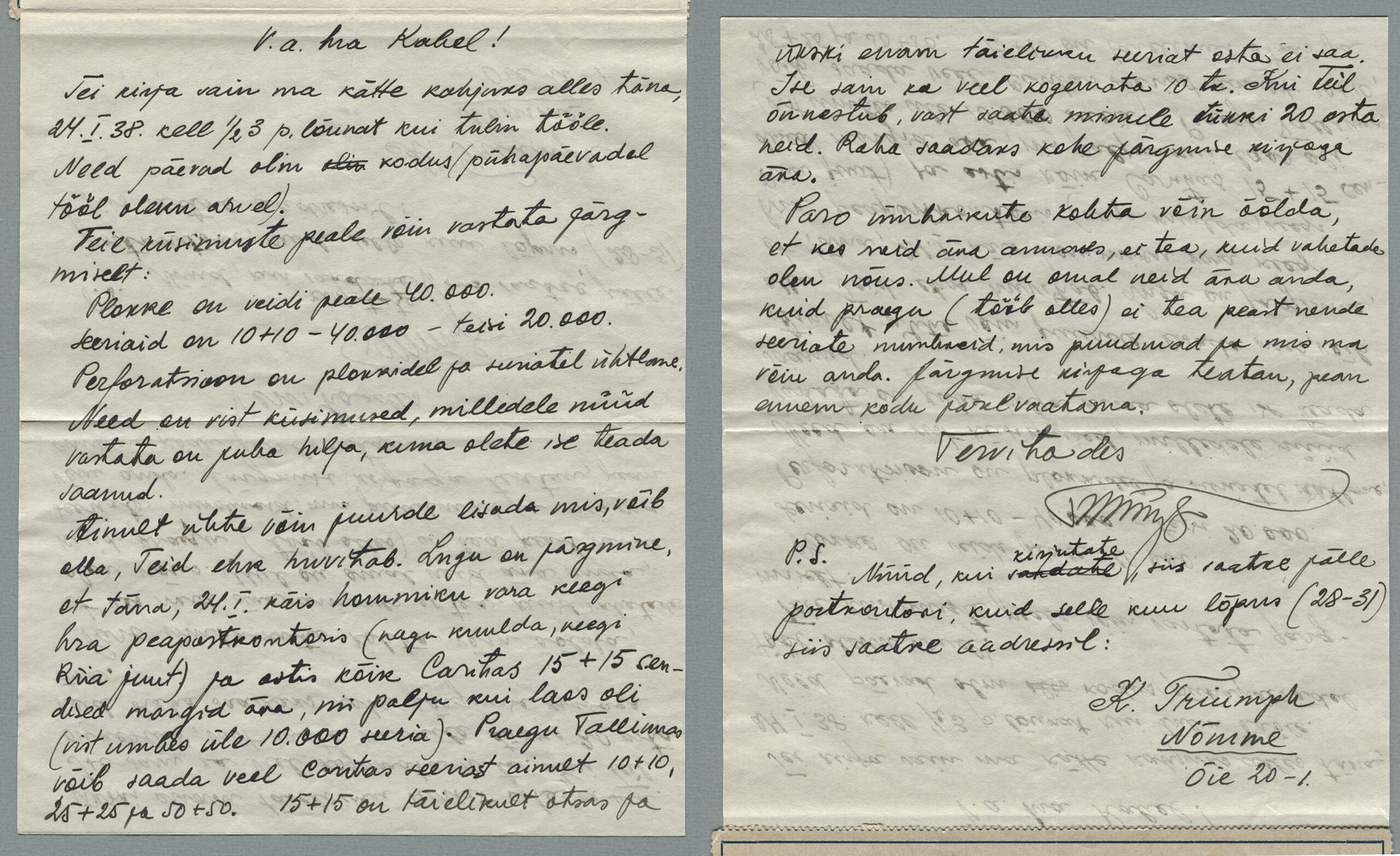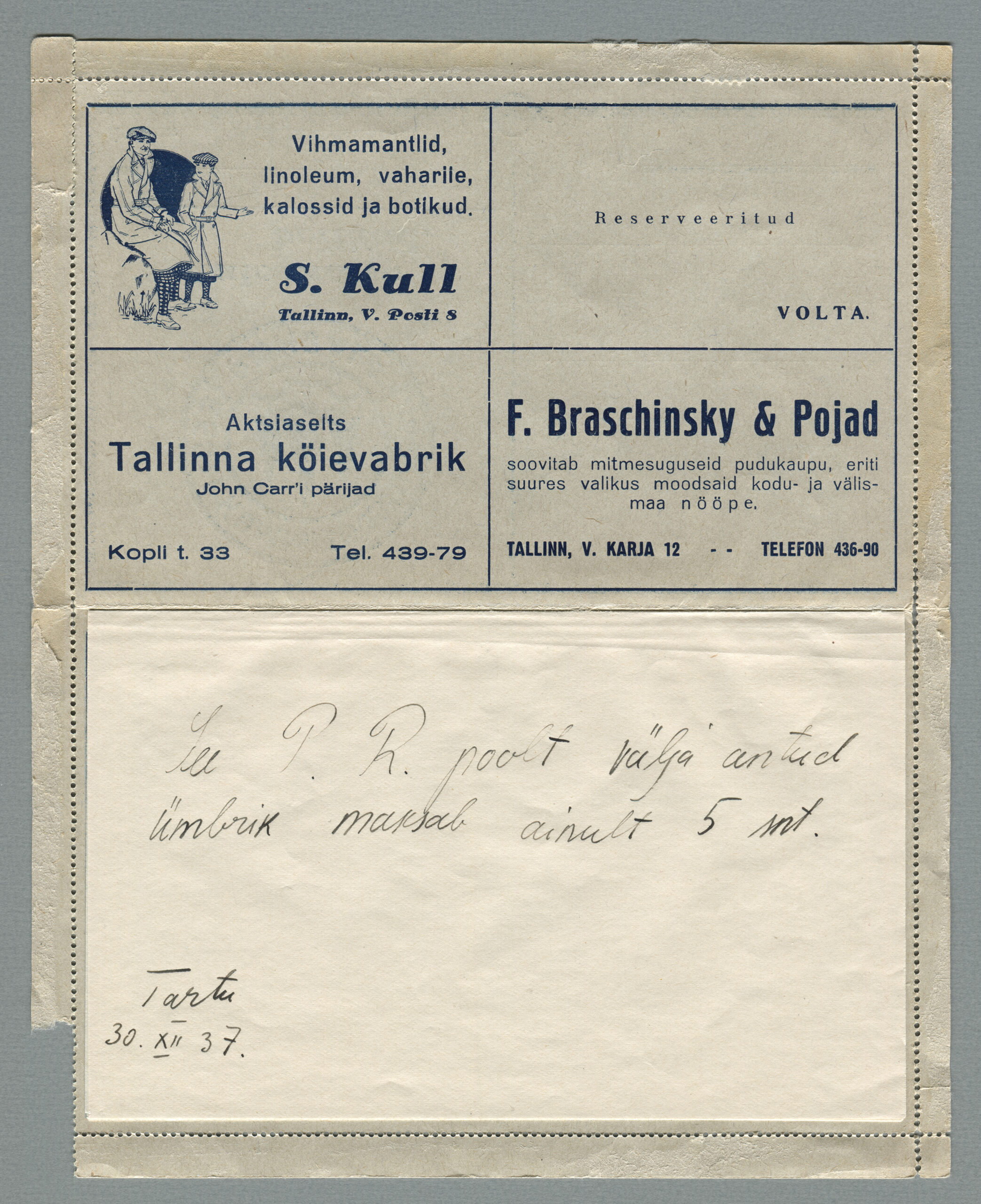 ERMi koguKaartkiri (seeria nr 6), mis on saadetud 2.01.1938 Tallinnast Helsingisse