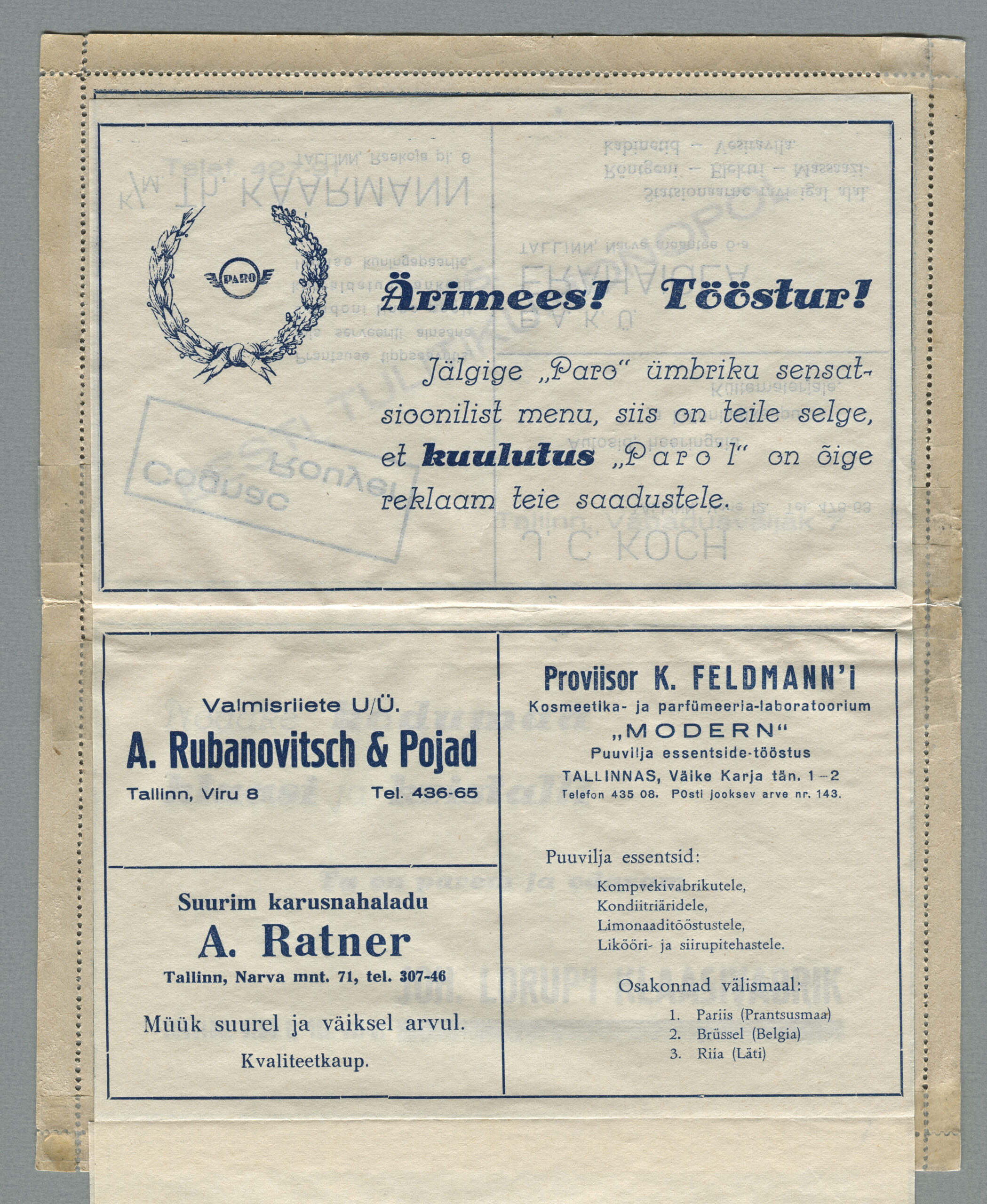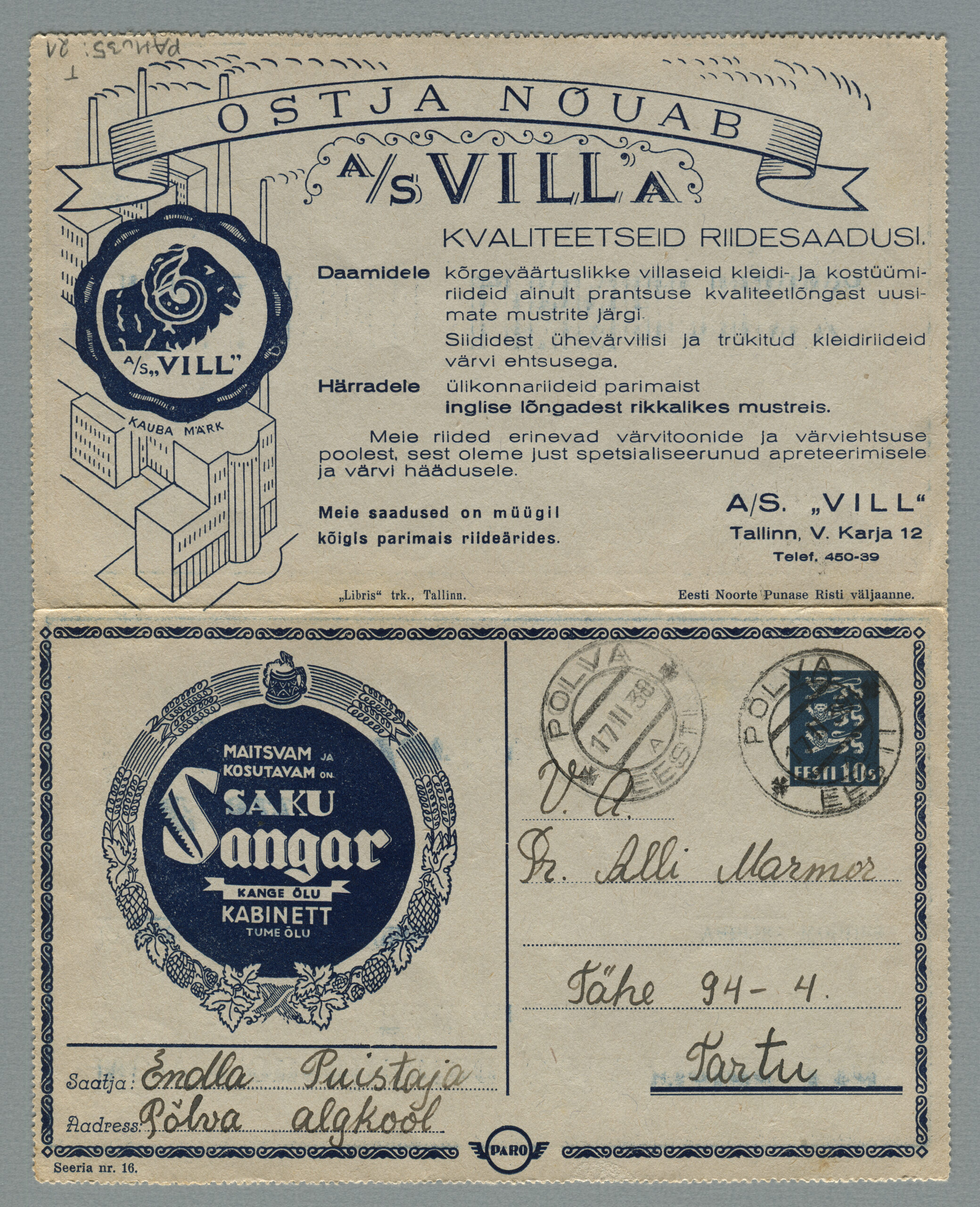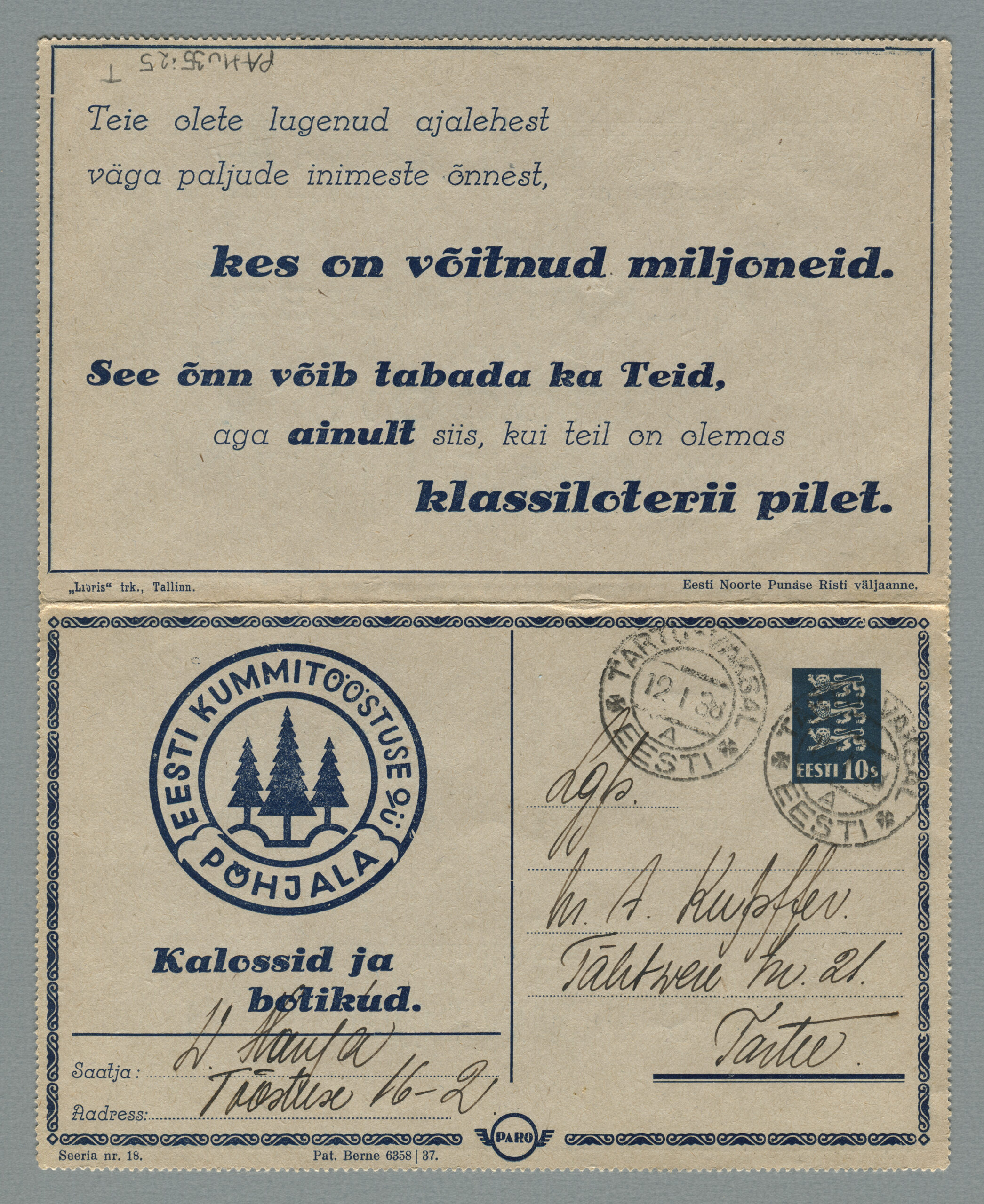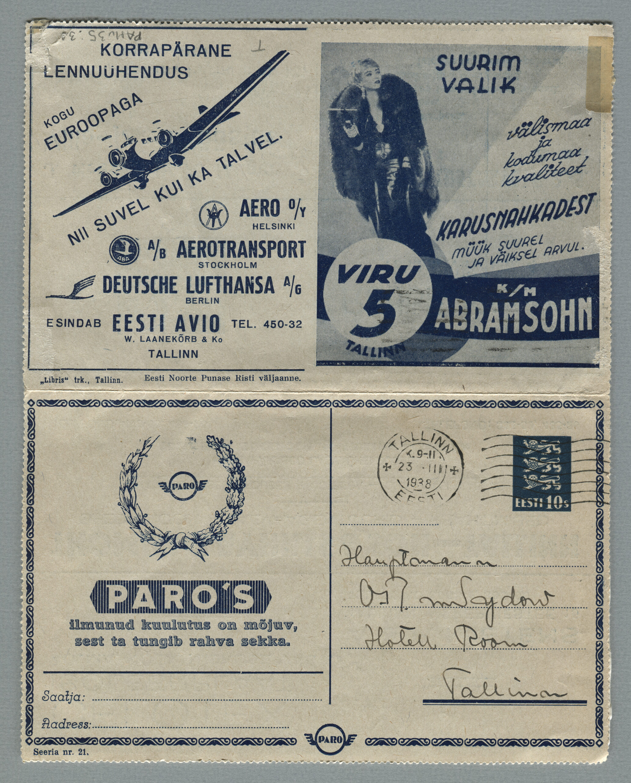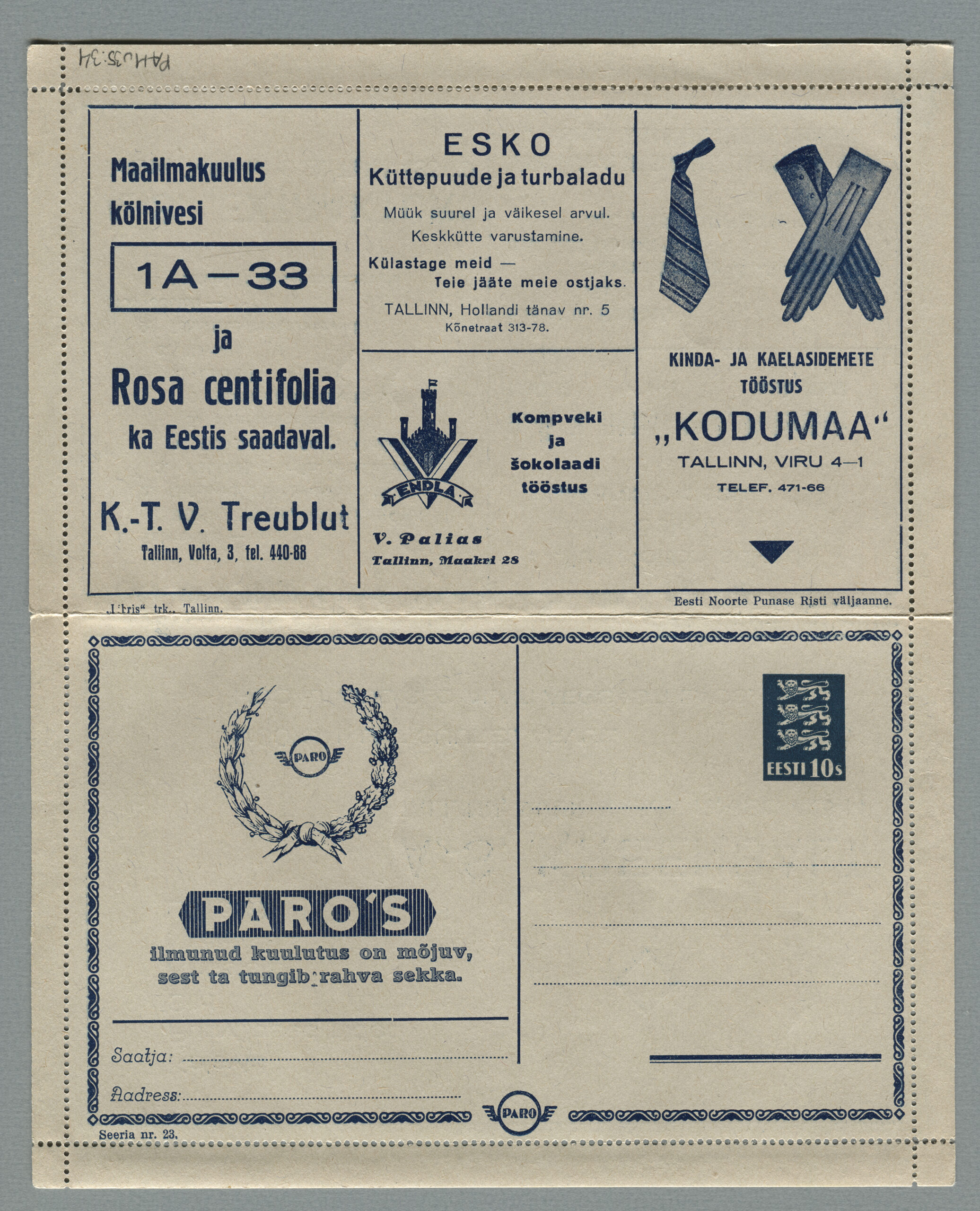 Heidame korra pilgu Paro kaartkirjade taustale. Eesti teedeministri Nikolai Viitaki määrus (Riigi Teataja nr 101, 20.12.1937, lk 1988) ütleb nii: „23. detsembril 1937 lastakse müügile ja käibele frankeeritud reklaamümbrikud Paro nimetuse all. Ümbrikud on valmistatud Eesti Noorte Punase Risti väljaandena Eesti Punase Risti poolt ja varustatud 10-sendilise postmargi kujutusega Postivalitsuse poolt.“