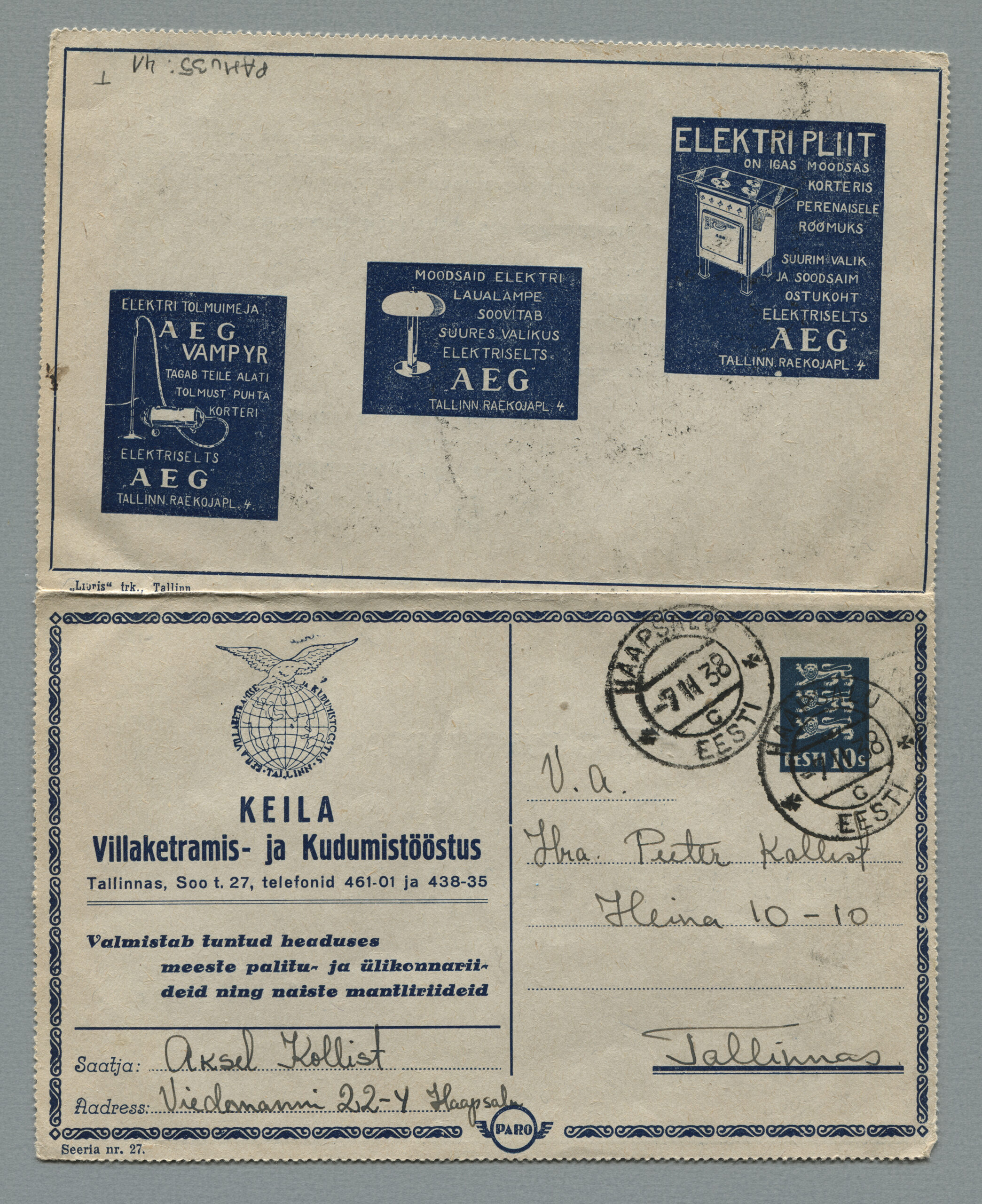 ERMi koguKaartkiri (seeria nr 5), mis on saadetud 22.11.1938 Tapalt Tallinna margiärile „Estofil“