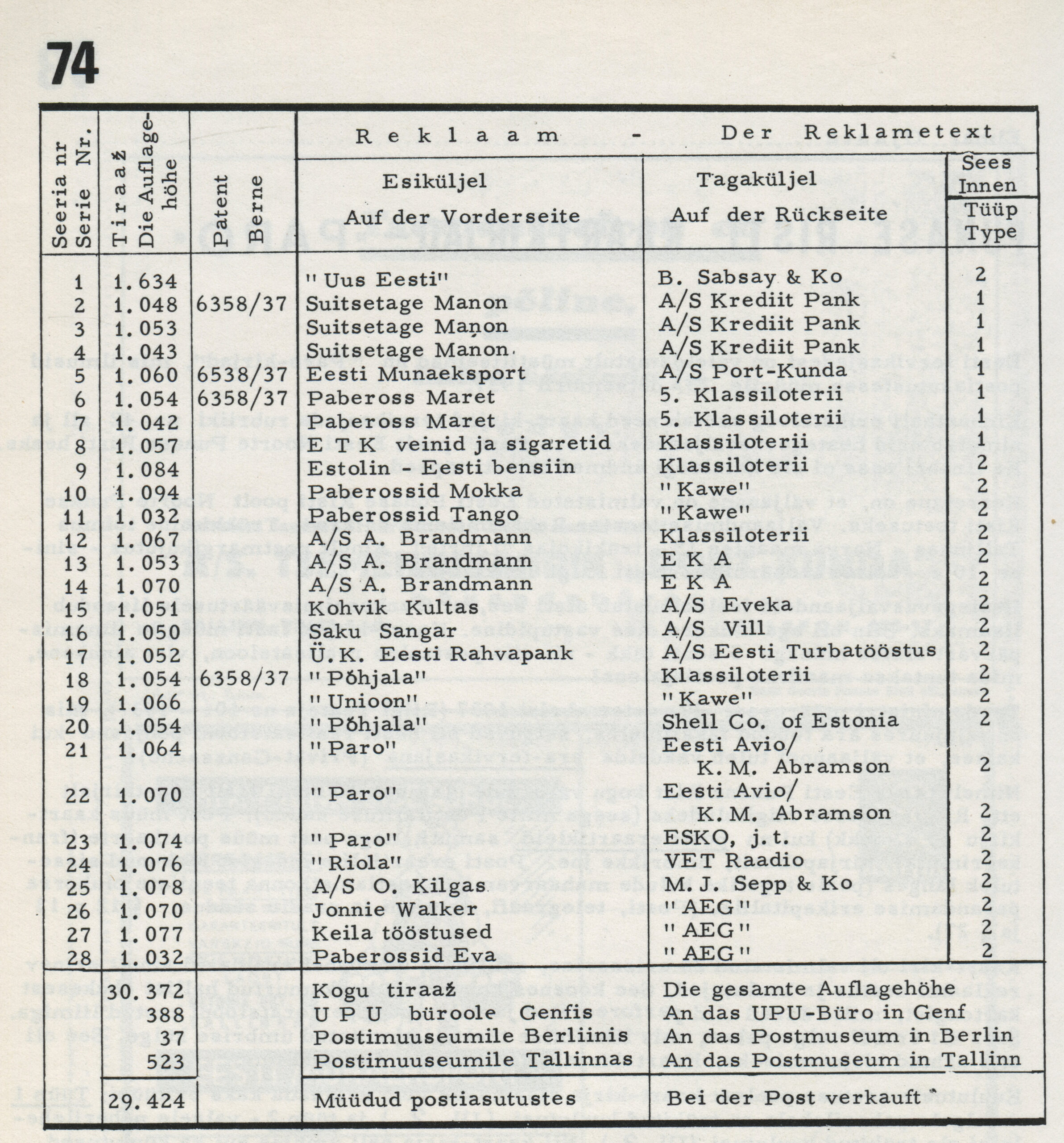 Eesti Filatelist aastast 1976 kirjutab: „Nagu tolleaegsed filatelistid jutustavad ja A. Thomson Tallinnast saksa ajakirjas „Die Ganzsache“ kirjutab, polnud kaartkirjade ostmine ilmumispäevalgi kerge ülesanne. Näiteks polevat seeria nr 15 (kohvik „Kultase“ reklaamiga) üldse Tallinnas müügil olnud! Teadagi on kaartkirju nüüd väga raske tabada ja kogujad, kes omavad kõik 28 eriseeriat, võivad endid õnnelikuks pidada. On ilmne ja loomulik, et kaartkirjad suuremas enamikus osteti kogujate poolt ja talletati puhtalt. Seepärast siis on neid kulgemisajal postaalselt (ja tarbekirjana) kasutatuna väga raske leida.“ (nr 18/19, lk 74)