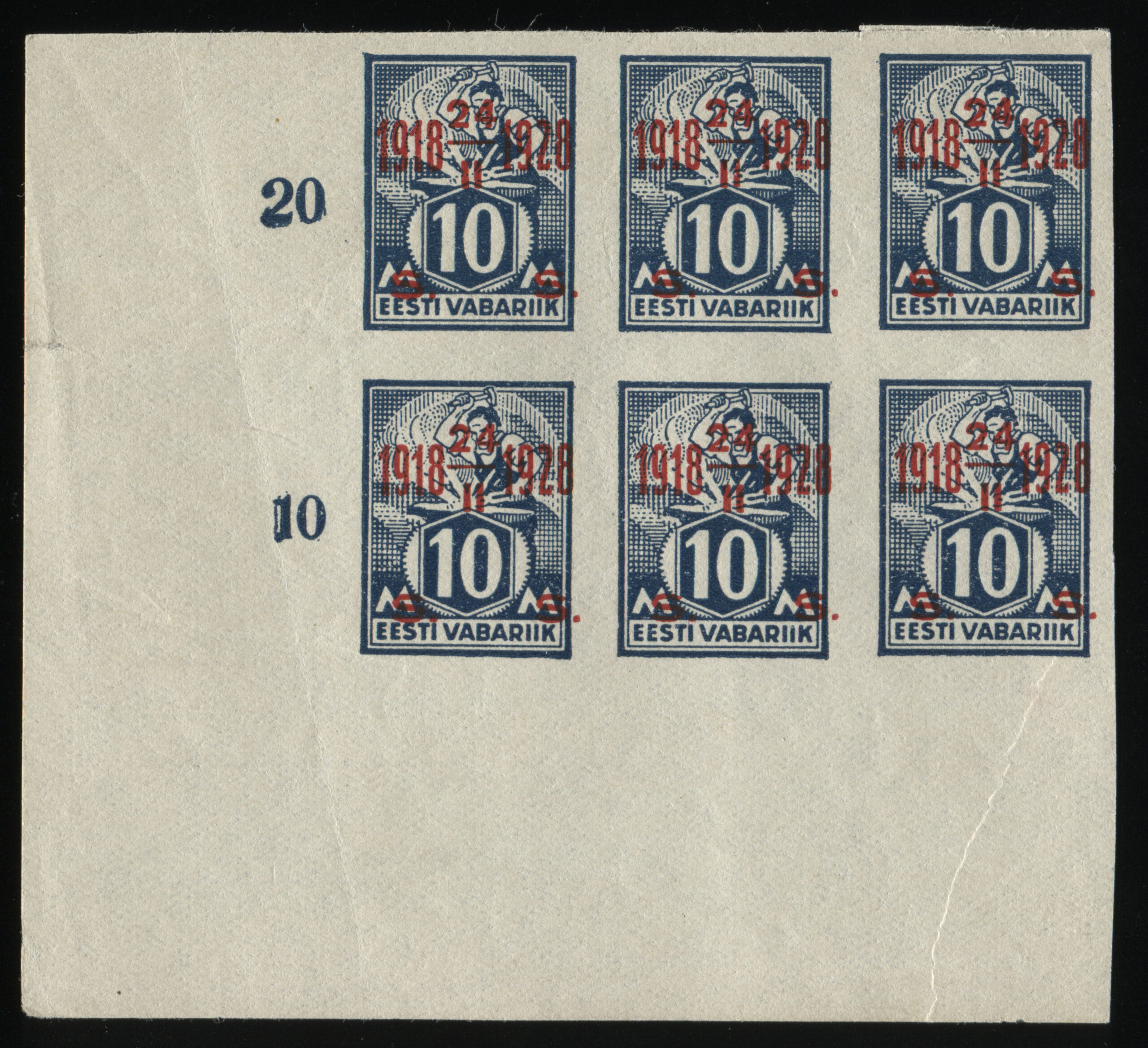 ERMi koguSepp, Eesti Vabariigi 10. aastapäeva tähistava ületrükiga „24.02.1918–1928“, 10 s / 10 m, hammastamata margipoogna lõigend