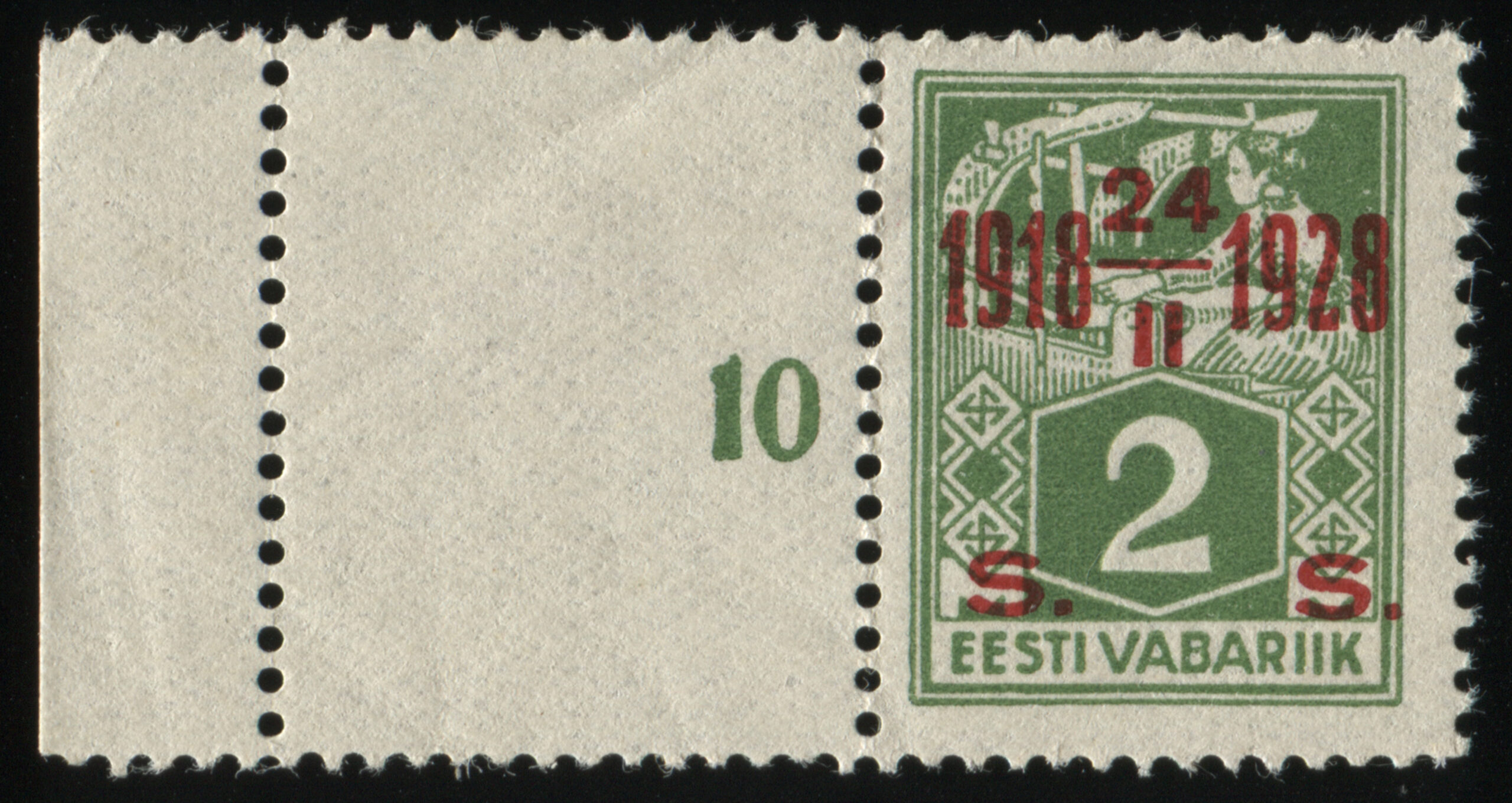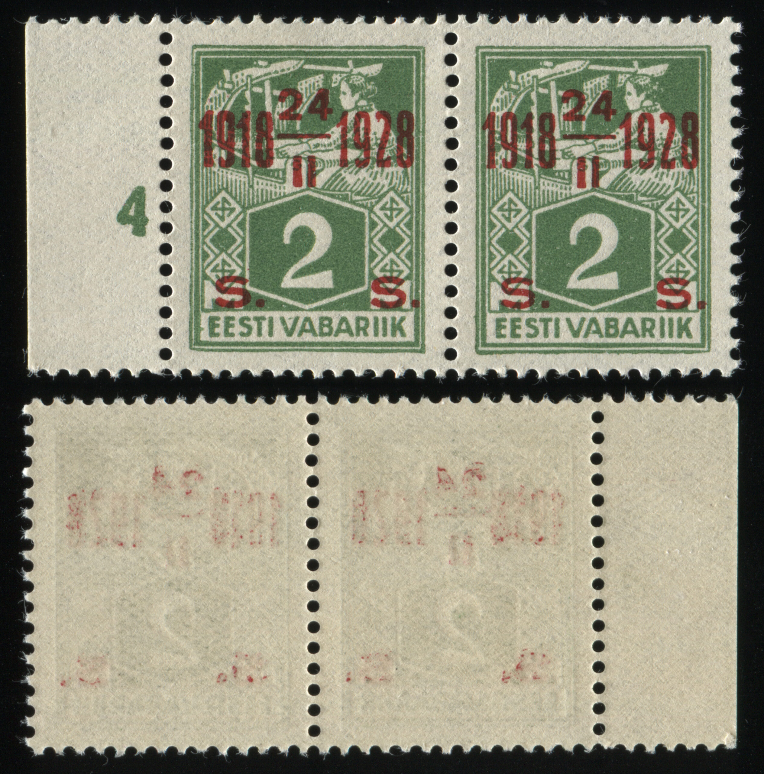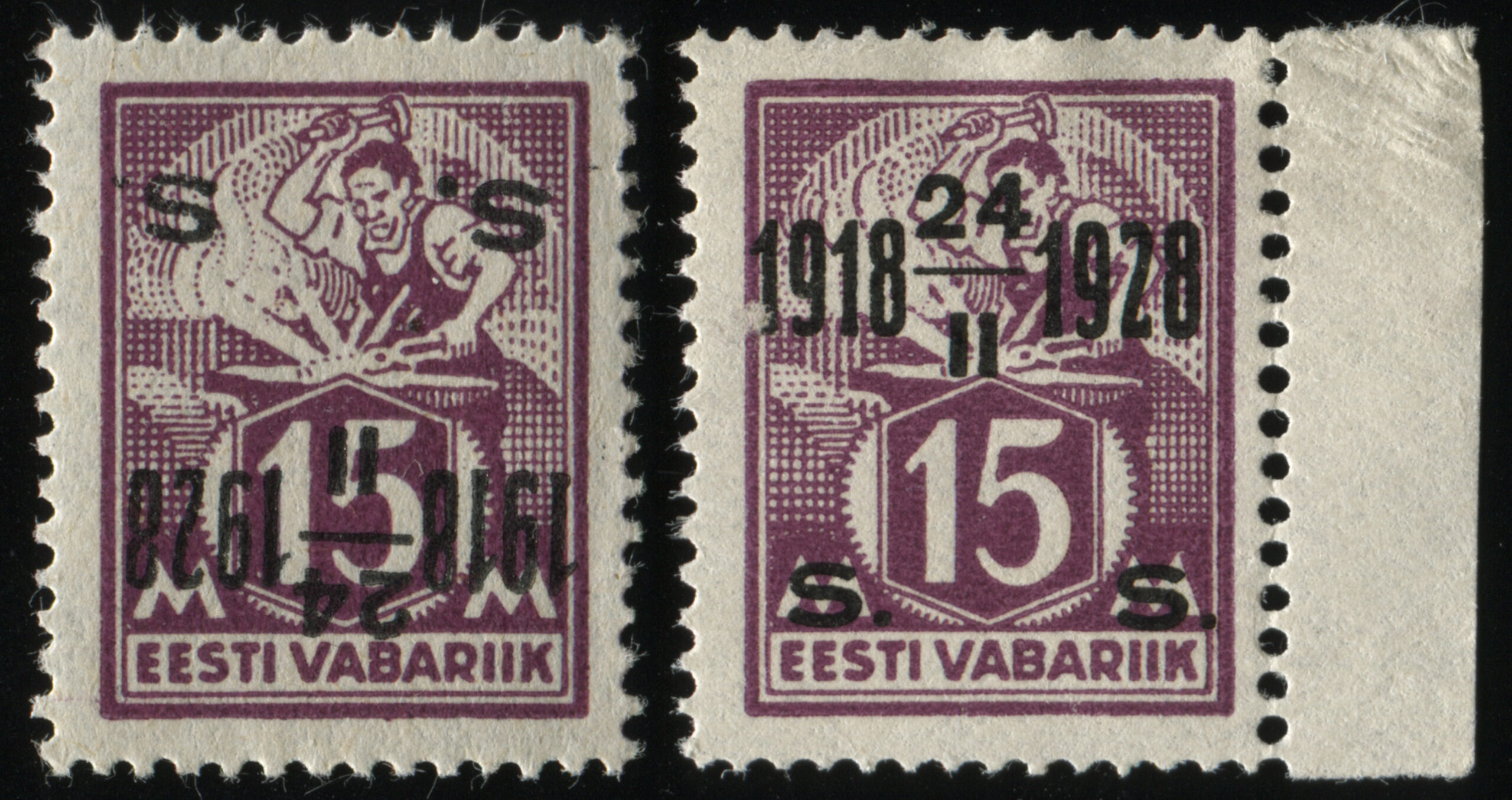 ErakoguSepp, Eesti Vabariigi 10. aastapäeva tähistava ületrükiga „24.02.1918–1928“, 15 s / 15 m, vasakul margi ületrükk (tagurpidi).