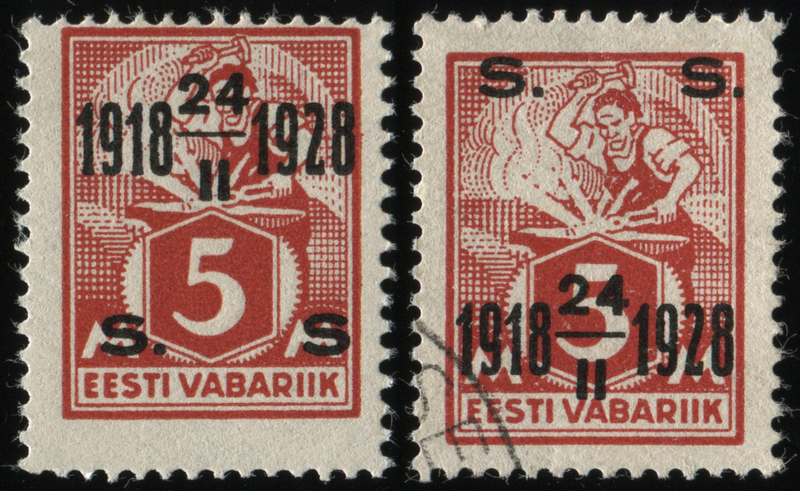 ERMi koguSepp, Eesti Vabariigi 10. aastapäeva tähistava ületrükiga „24.02.1918–1928“, 5 s / 5 m, vasakul hammastus nihkes, paremal ületrükk nihkes