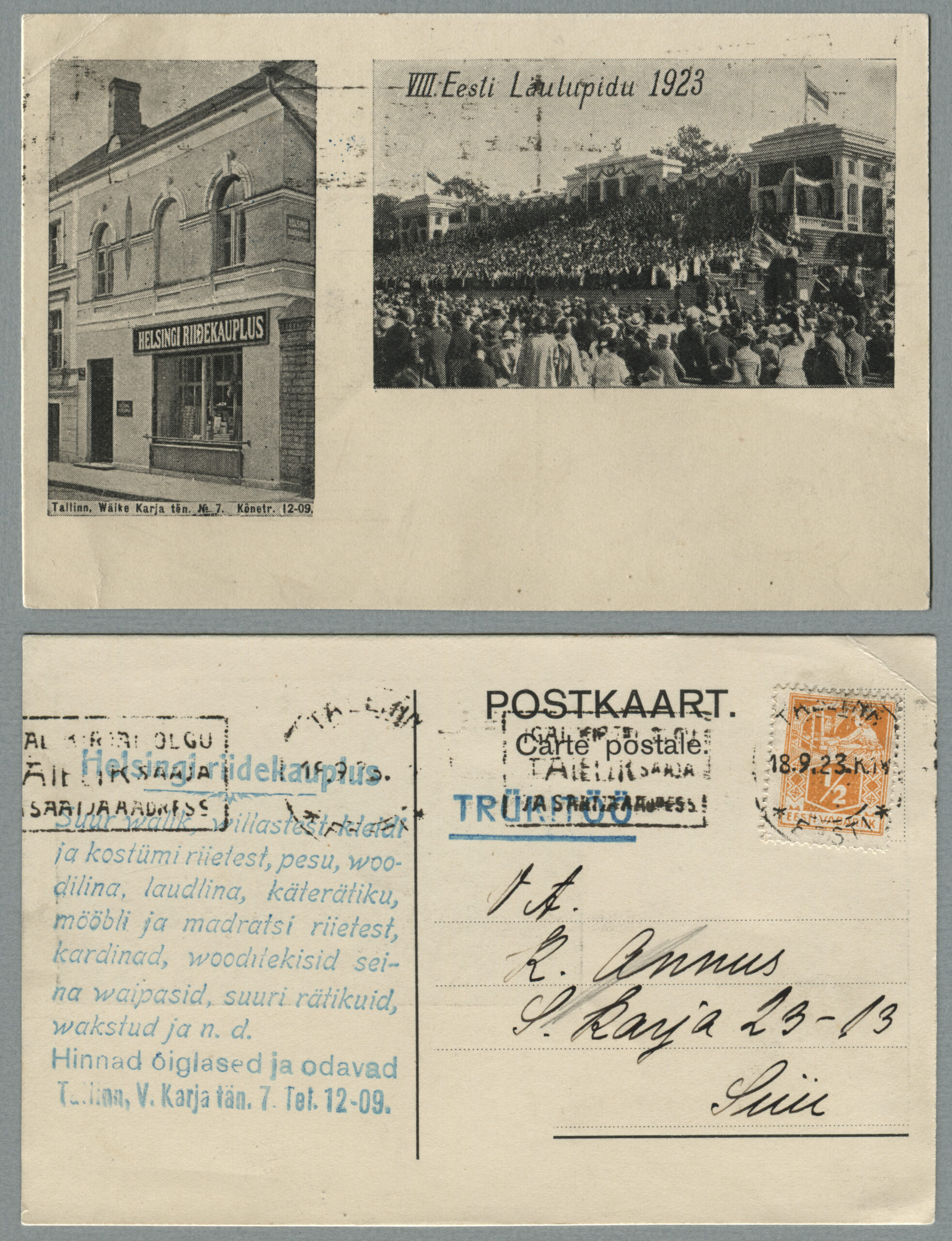 ERMi koguPostkaart, 18. september 1923, kohalik trükitöö. VIII Eesti laulupidu 1923 ja Helsingi riidekauplus Wäike Karja tn, Tallinn