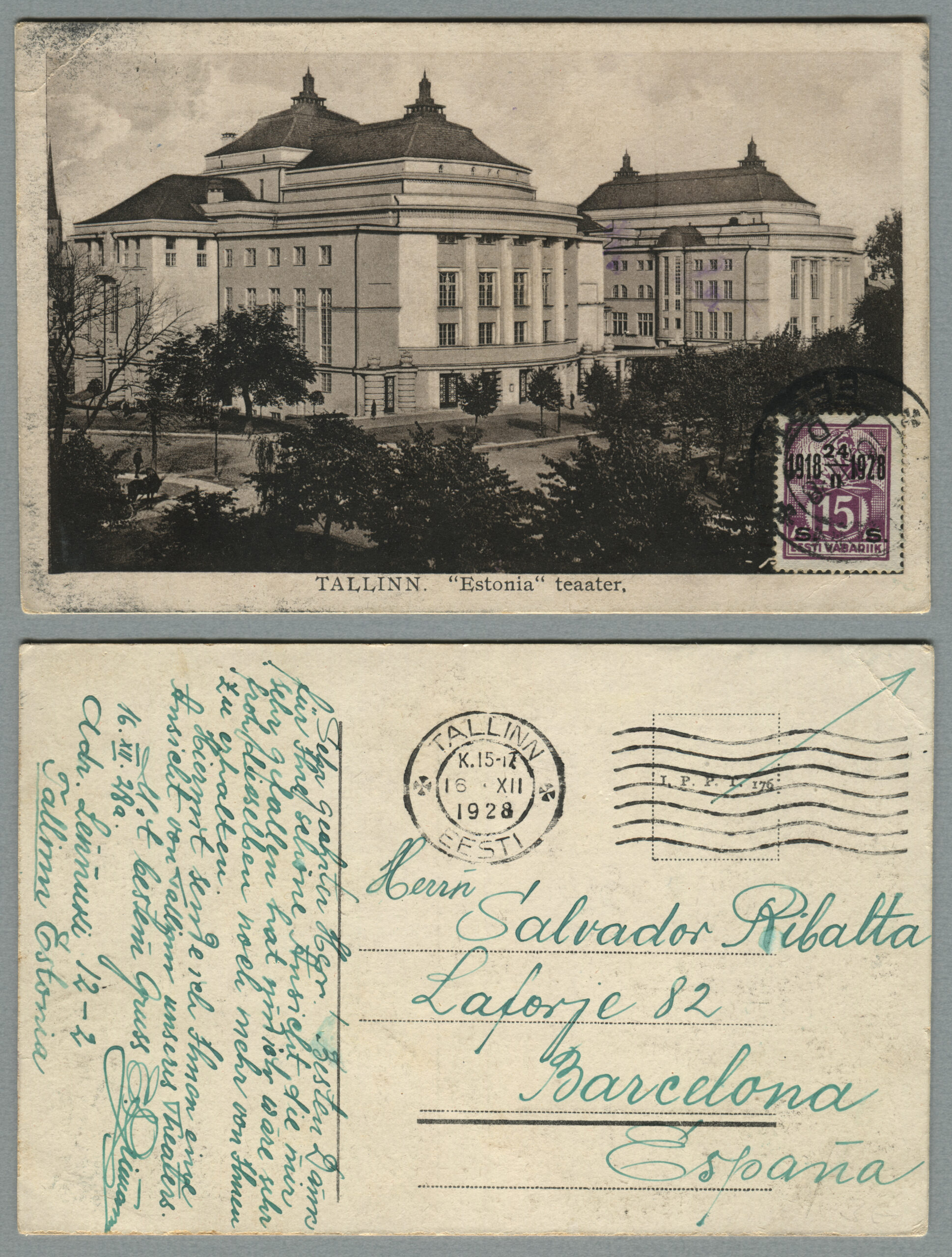 ErakoguPostkaart Tallinnast Barcelonasse, 16. detsember 1928. 15-margast marki esineb kirjal harva. Estonia teater, Tallinn