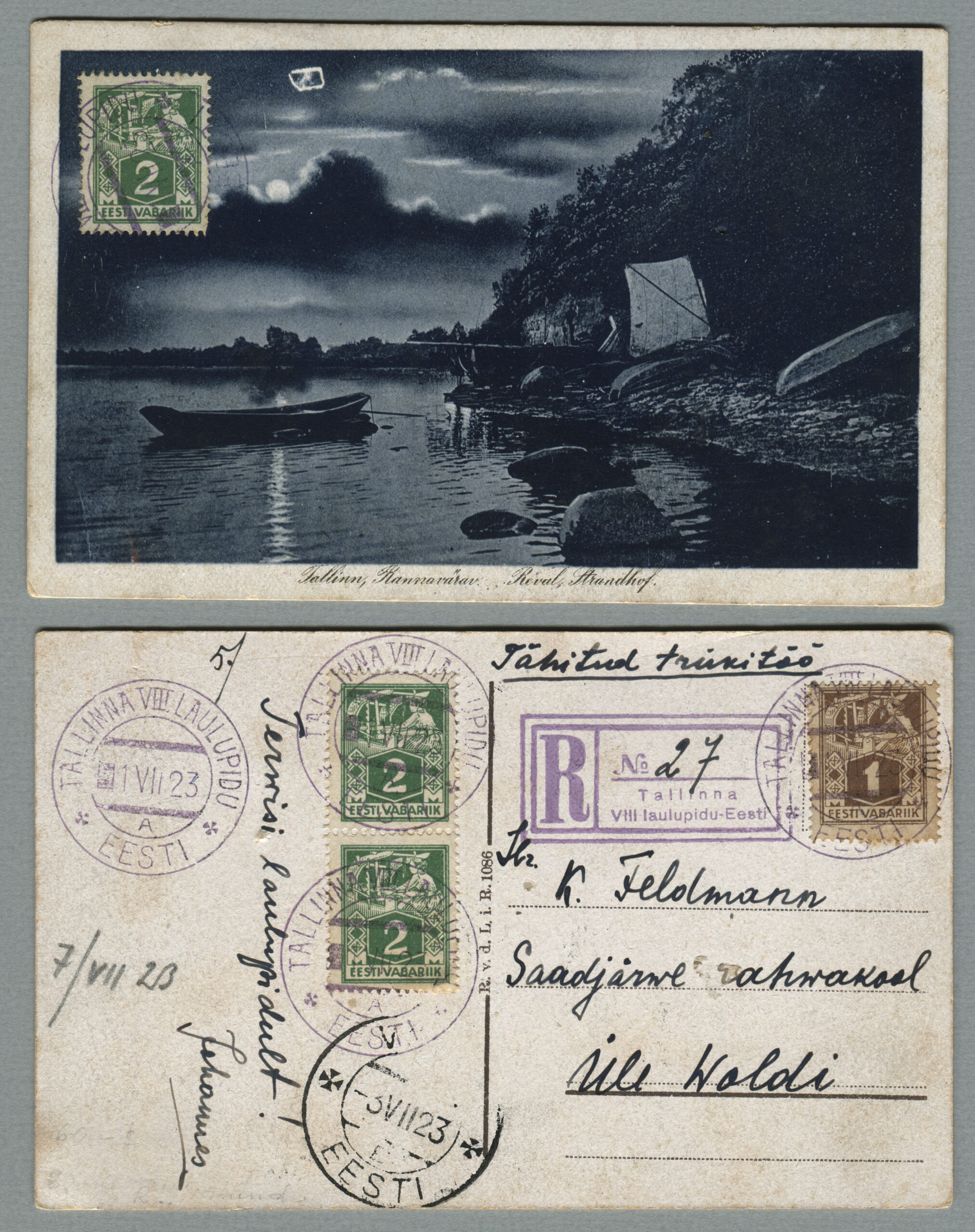 ERMi koguTähitud postkaart Tallinnast Saadjärvele, 11. juuli 1923 R-tempel „Tallinna VIII laulupidu Eesti“ oli kasutusel 30. juunit kuni 2. juulini 1923. Laulupeo R-templiga kirju on säilinud vaid üksikud.