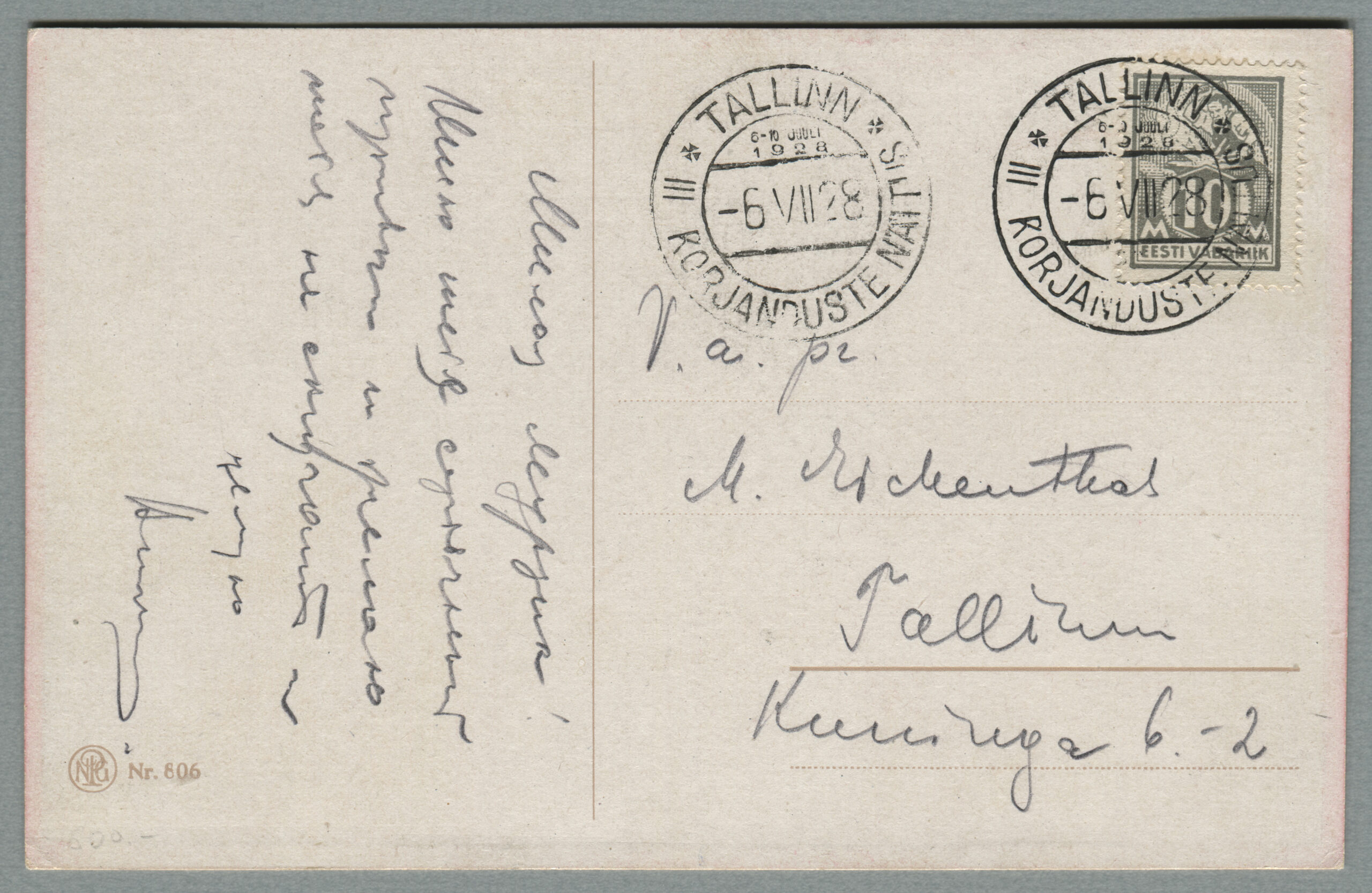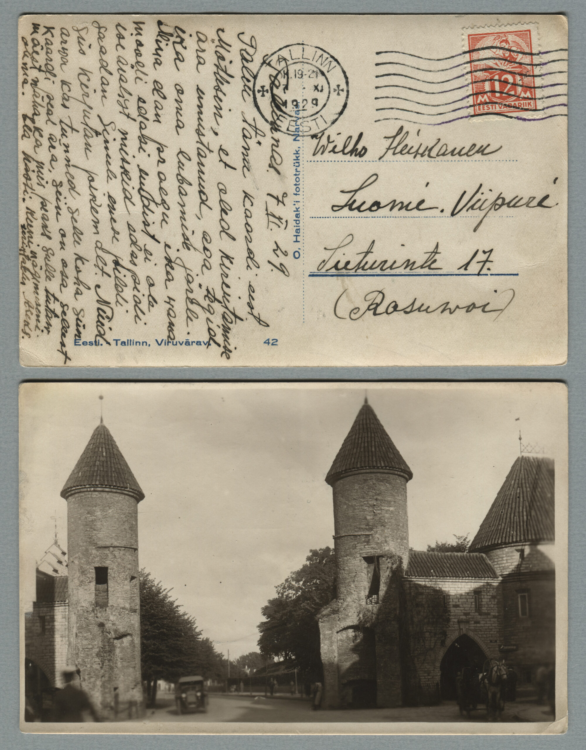 ErakoguPostkaart Tallinnast Viipurisse (Soome), 7. november 1929. Tallinn, Viru värav