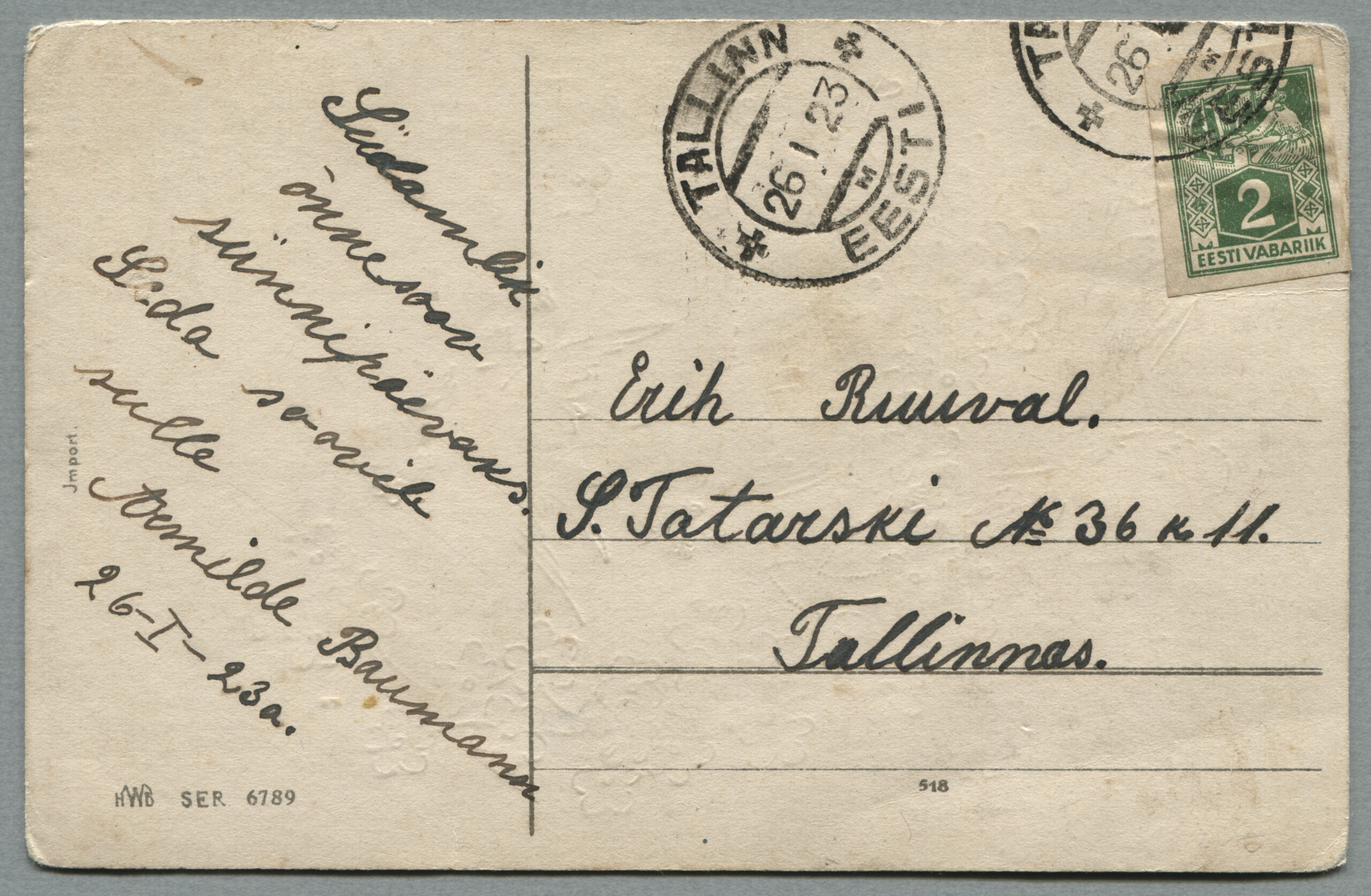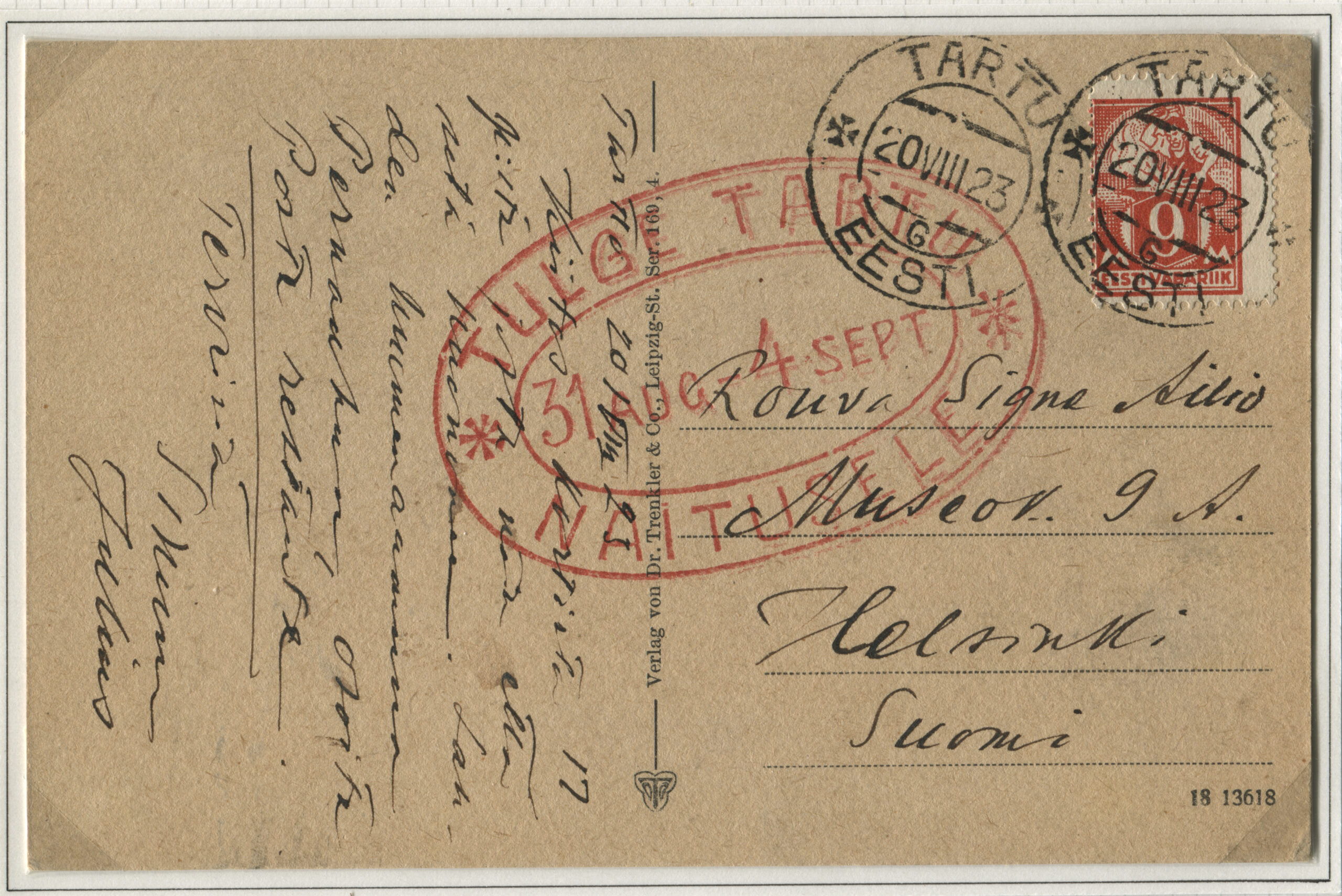 ERMi koguPostkaart Tartust Helsingisse, 20. august 1923