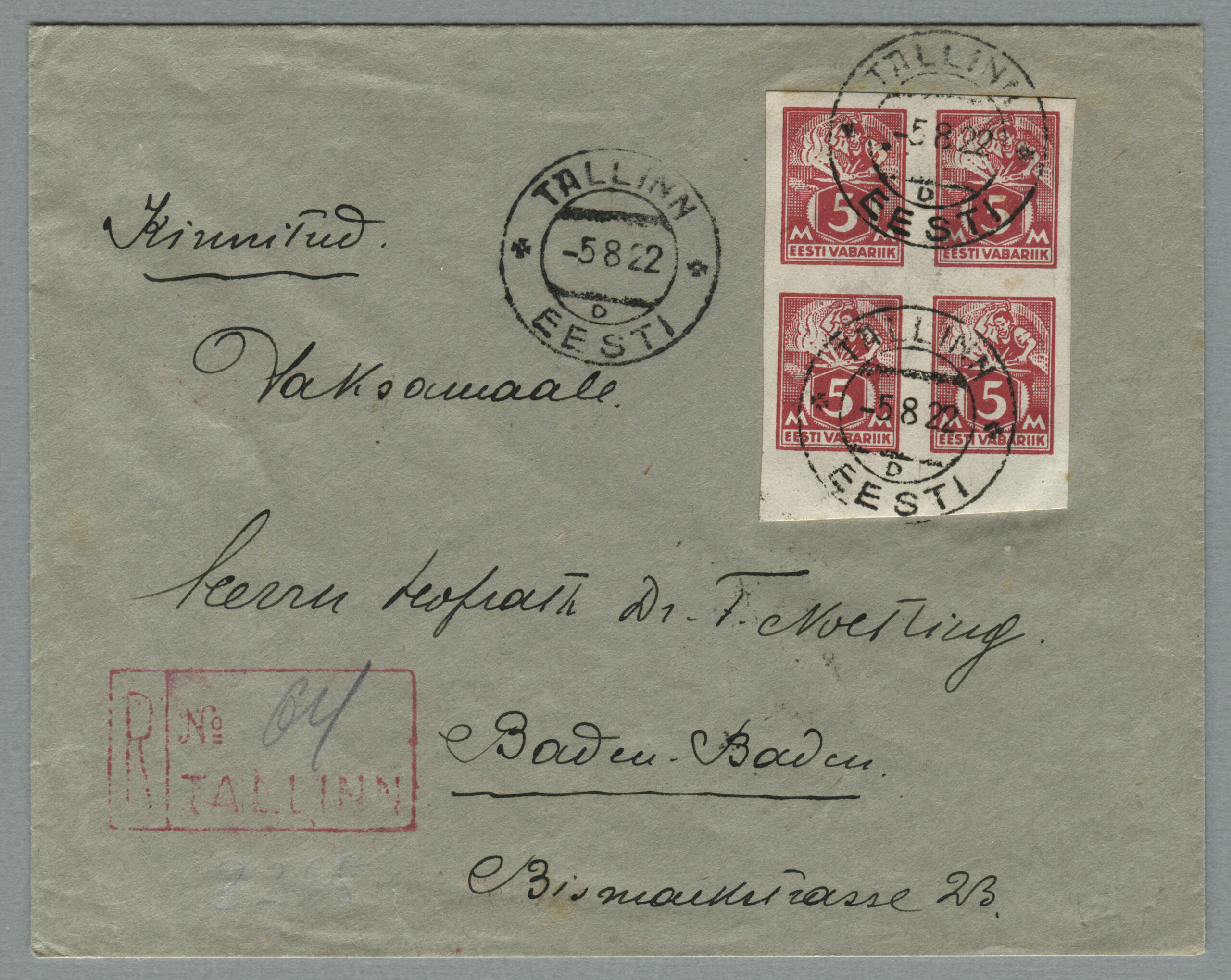 ERMi koguTähitud kiri (R-tempel) Tallinnast Saksamaale, 5. august 1922