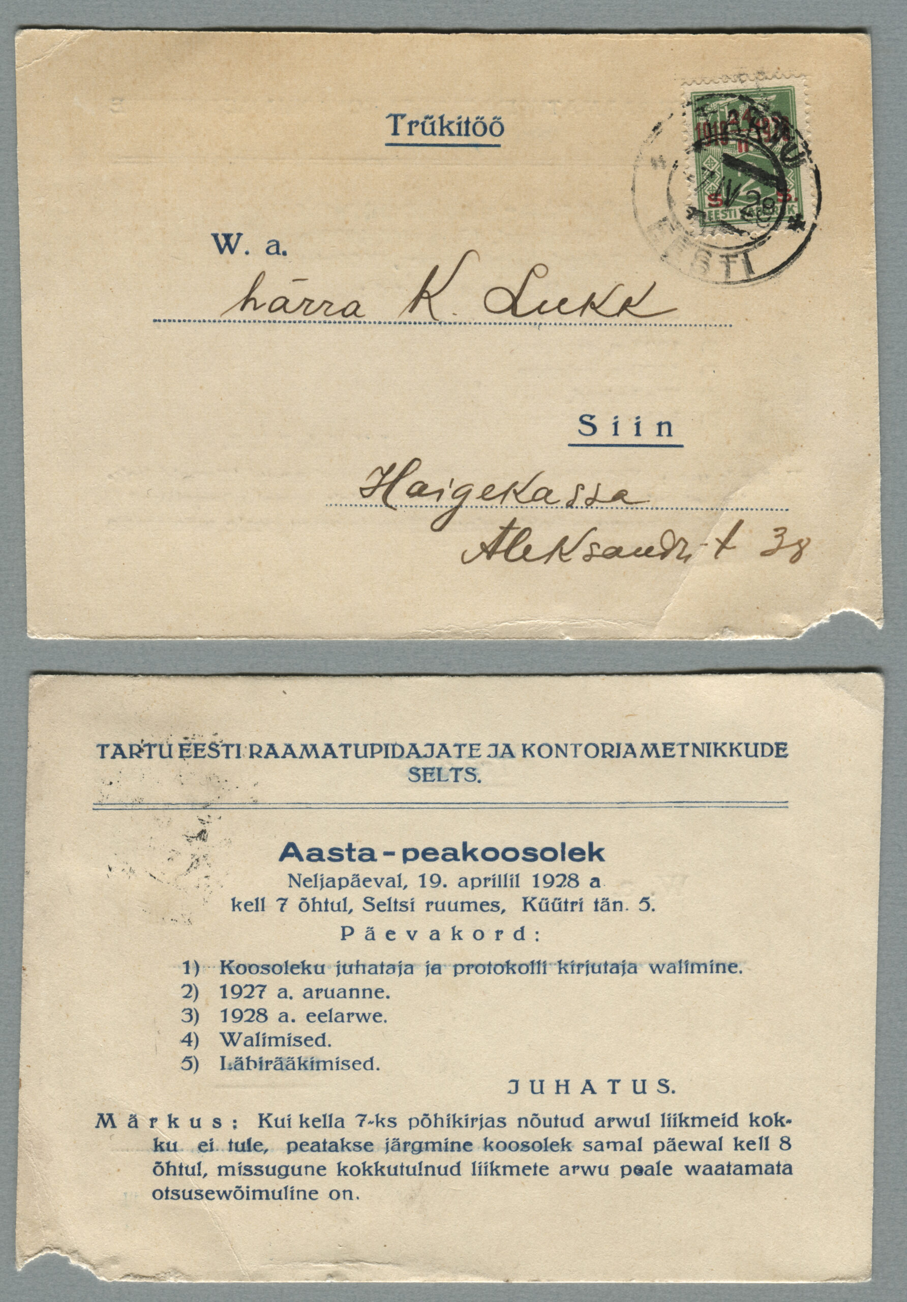 ERMi koguTartu, 7. aprill 1928, kohalik trükitöö kaart