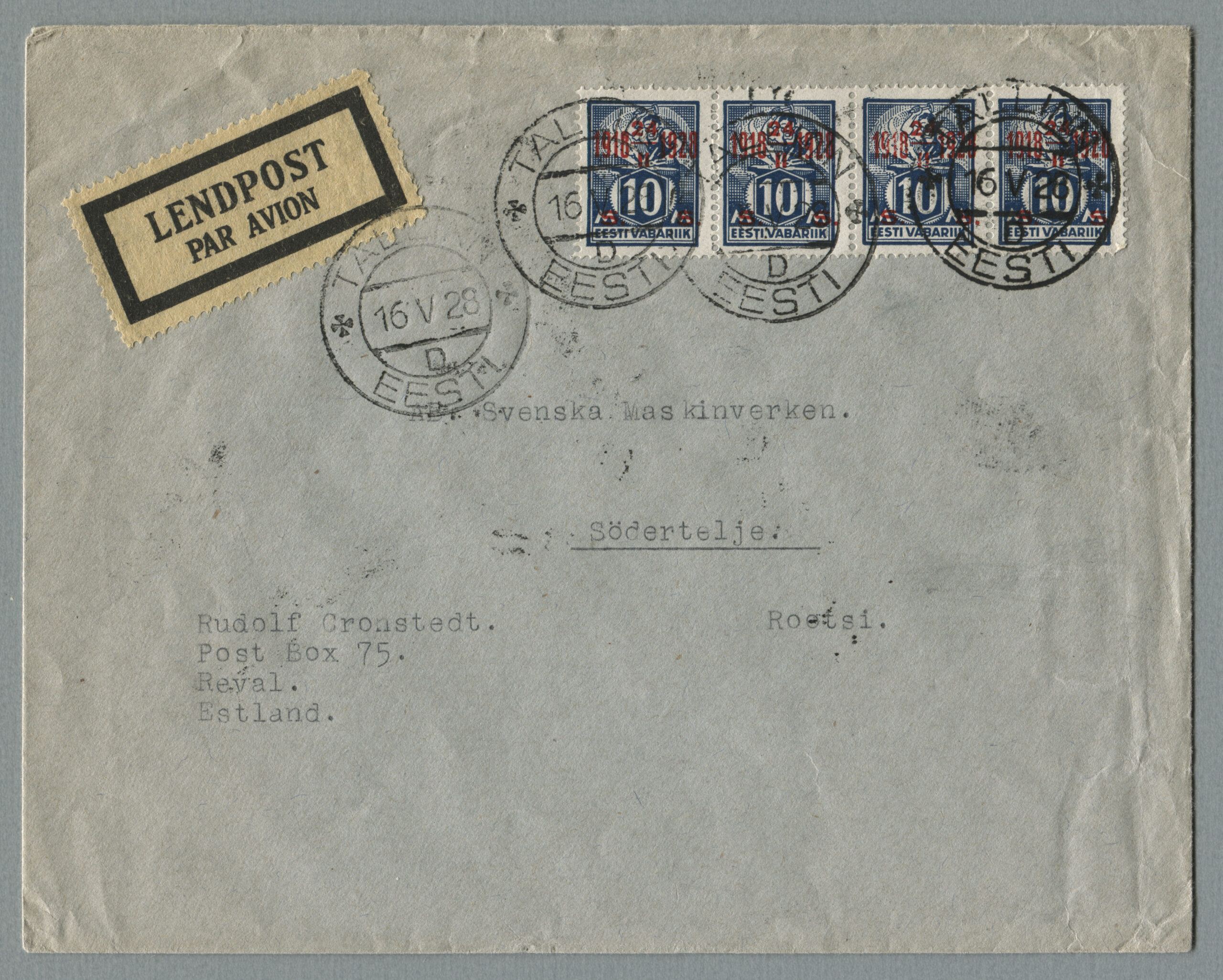 ErakoguÕhupostikiri Tallinnast Södertäljesse (Rootsi), 16. mai 1928