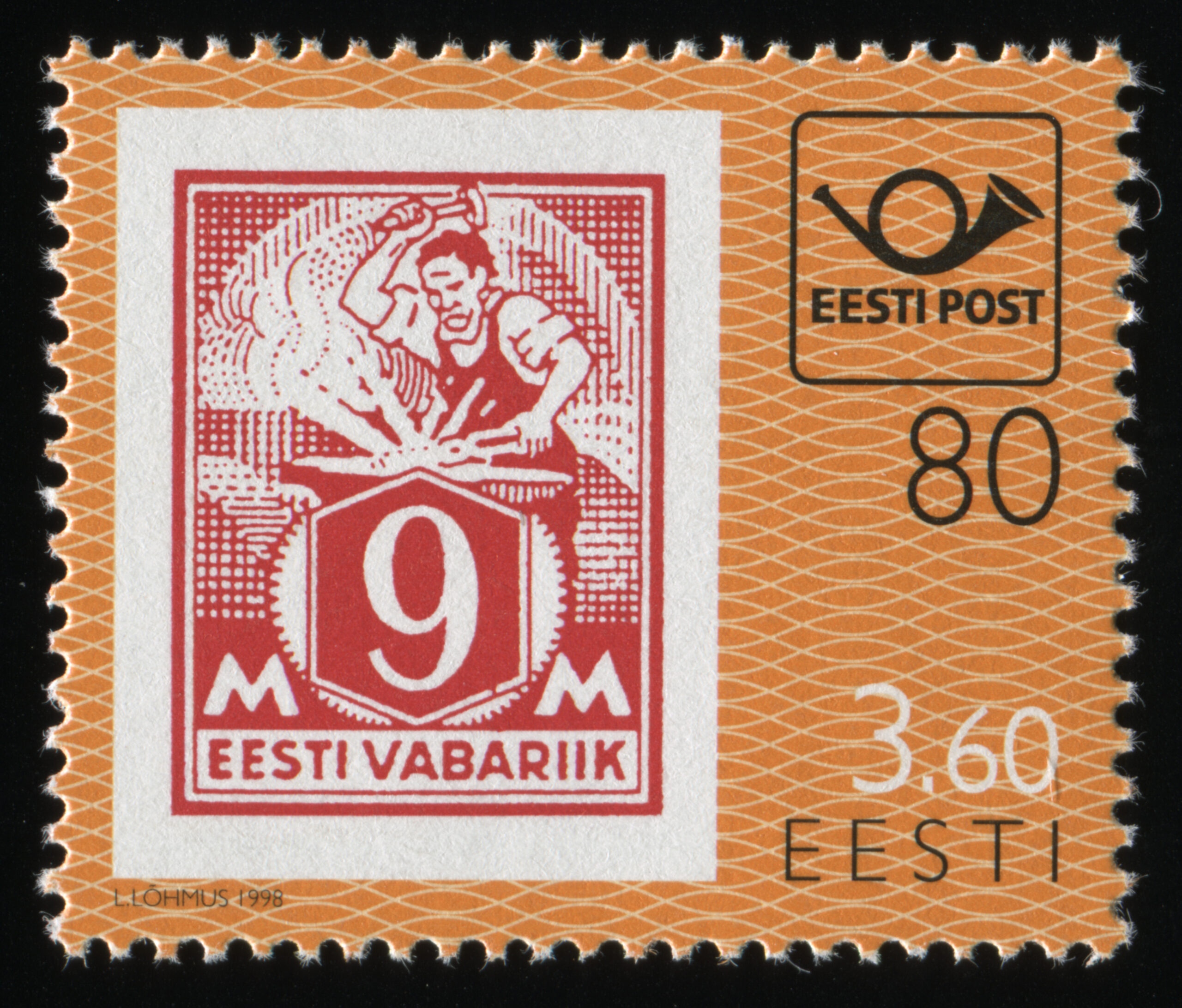 ERMi koguEesti Post 80, 22. oktoober 1998, kunstnik Lembit Lõhmus. Margi kujunduses sepa mark, 18. aprill 1923, 9 m, lõigatud
