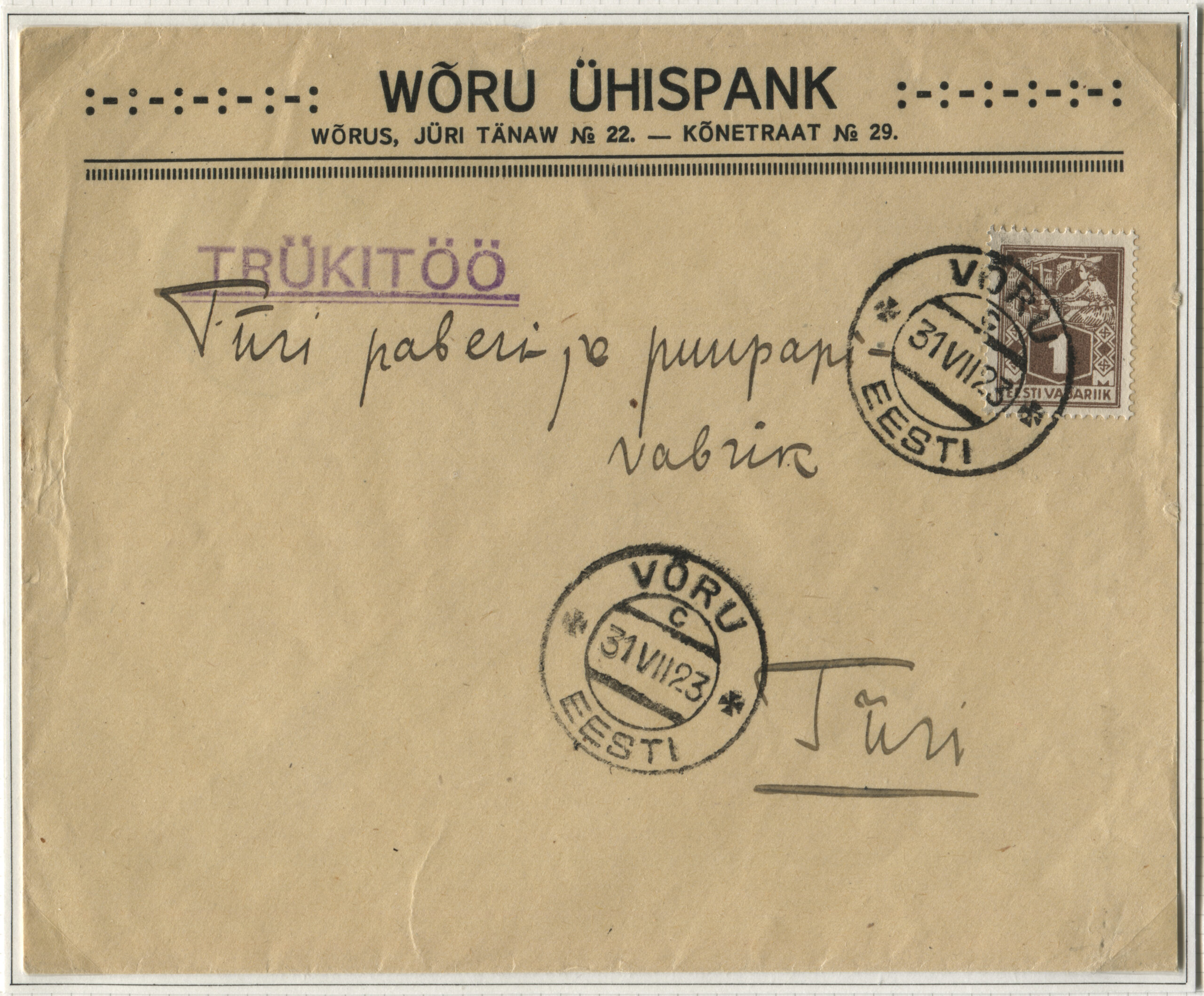 ErakoguTrükitöö kiri Võrust Türile, 31. juuli 1923 – 2. august 1923