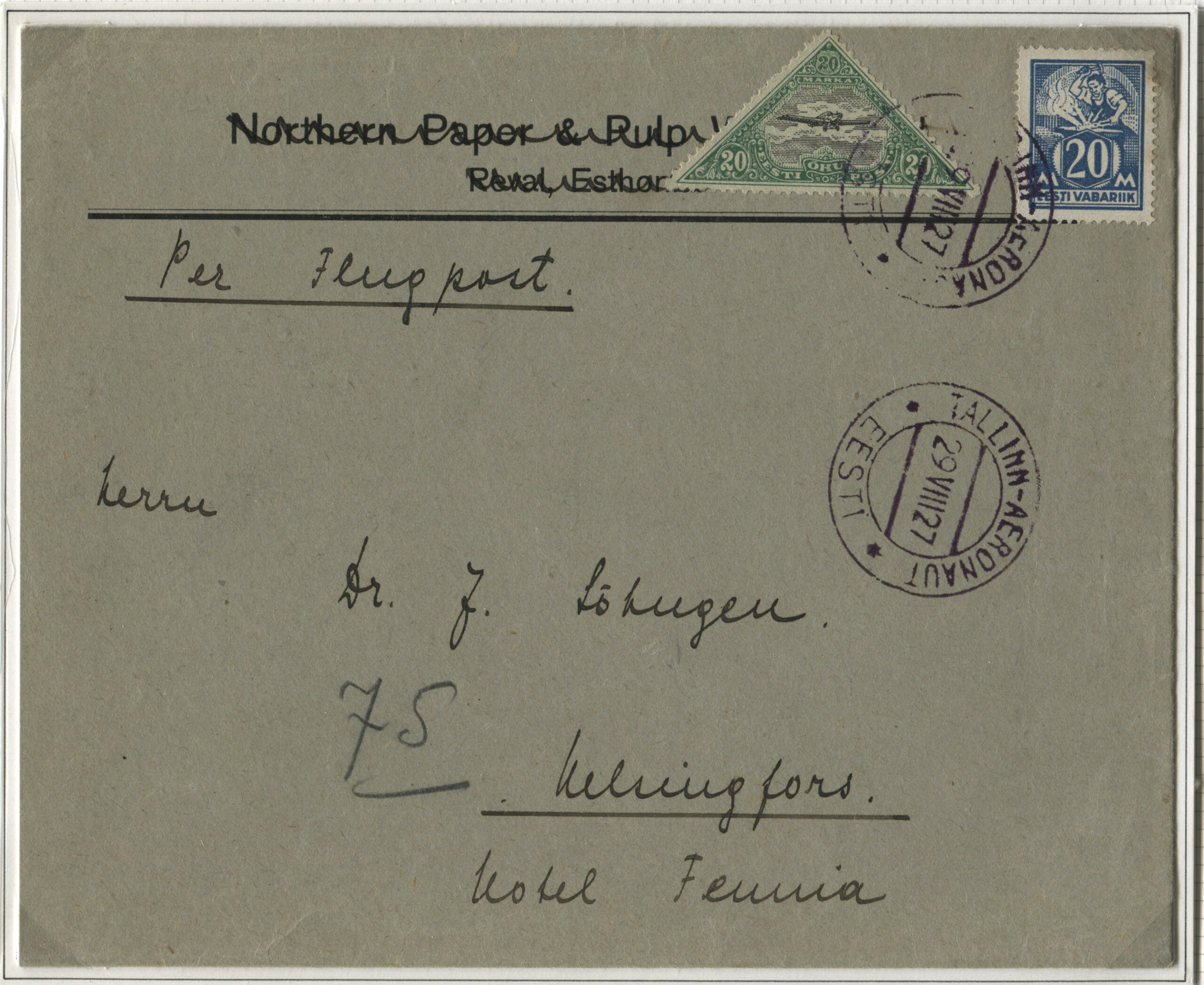 ERMi koguÕhupostikiri Tallinnast Stettinisse (Poola) 14. mai – 15. mai 1927 Berliini kaudu. 45-margast õhupostimarki on kirjadel harva.