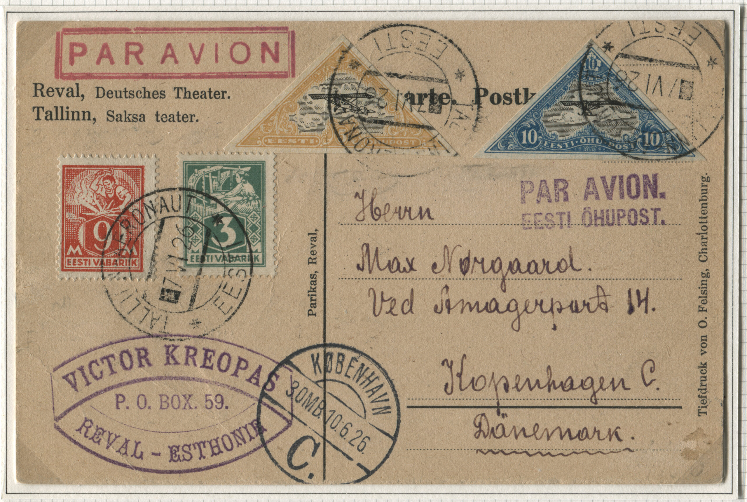 ERMi koguPostkaart õhupostiga Tallinnast Stockholmi kaudu Kopenhaagenisse, 7. juuni – 10. juuni 1926