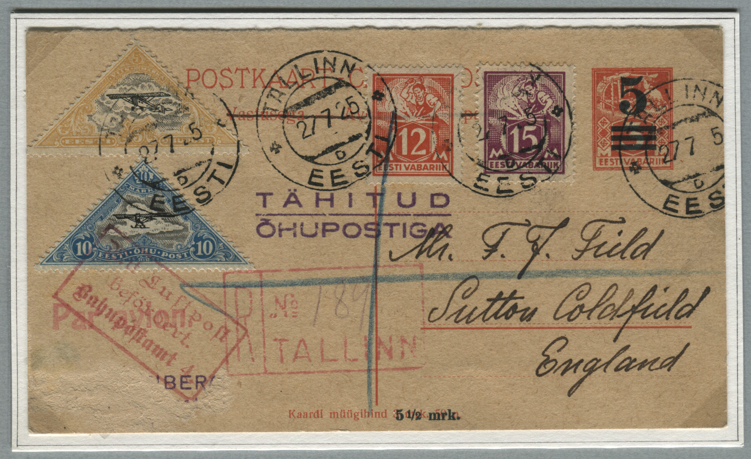 ERMi koguTähitud postkaart õhupostiga Tallinnast Suttonisse (Inglismaa), 27. juuli 1925