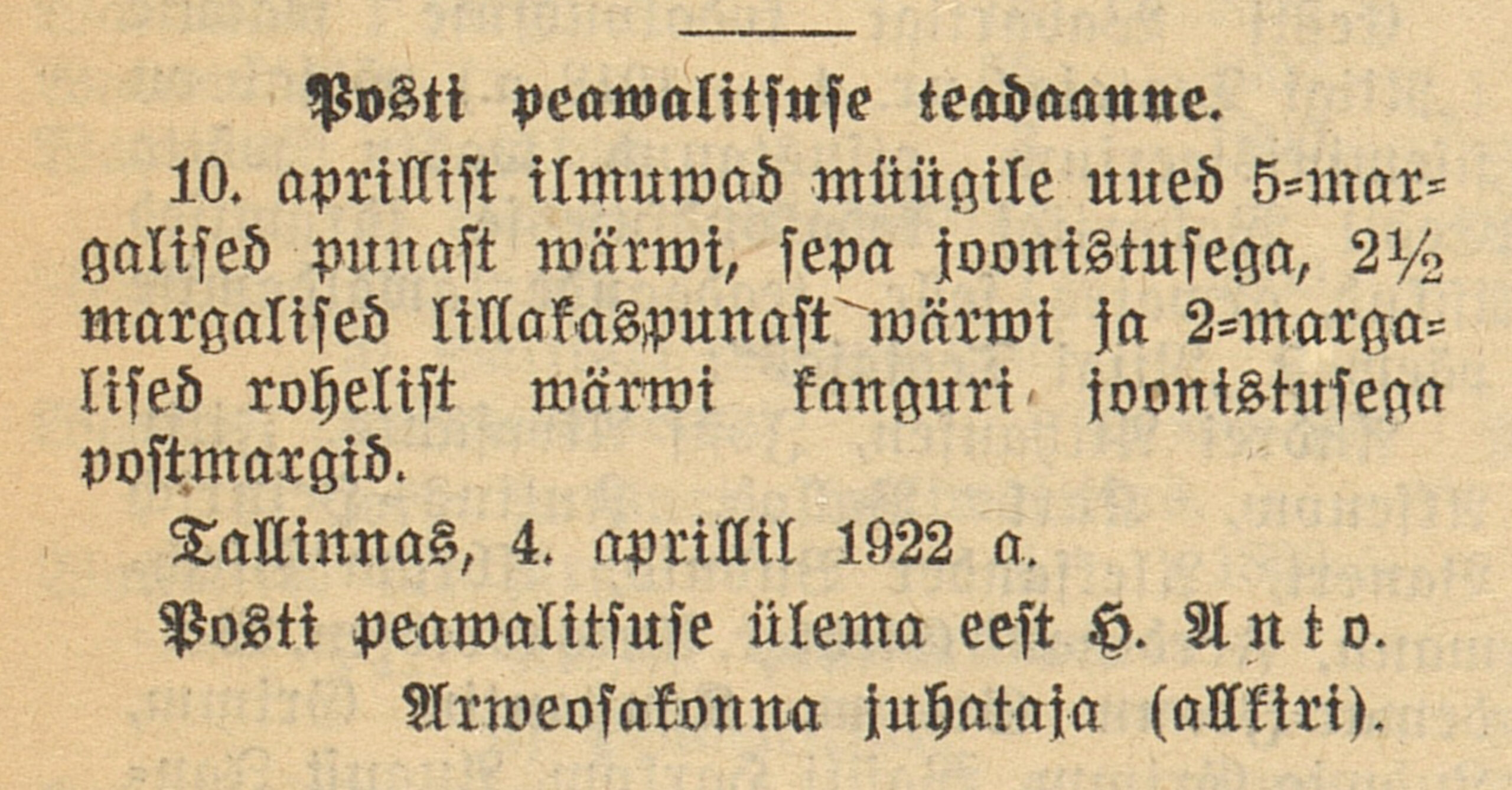 Eestis võeti 1.01.1928 marga asemel kasutusele kroon, nii tehti ühele „Kangru“ ja neljale „Sepa“ margile nominaali ületrükk: marga (m) asemel sent (s).